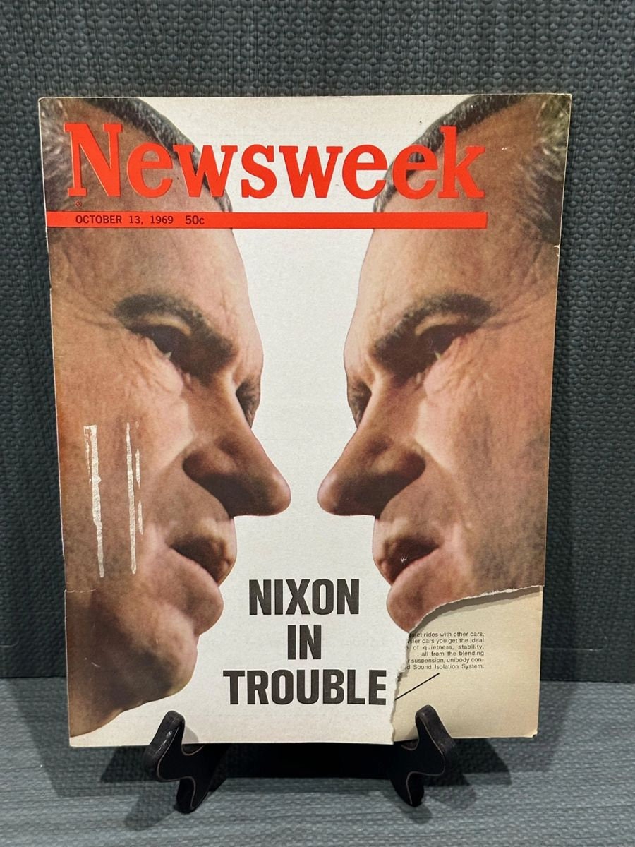 This vintage Newsweek magazine, dated October 13, 1969, features the iconic "Nixon in Trouble" cover, capturing a crucial moment in President Richard Nixon’s presidency. The striking double-profile image of Nixon symbolizes the political tensions and scrutiny he faced during this era. A must-have for political history collectors, vintage magazine enthusiasts, and those fascinated by historical journalism.