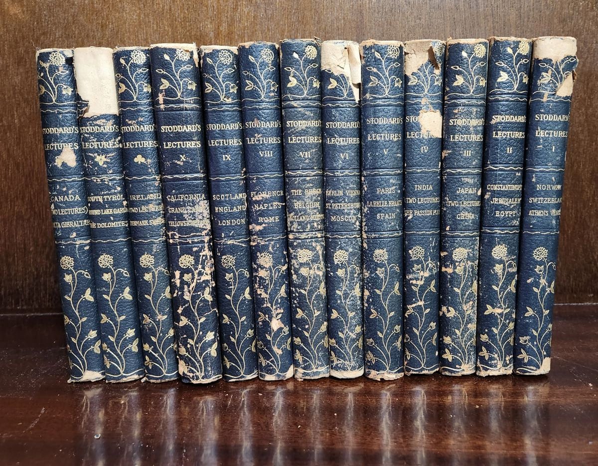Key Features: 📖 Edition: Complete 12-volume set of John L. Stoddard’s Lectures (1898) 📚 Binding: Beautifully embossed blue and gold hardcovers with intricate floral designs 🌍 Topics: Travel & exploration across Europe, Asia, and beyond 📜 Condition: Antique charm with signs of wear on covers; pages remain intact and well-preserved