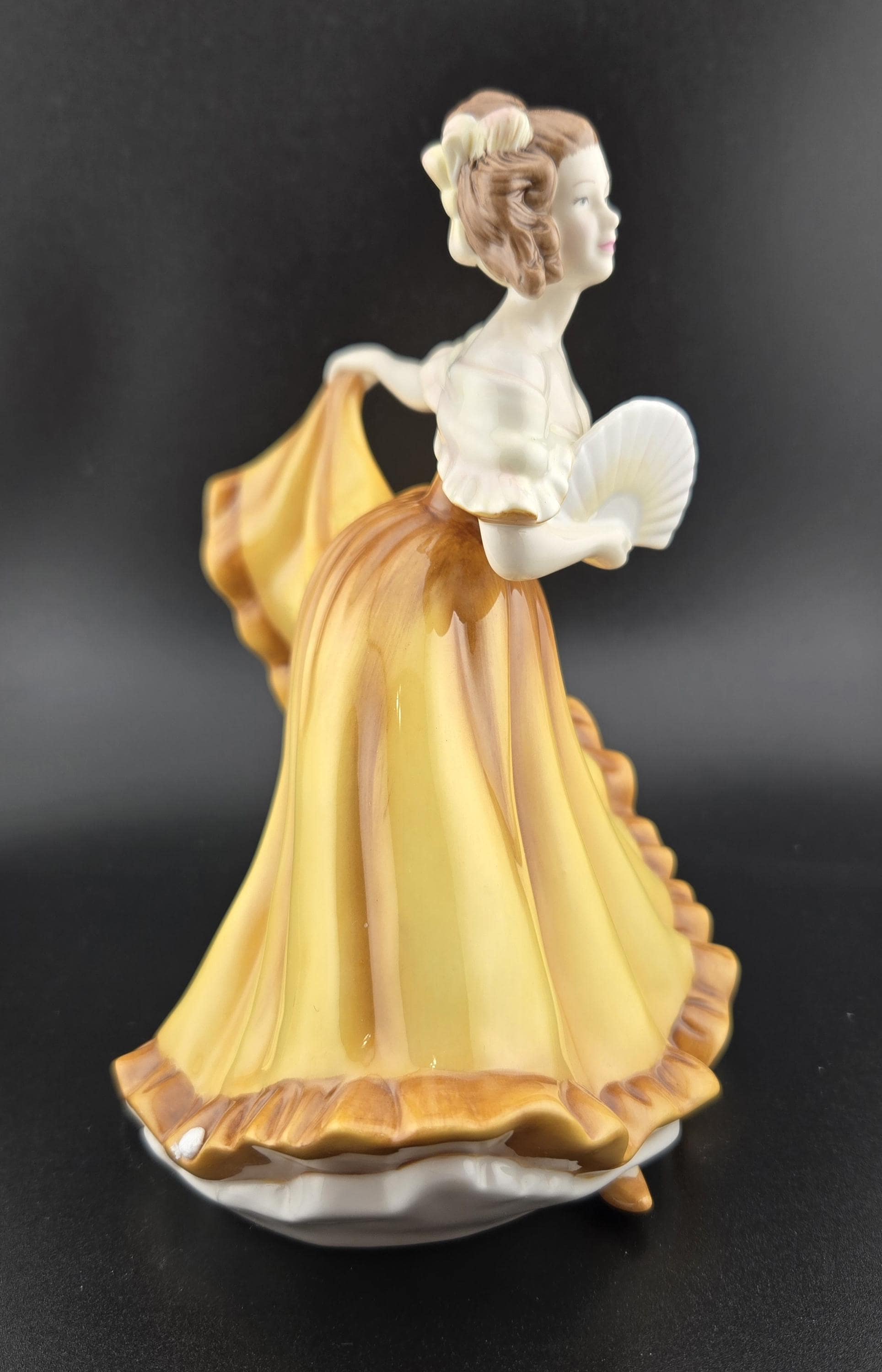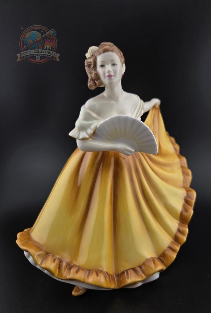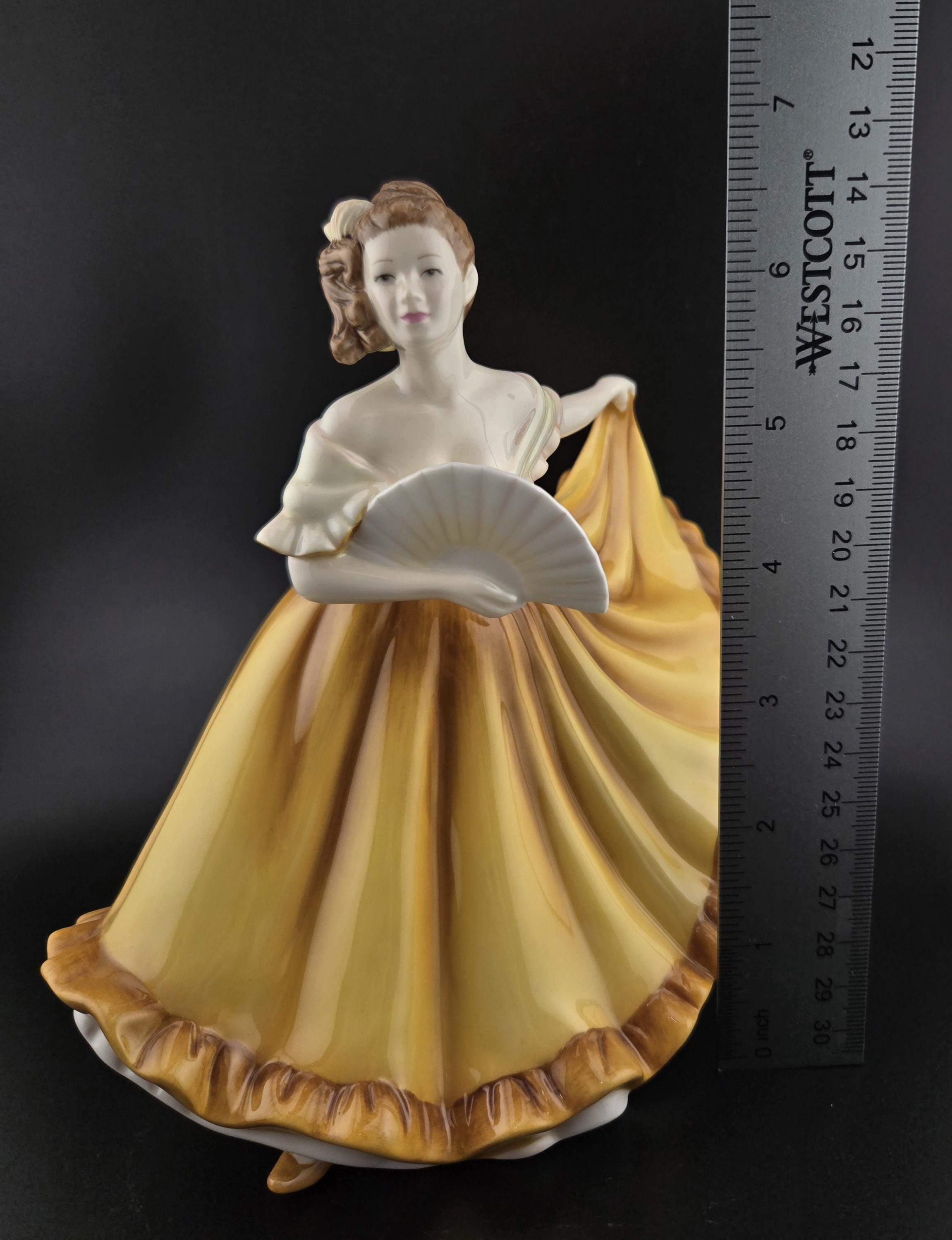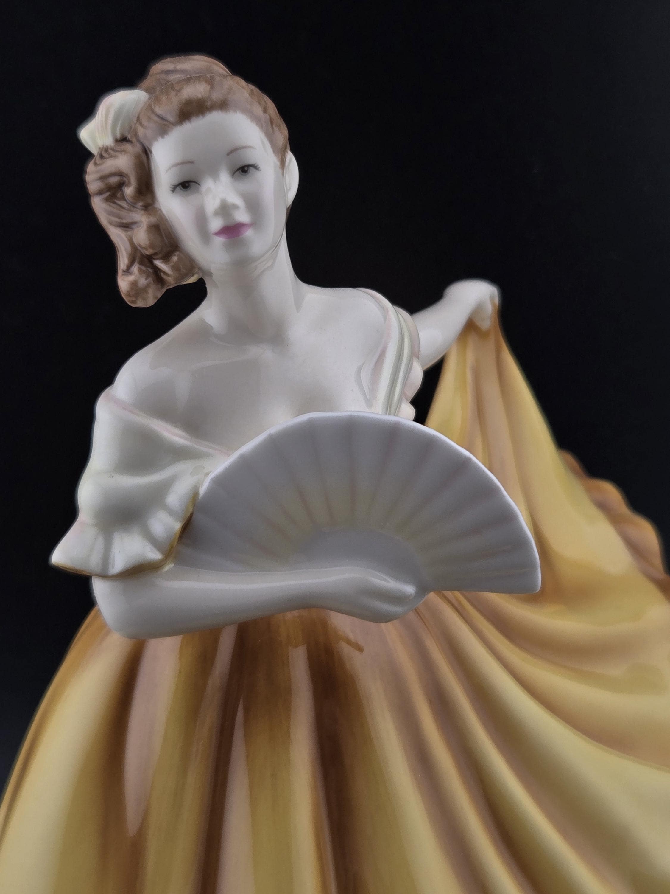 Madison is depicted in a stunning golden-yellow gown with brown accents, gracefully holding a delicate white fan. The flowing drapery and soft pastel tones of her dress capture movement and refinement, making this piece a captivating addition to any collection. Her meticulously sculpted facial expression, adorned hair, and classic pose embody the essence of Royal Doulton artistry.