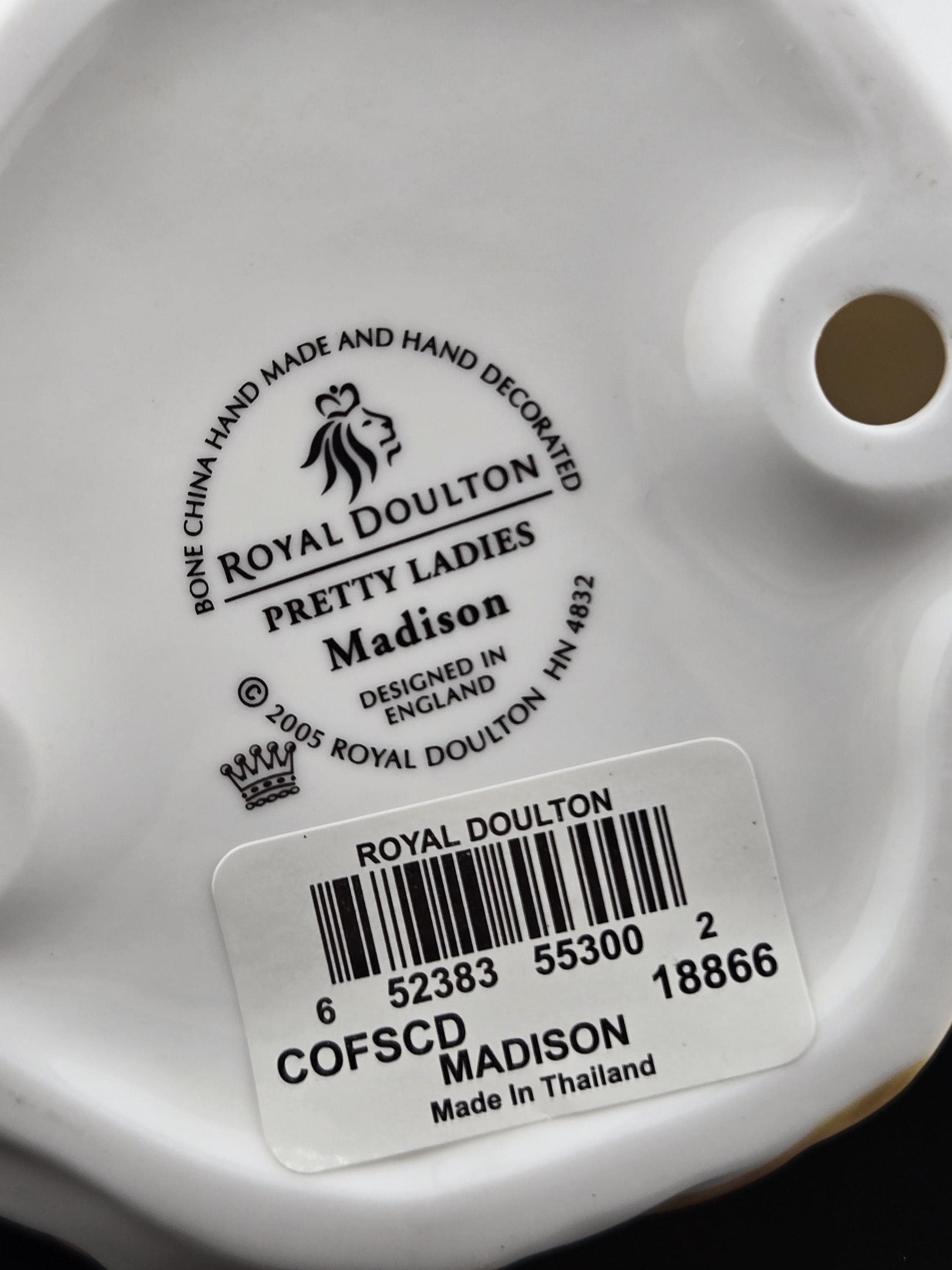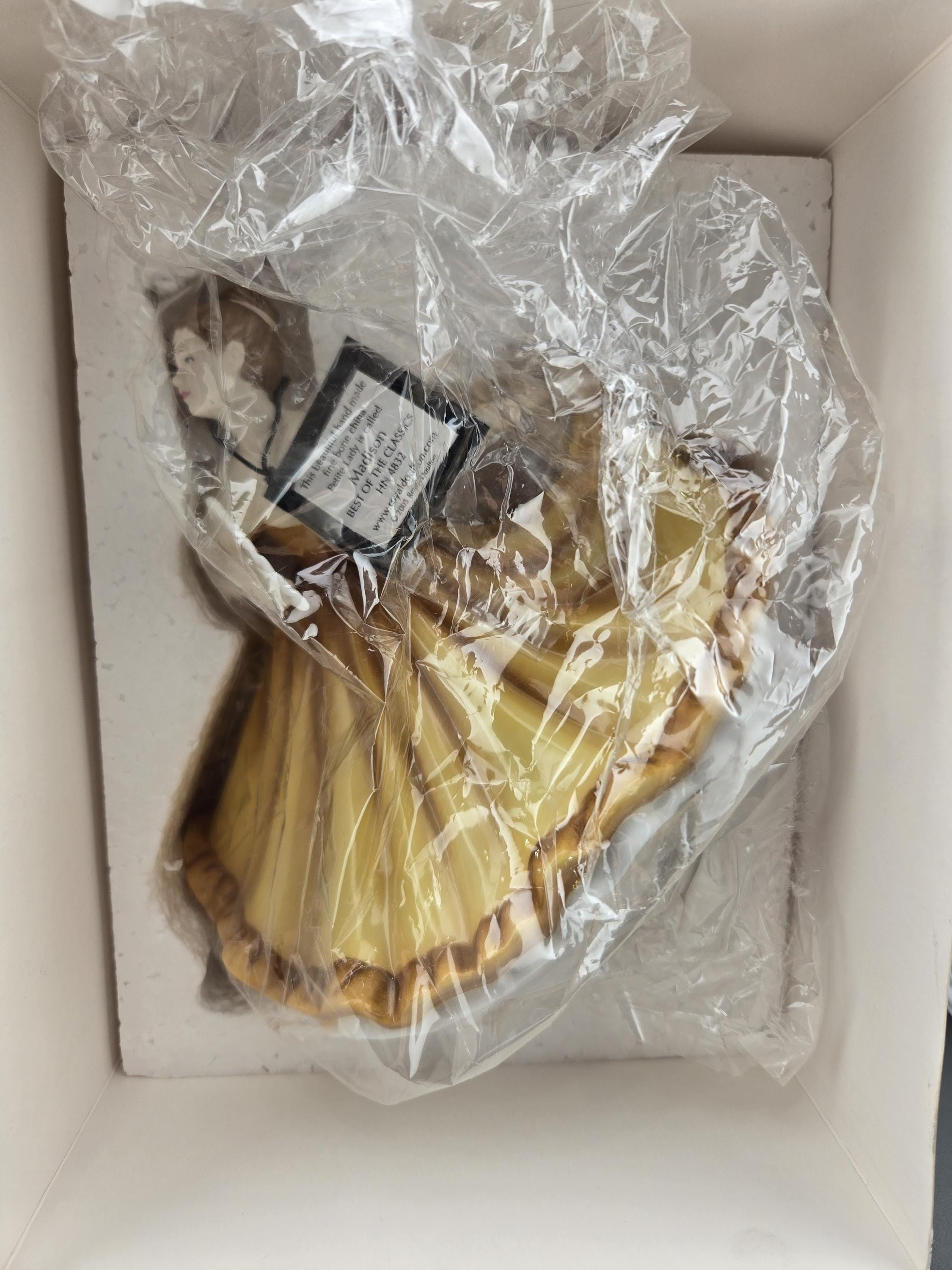 Key Features: Brand: Royal Doulton Collection: Pretty Ladies Name: Madison Model Number: HN 4832 Material: Fine Bone China Color: Golden-yellow dress with brown detailing Height: Approx. 7 inches Design Year: 2005 Handmade & Hand-Painted: Yes Condition: Excellent, in original packaging