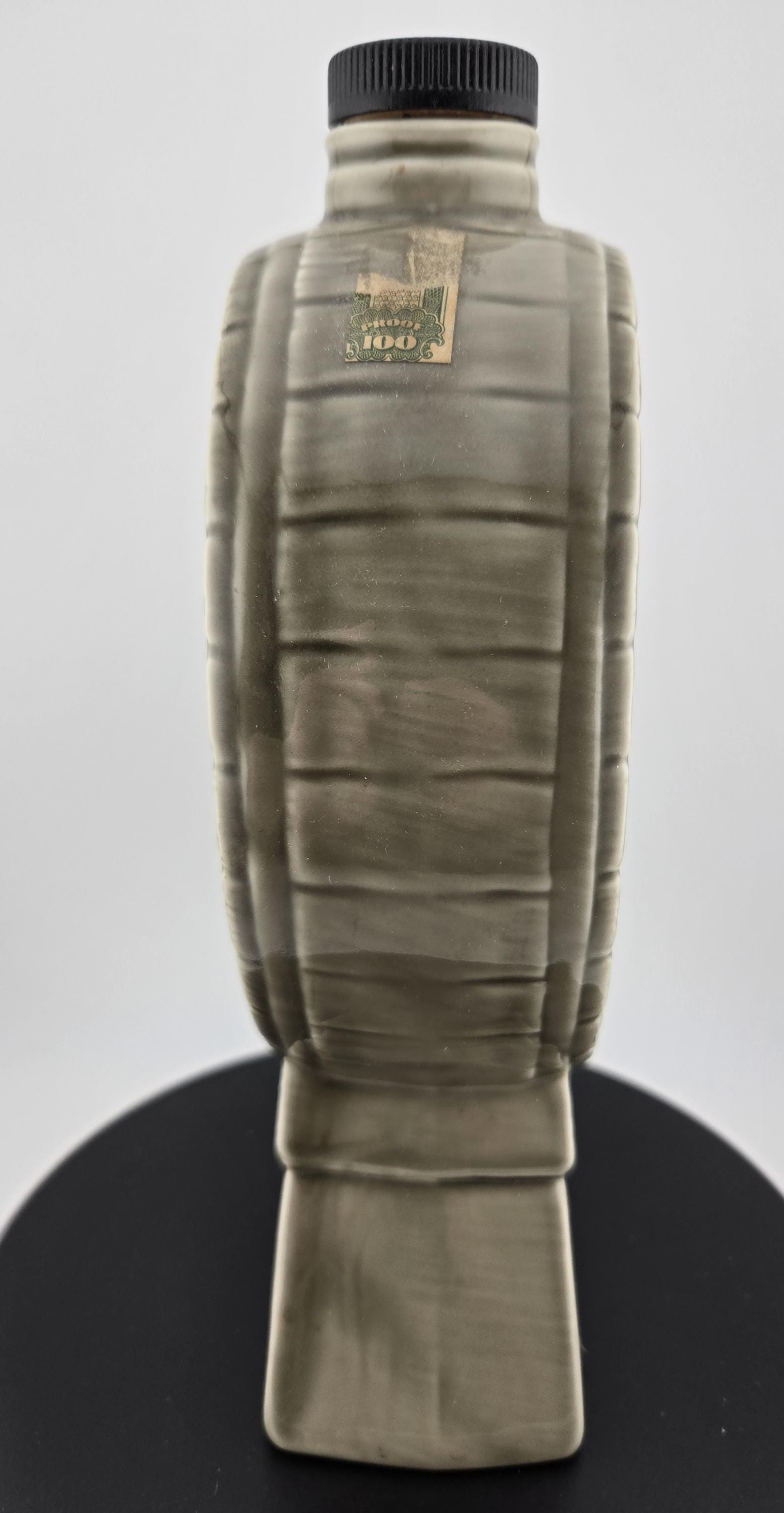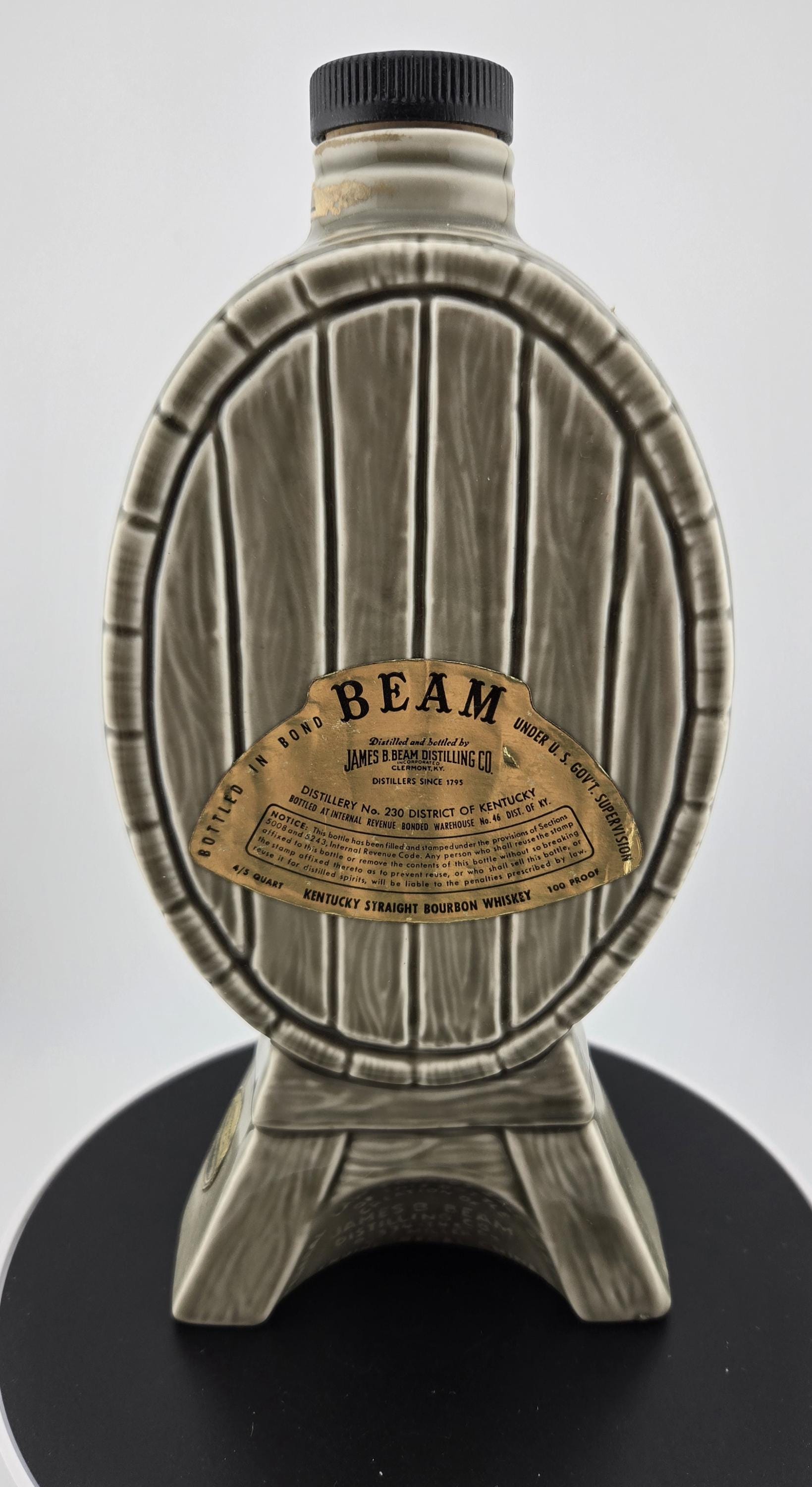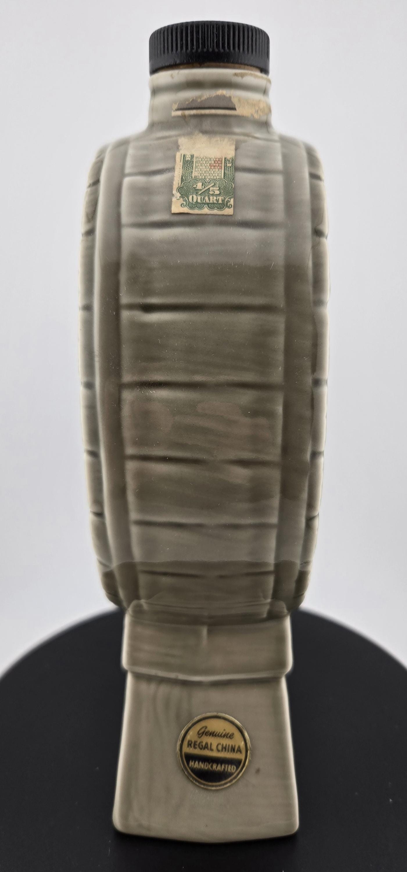 Made of Genuine Regal China, this decanter was produced for the James B. Beam Distilling Co. and still retains its original federal tax strip and labels, including the "Since 1795" base plaque. It held Kentucky Straight Bourbon Whiskey, marked 4/5 quart and 100 proof, and was bottled in bond under U.S. government supervision.