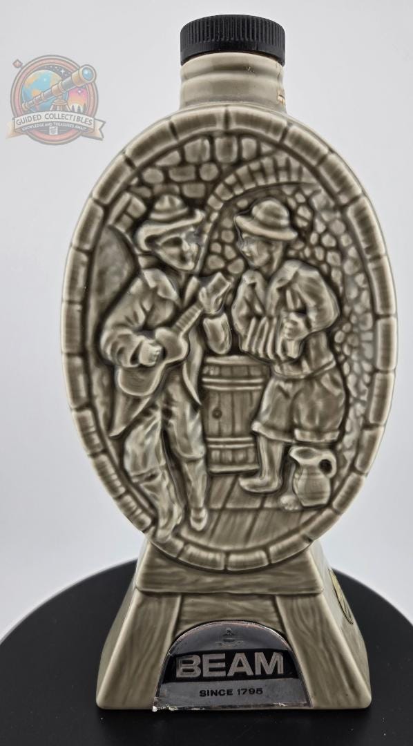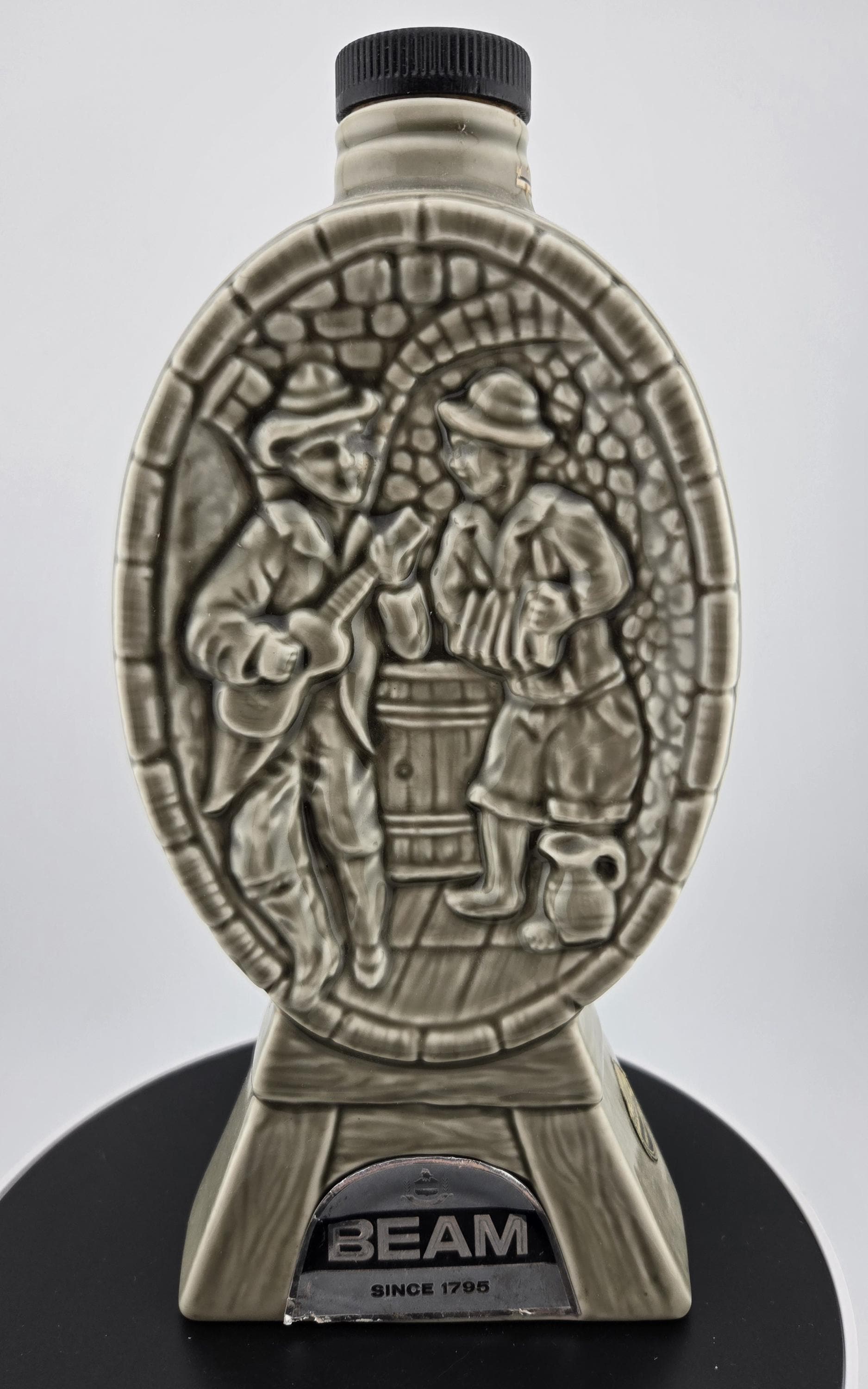 Step back in time with this vintage Jim Beam Regal China decanter, crafted in the USA and standing approximately 9.25 inches tall. This handcrafted decanter features a richly embossed German tavern scene, depicting two cheerful musicians enjoying a drink, surrounded by stonework detailing. It's a striking homage to old-world craftsmanship and mid-century barware.