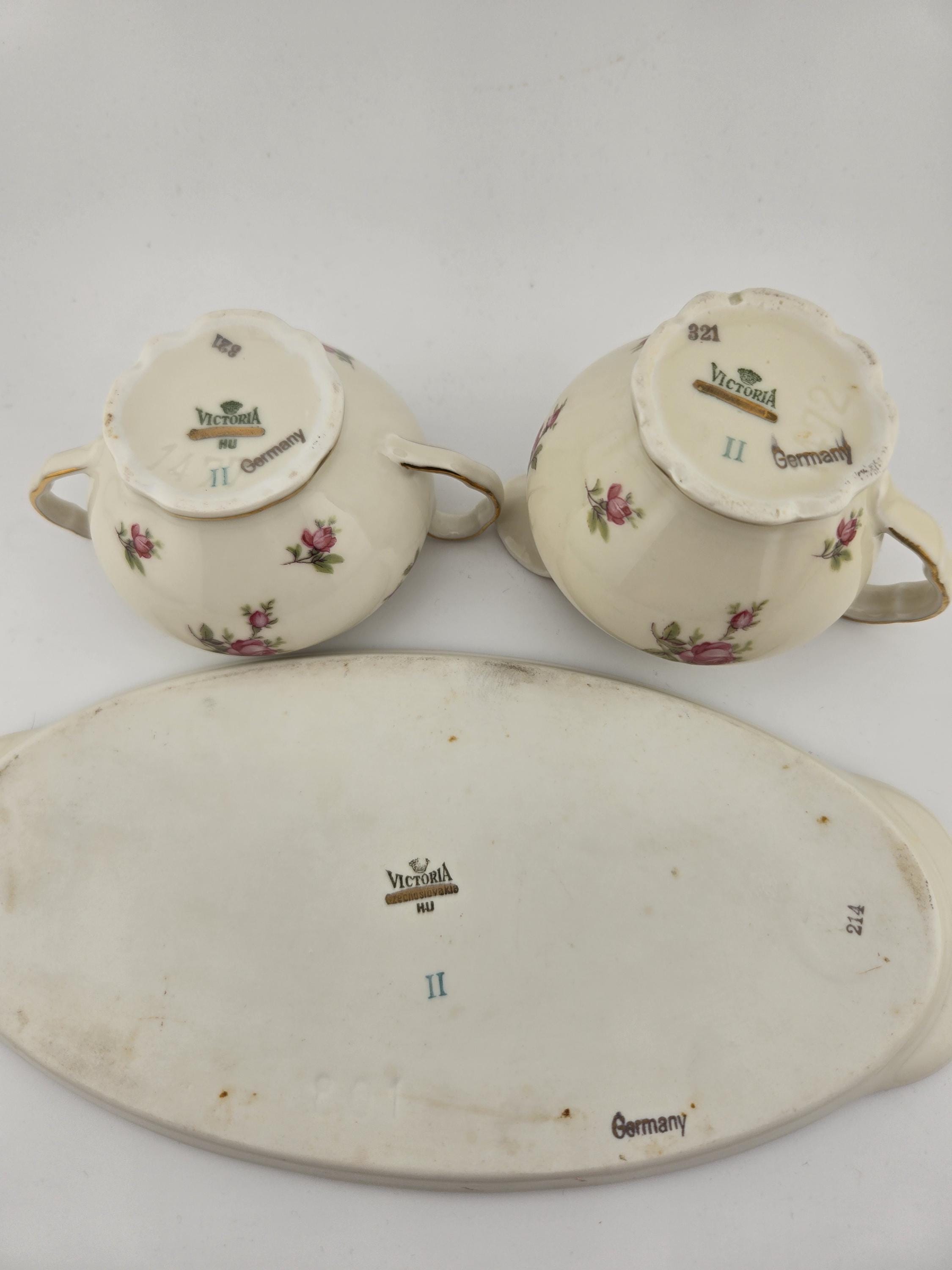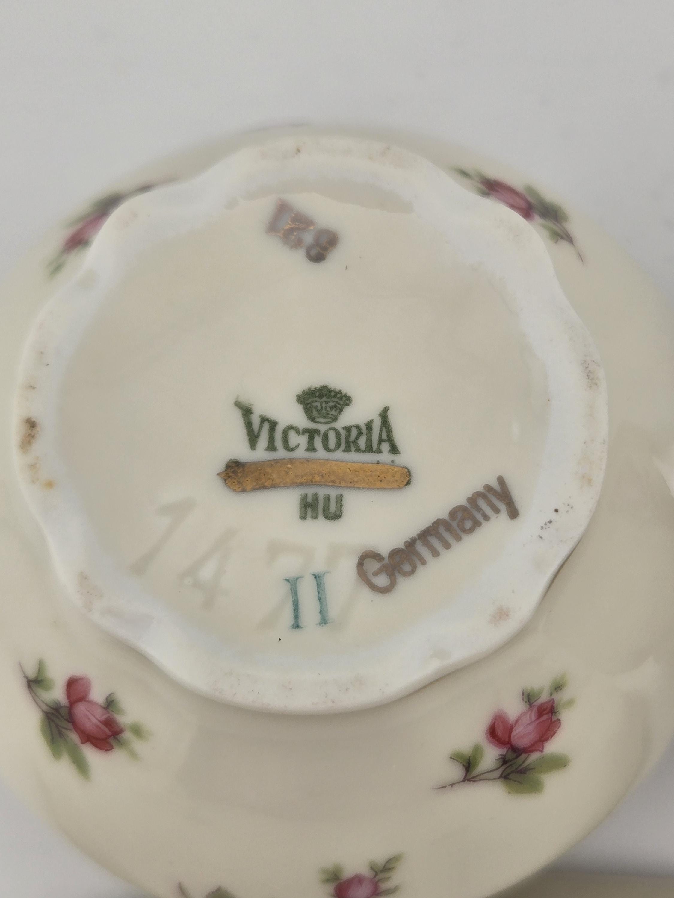 The set bears the hallmark “Victoria Czechoslovakia HU” and “Germany,” indicating production by the Victoria Porcelain Factory of Altrohlau (Bohemia) during the early-to-mid 20th century — a period when exports often carried dual country marks due to shifting regional borders and trade requirements.