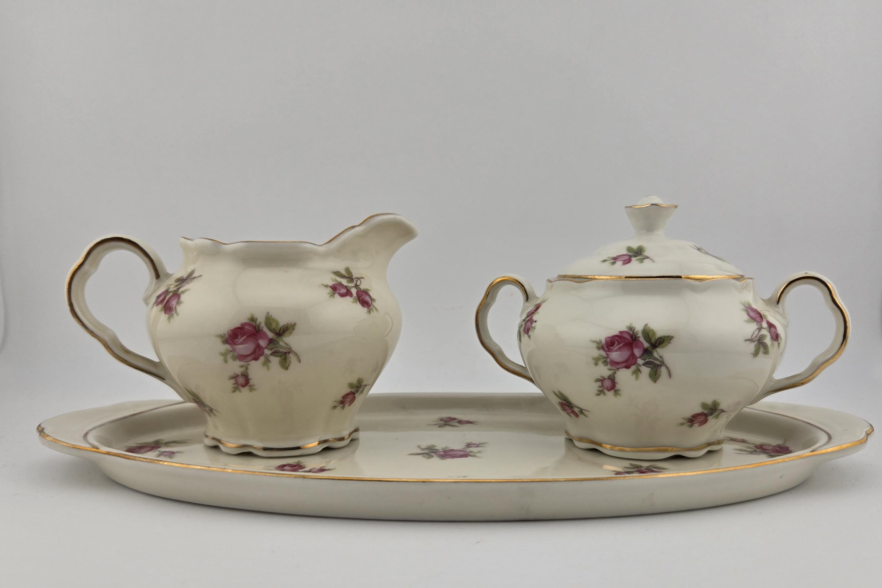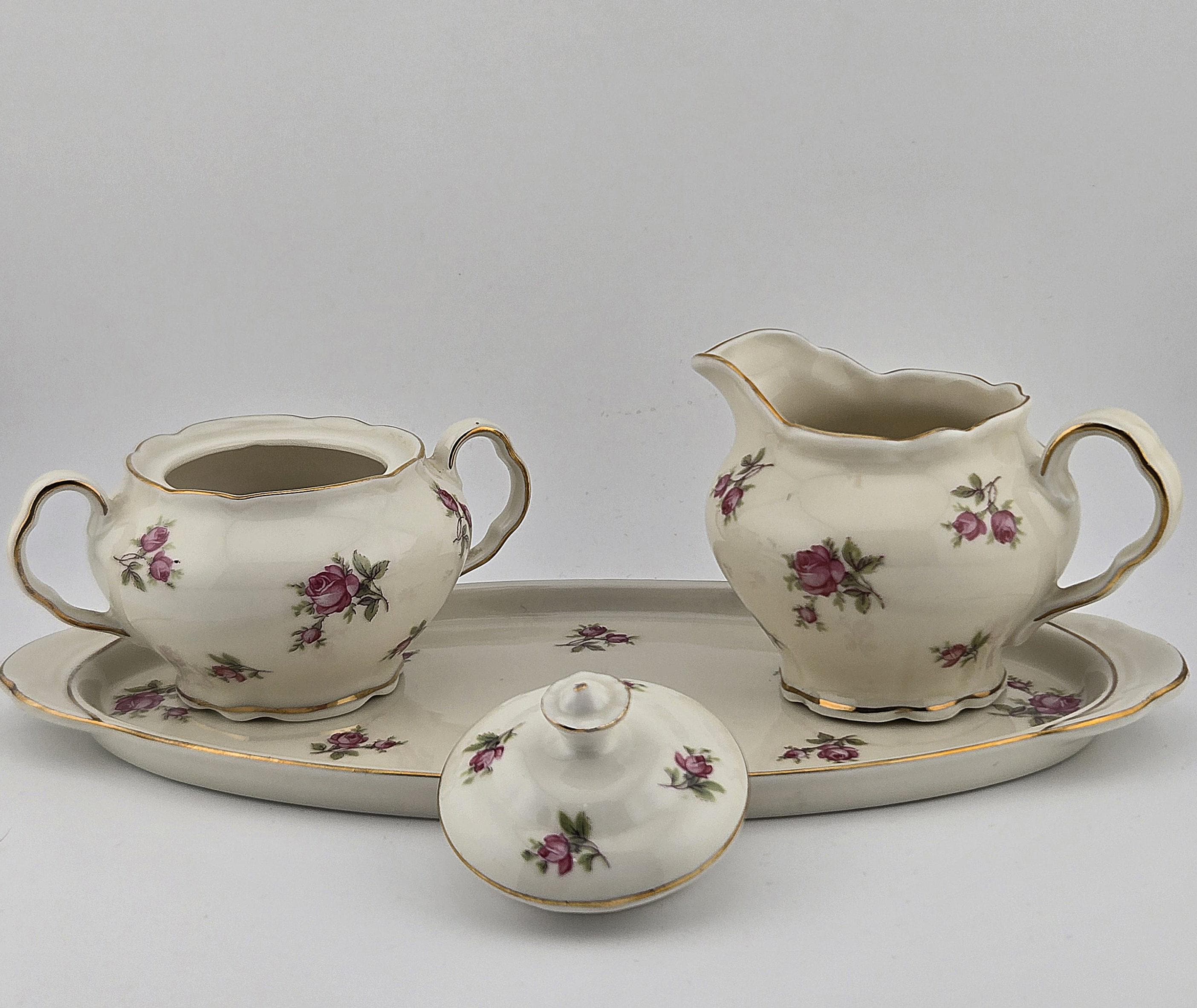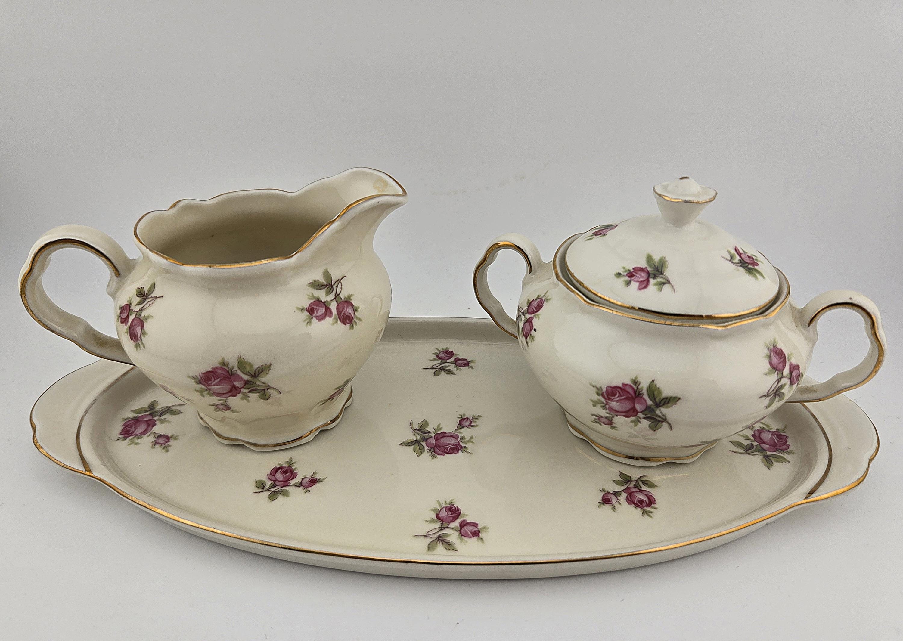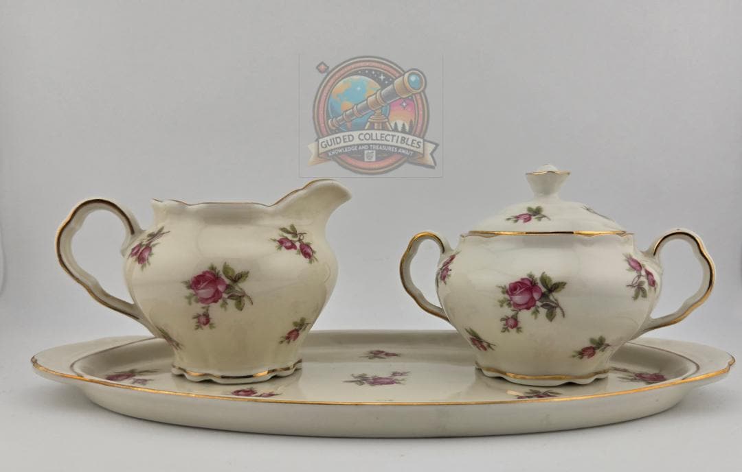 Includes: Lidded Sugar Bowl, Creamer Pitcher, and 9” Matching Tray
