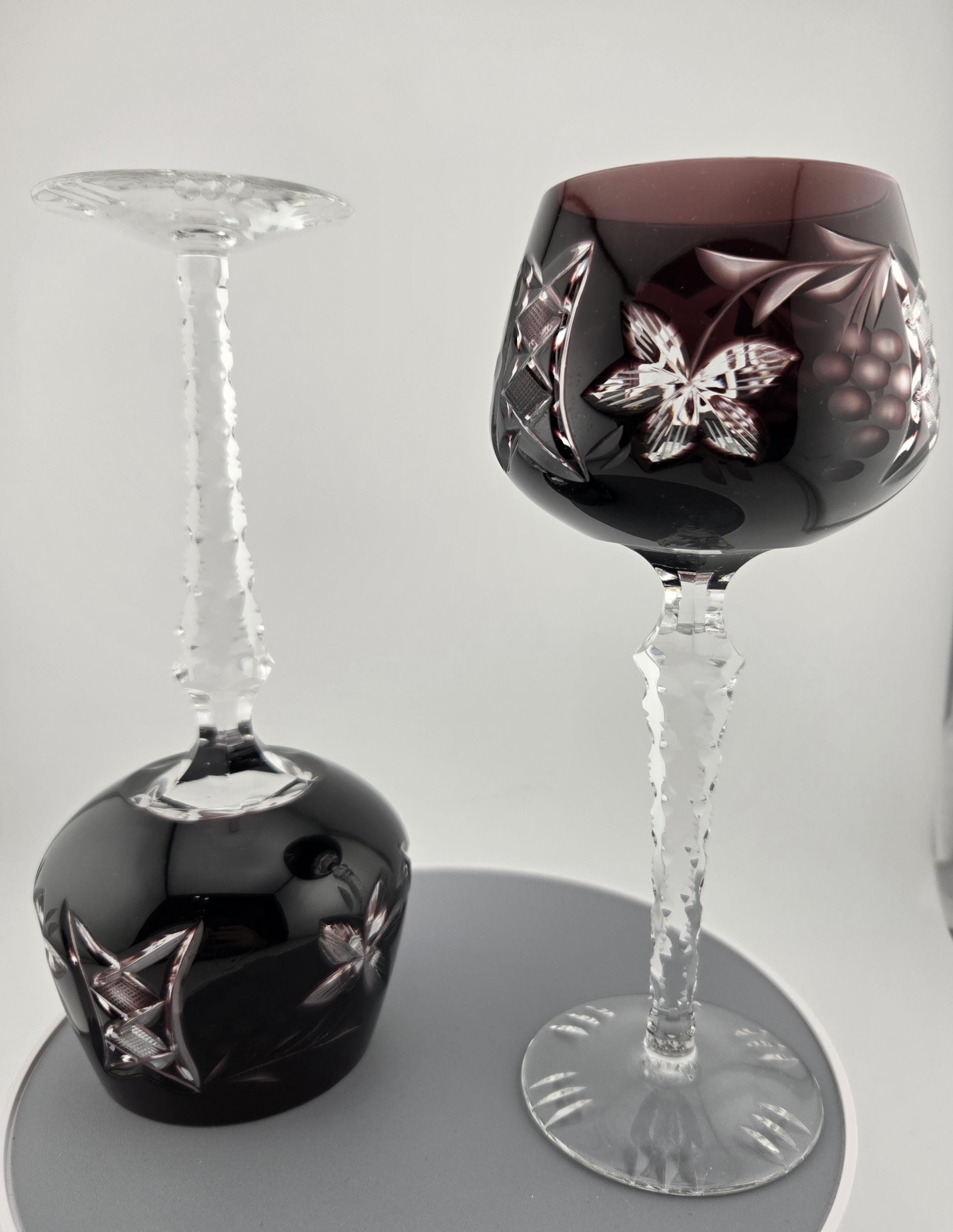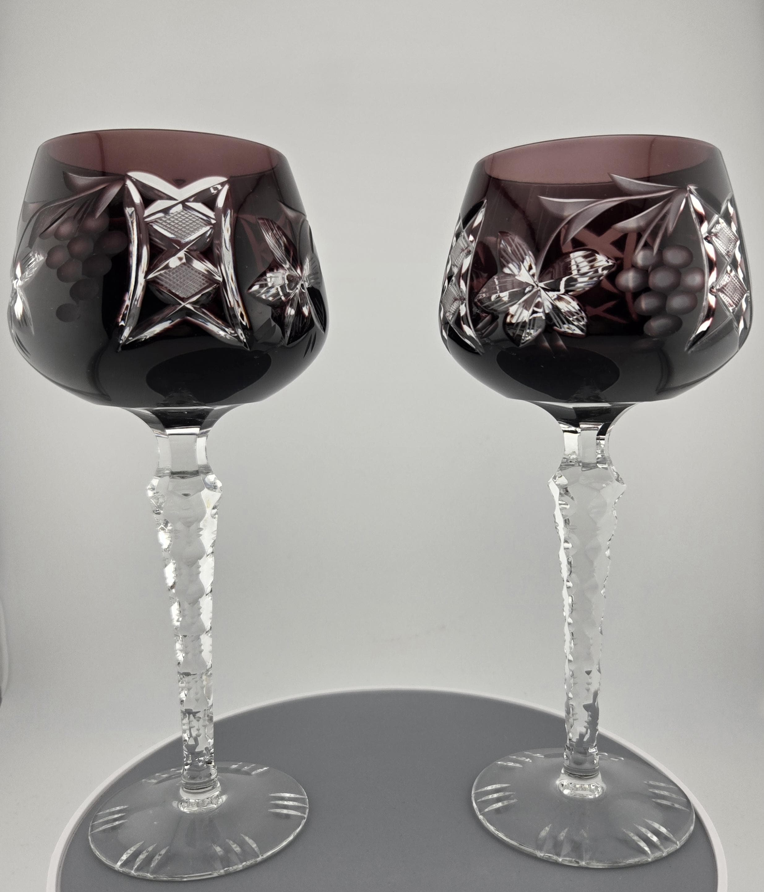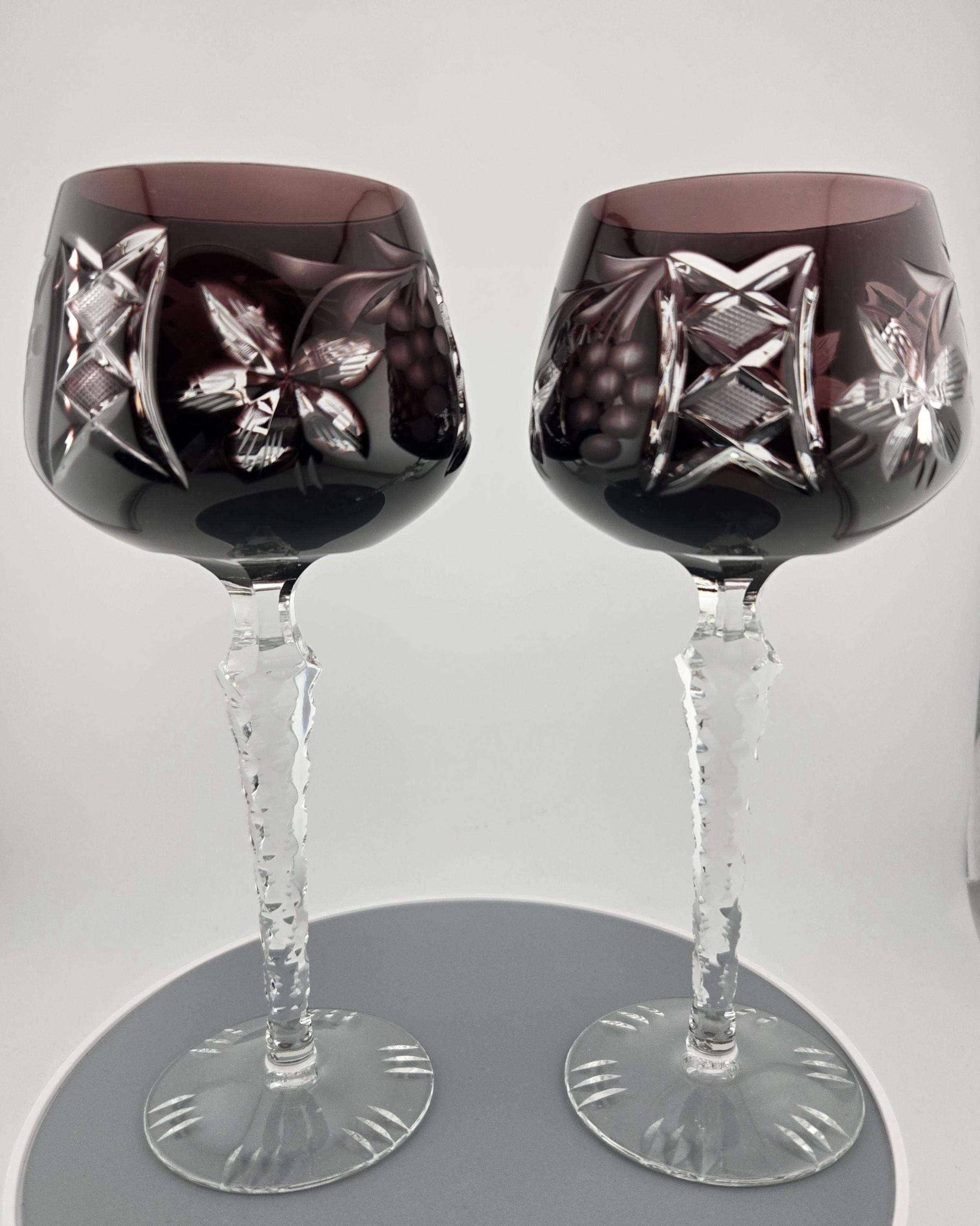 Stunning German cut-to-clear crystal wine glasses in rich amethyst purple, hand-cut with floral and lattice designs. Elegant craftsmanship and sparkling clarity in every detail.