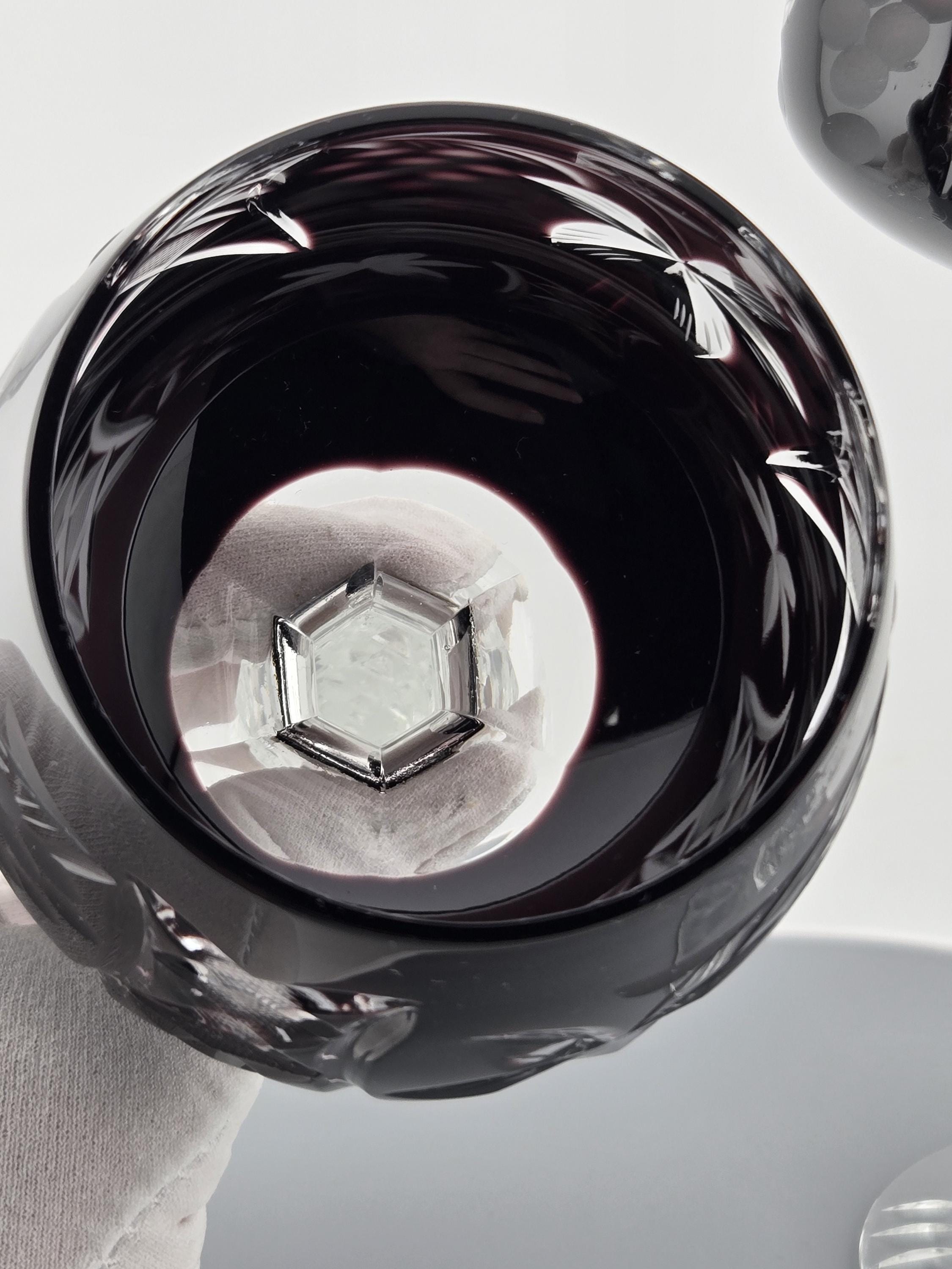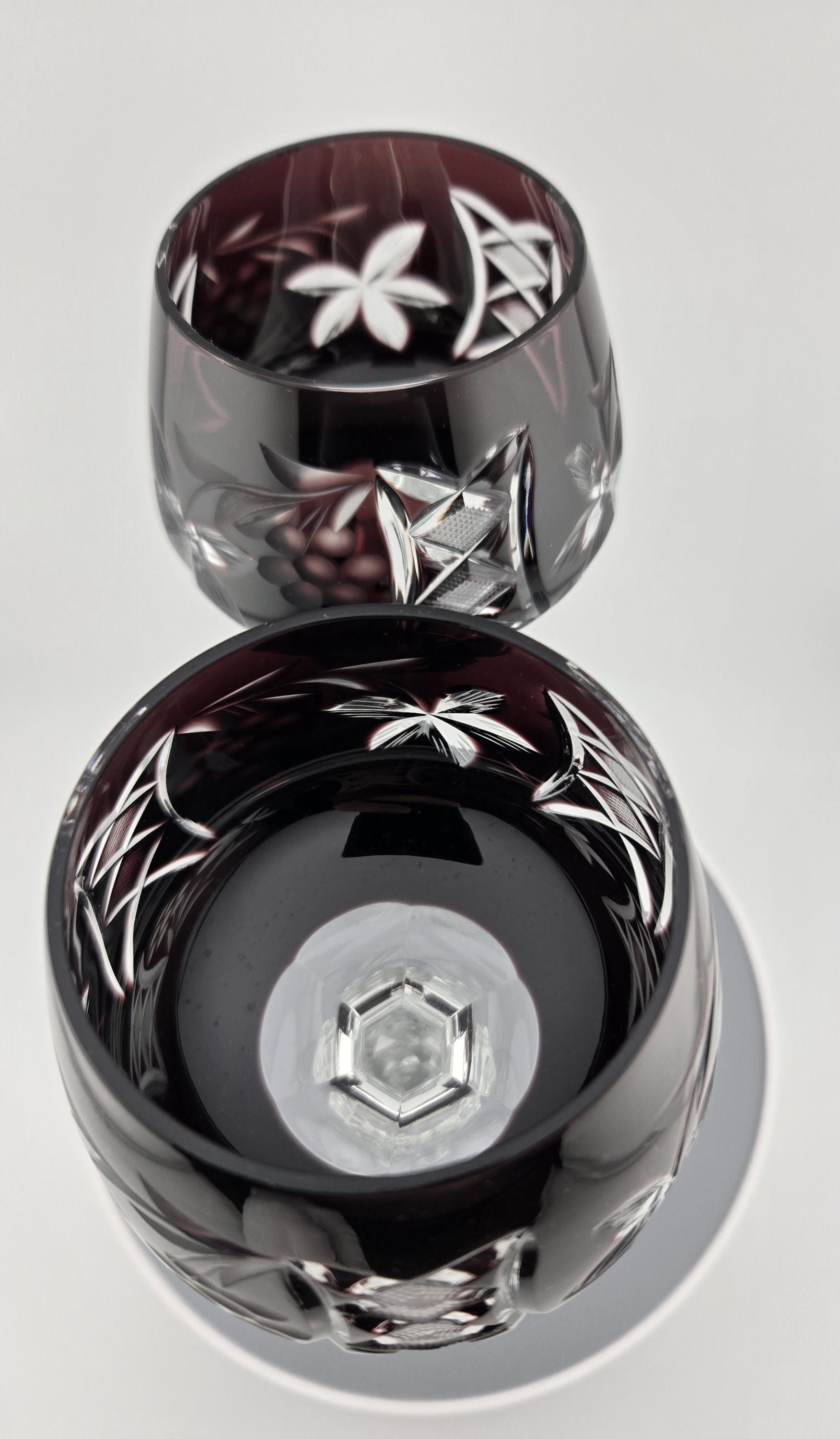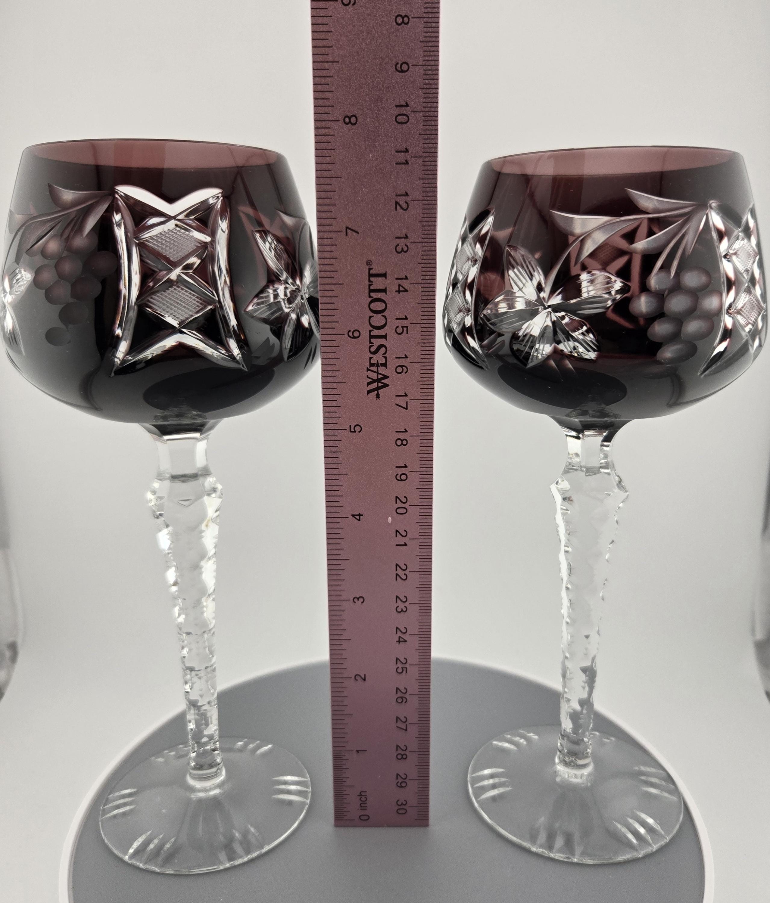 Stunning German cut-to-clear crystal wine glasses in rich amethyst purple, hand-cut with floral and lattice designs. Elegant craftsmanship and sparkling clarity in every detail.