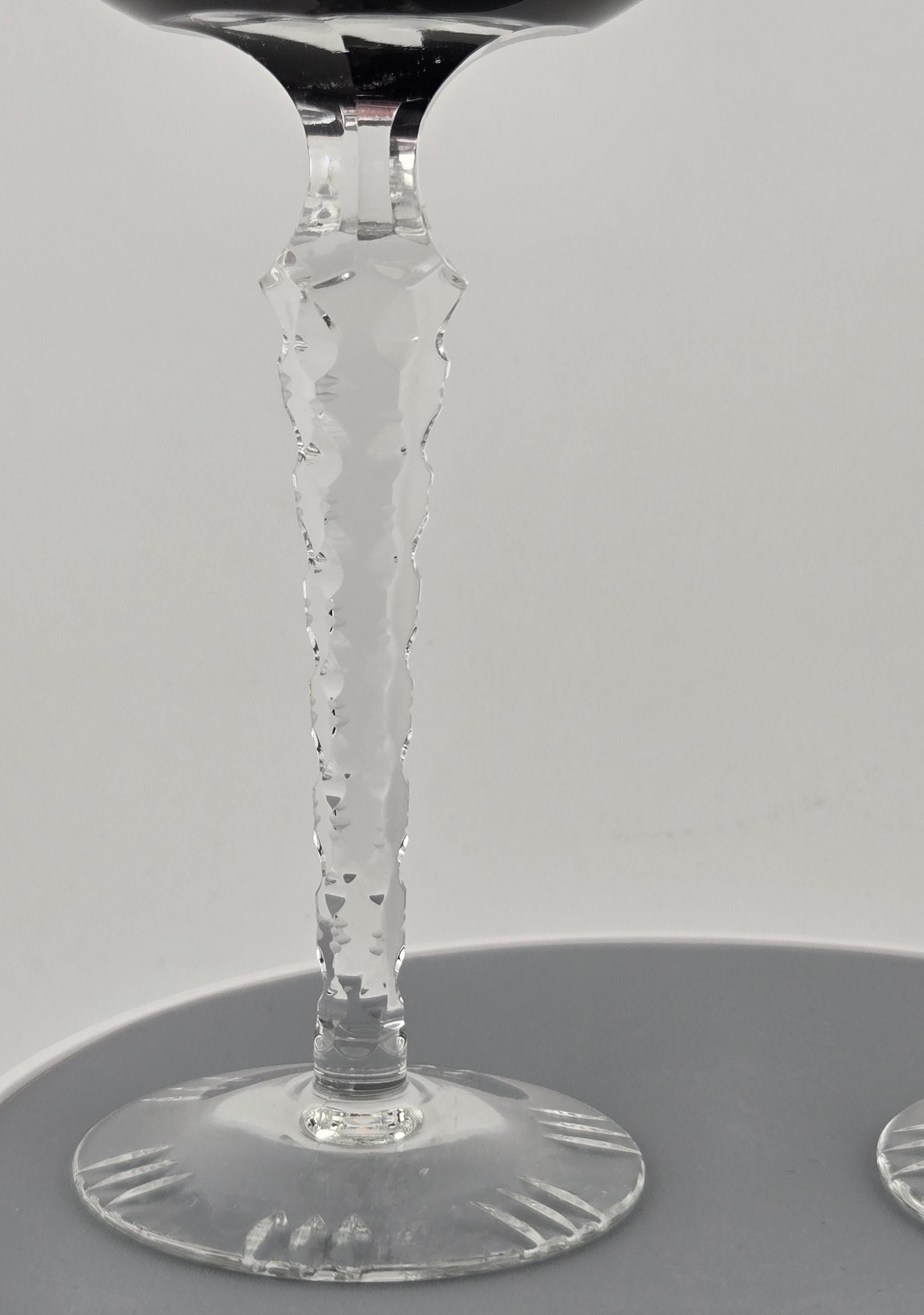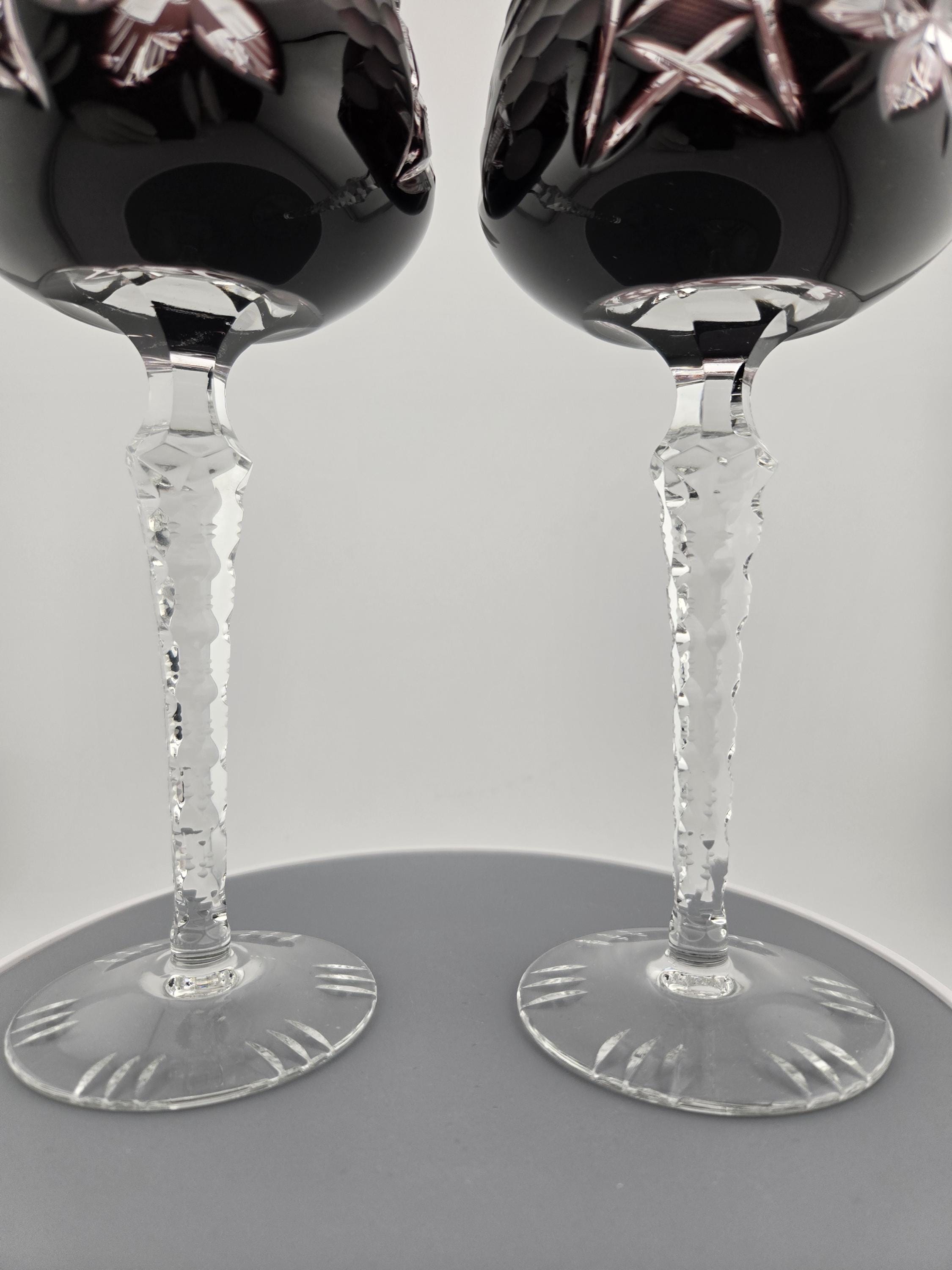 Add refined European artistry to your collection with this pair of German cut-to-clear crystal wine glasses, featuring a deep amethyst purple overlay that has been expertly hand-cut to reveal intricate clear crystal patterns beneath. Each glass stands approximately 8 inches tall, with a gracefully flared bowl, faceted stem, and finely detailed base.