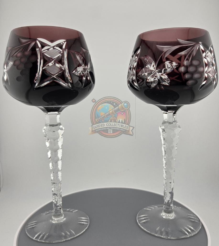 These glasses are true examples of traditional Bohemian-style cut-to-clear crystal, highly regarded for its craftsmanship, clarity, and color depth. Perfect for fine wine service, display, or gifting, they make a sophisticated addition to any crystal collection or holiday table setting.