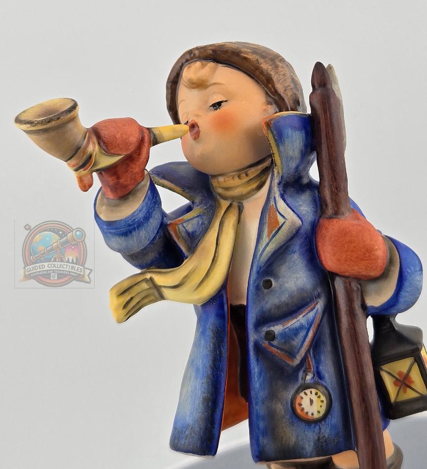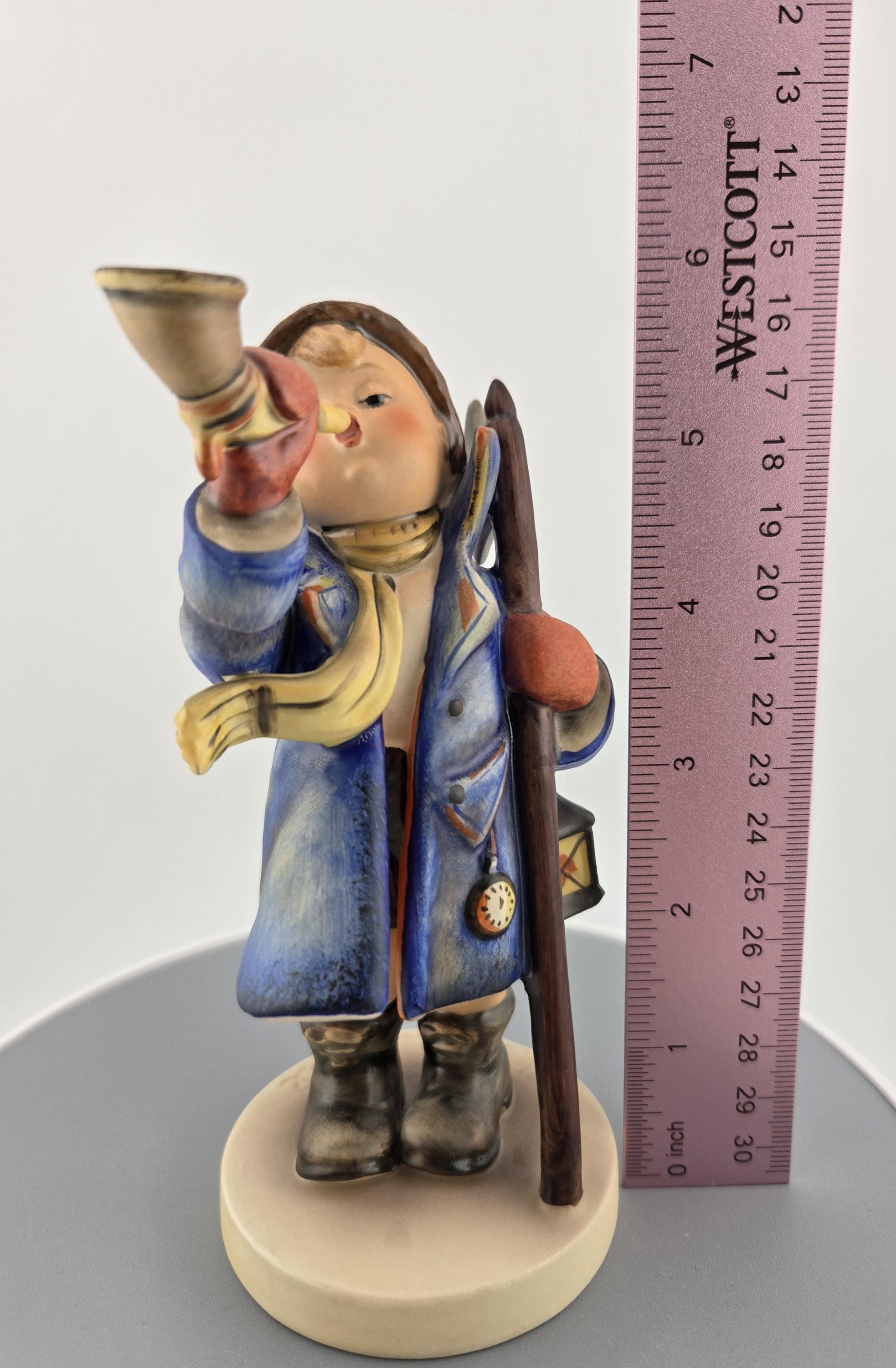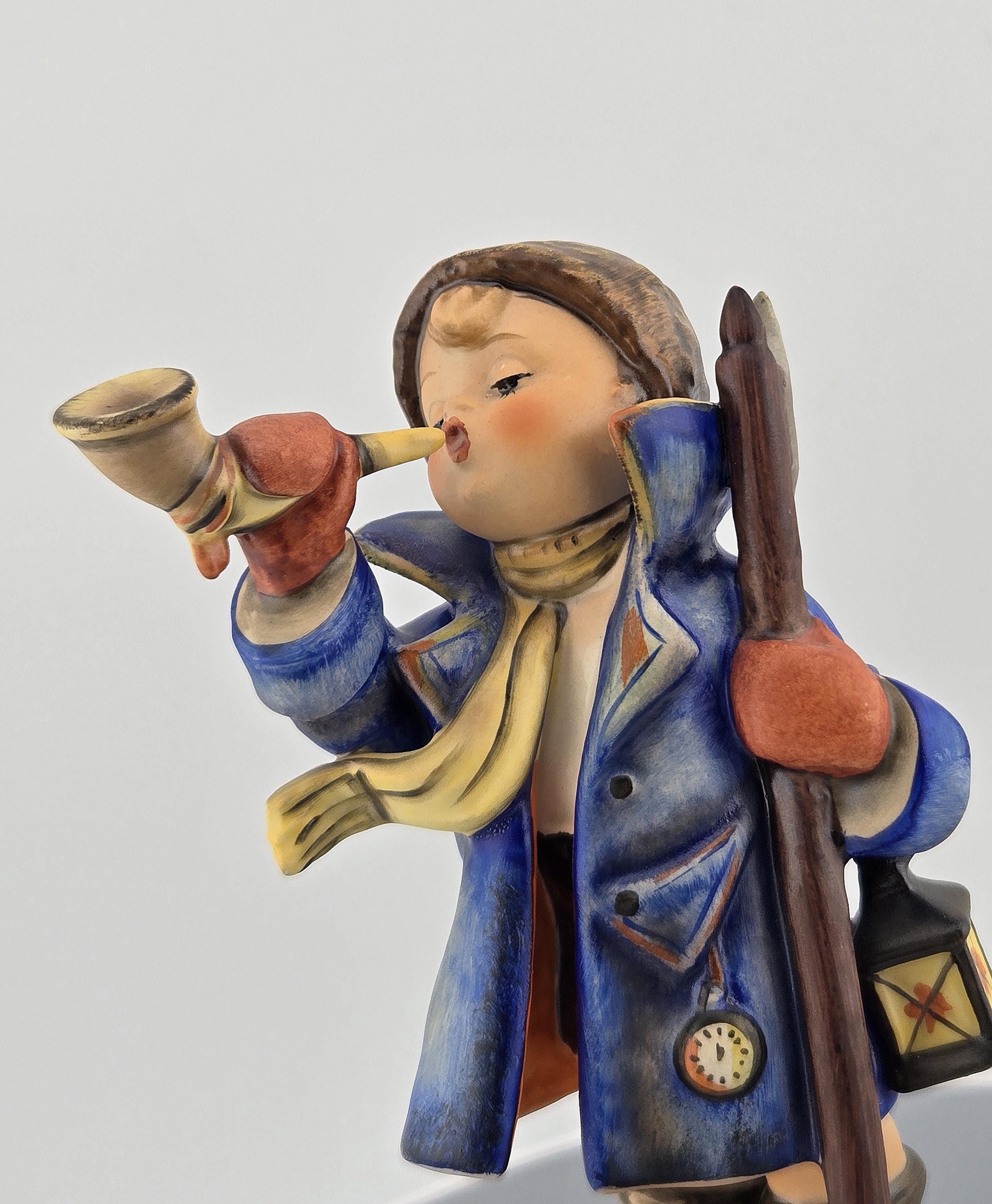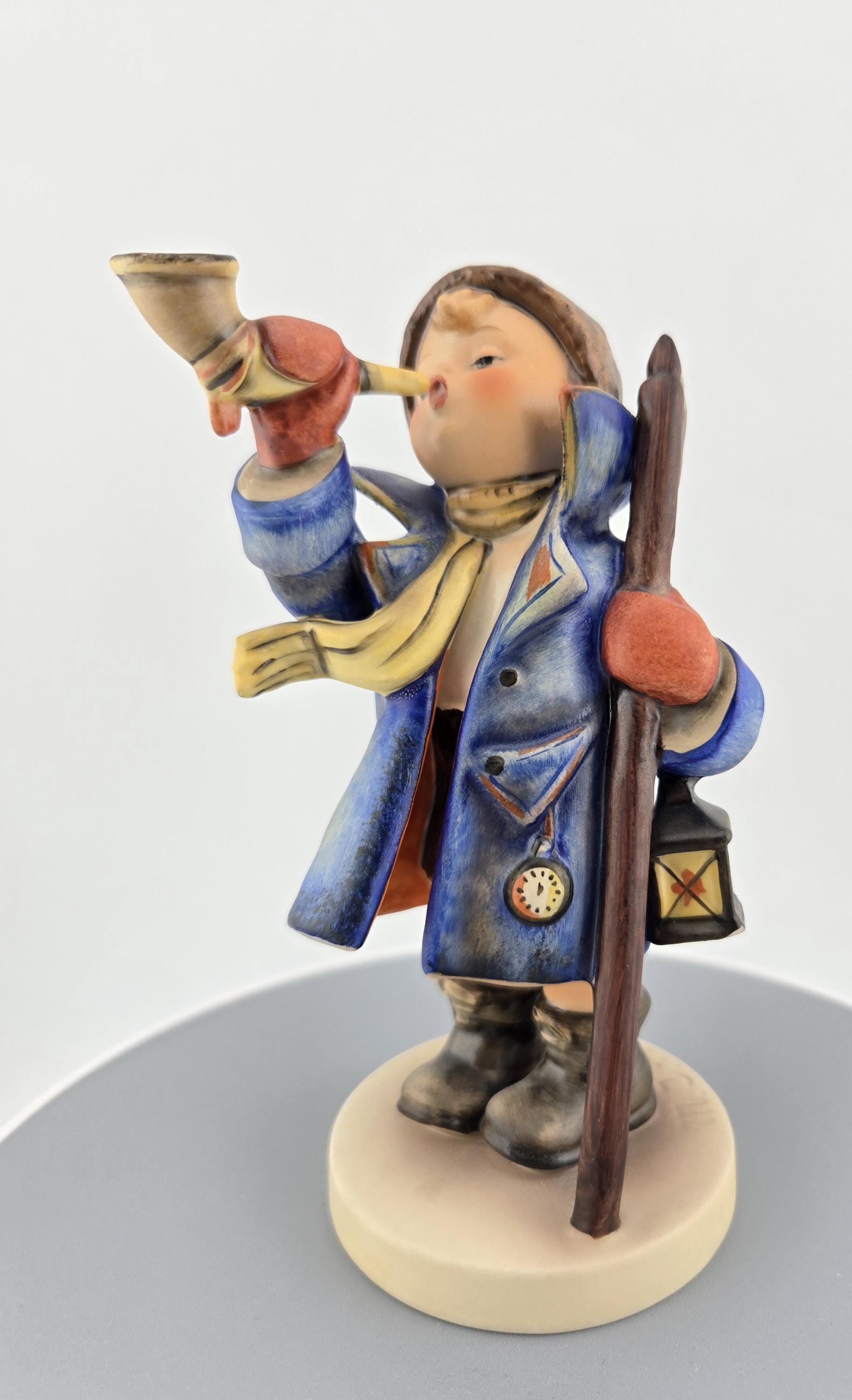 Full Description: This Goebel Hummel figurine, titled “Hear Ye, Hear Ye” (#13/3), captures the warmth and nostalgia of classic Bavarian craftsmanship. Produced in West Germany, this collectible stands approximately 5.5 inches tall and depicts a cheerful young boy bundled in a blue overcoat, yellow scarf, and red mittens, joyfully blowing his horn while holding a walking stick and lantern.