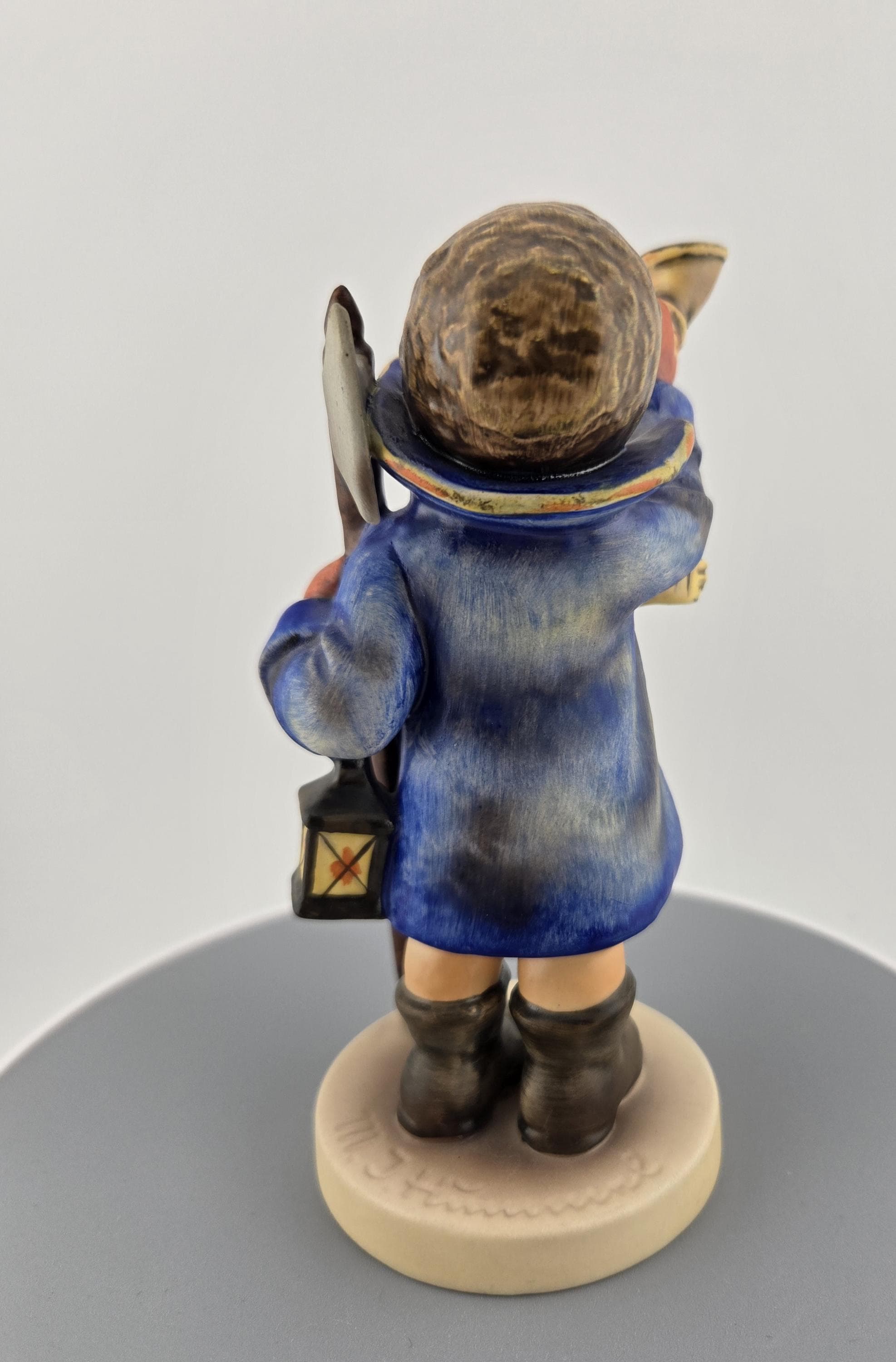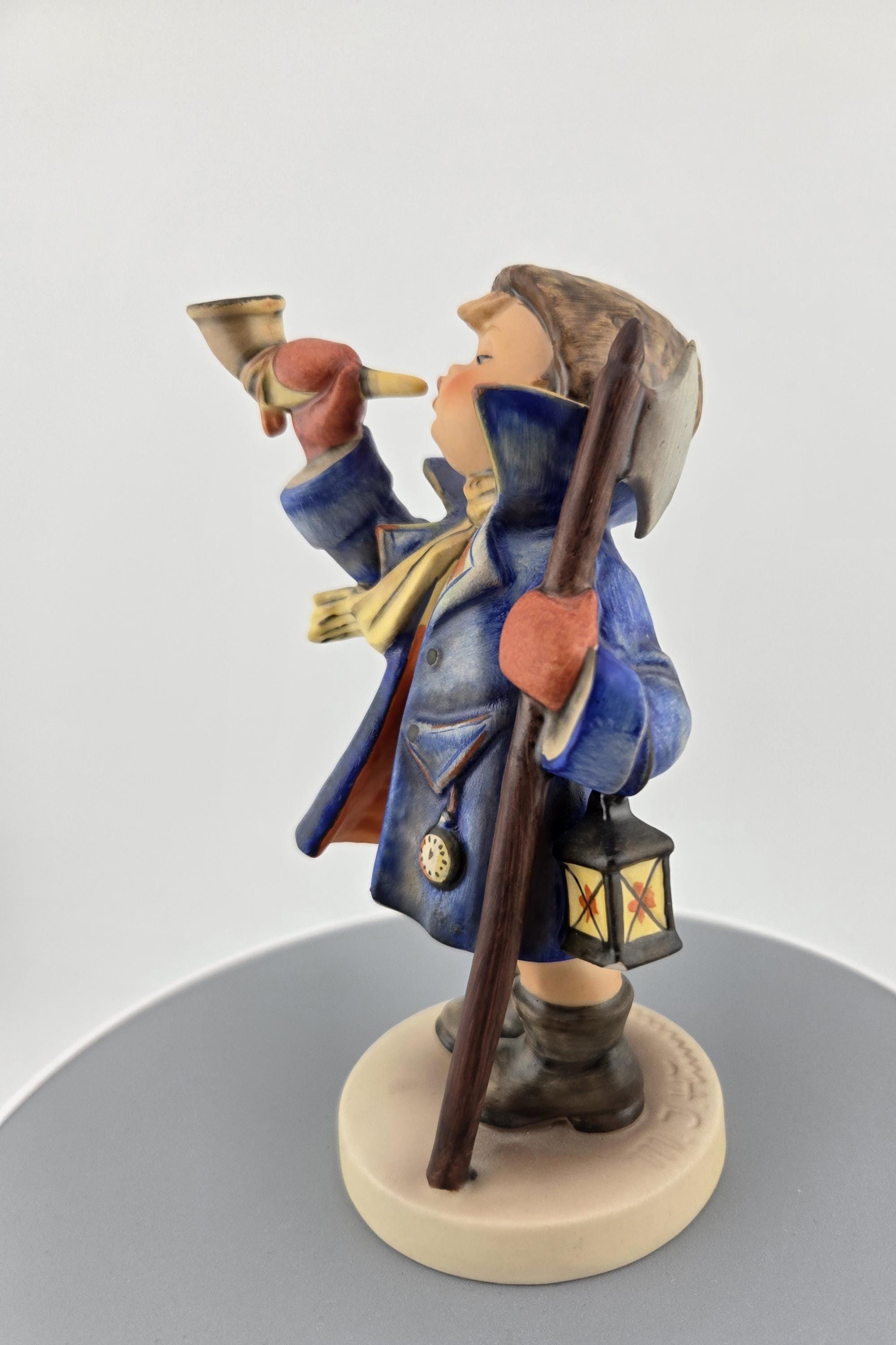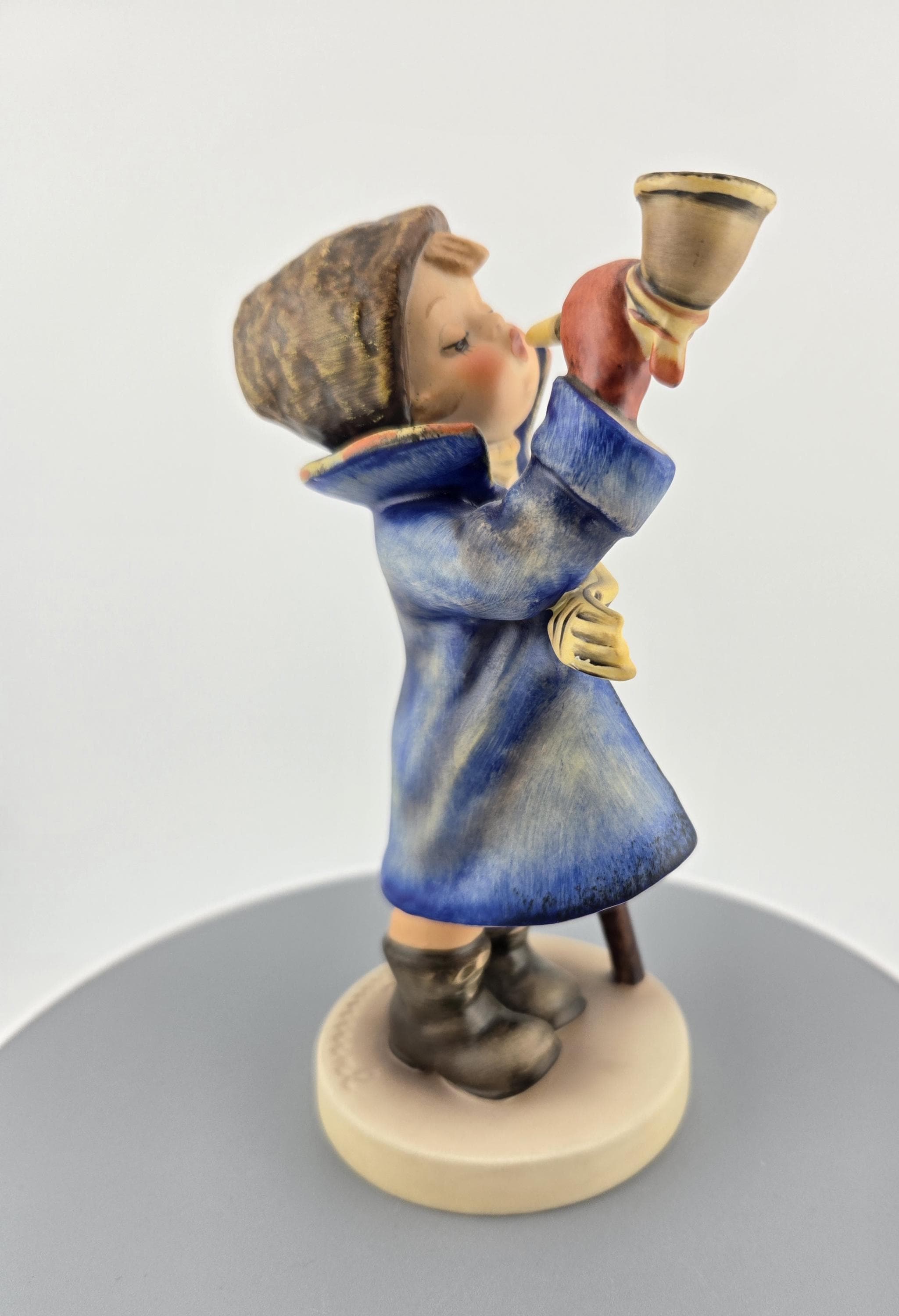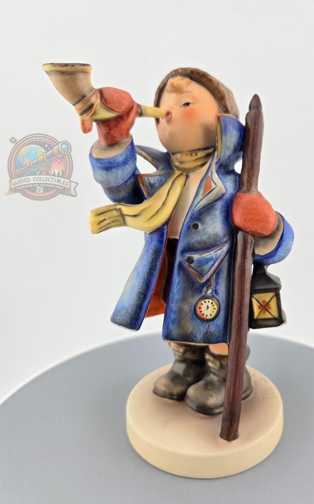 Full Description: This Goebel Hummel figurine, titled “Hear Ye, Hear Ye” (#13/3), captures the warmth and nostalgia of classic Bavarian craftsmanship. Produced in West Germany, this collectible stands approximately 5.5 inches tall and depicts a cheerful young boy bundled in a blue overcoat, yellow scarf, and red mittens, joyfully blowing his horn while holding a walking stick and lantern.