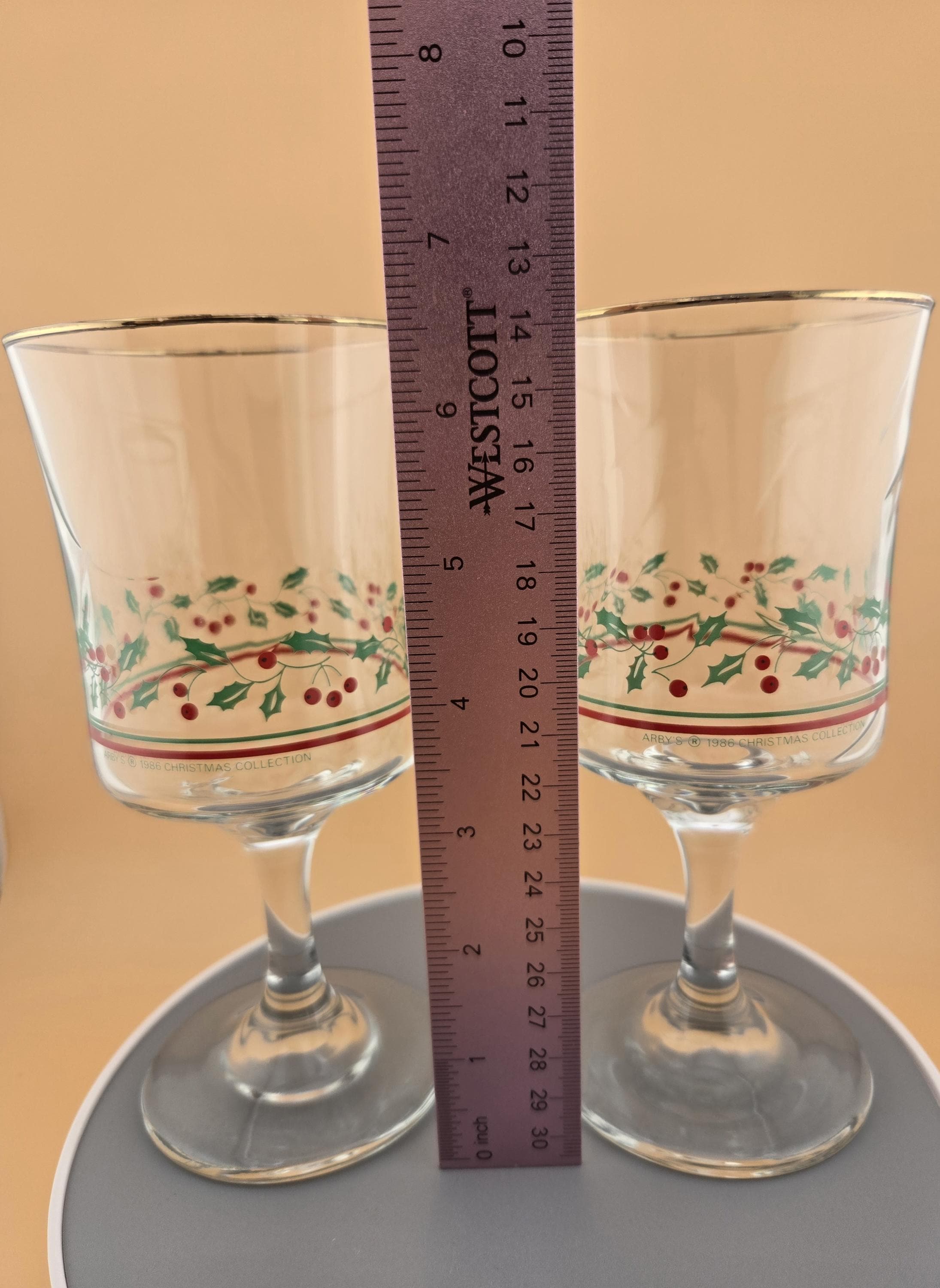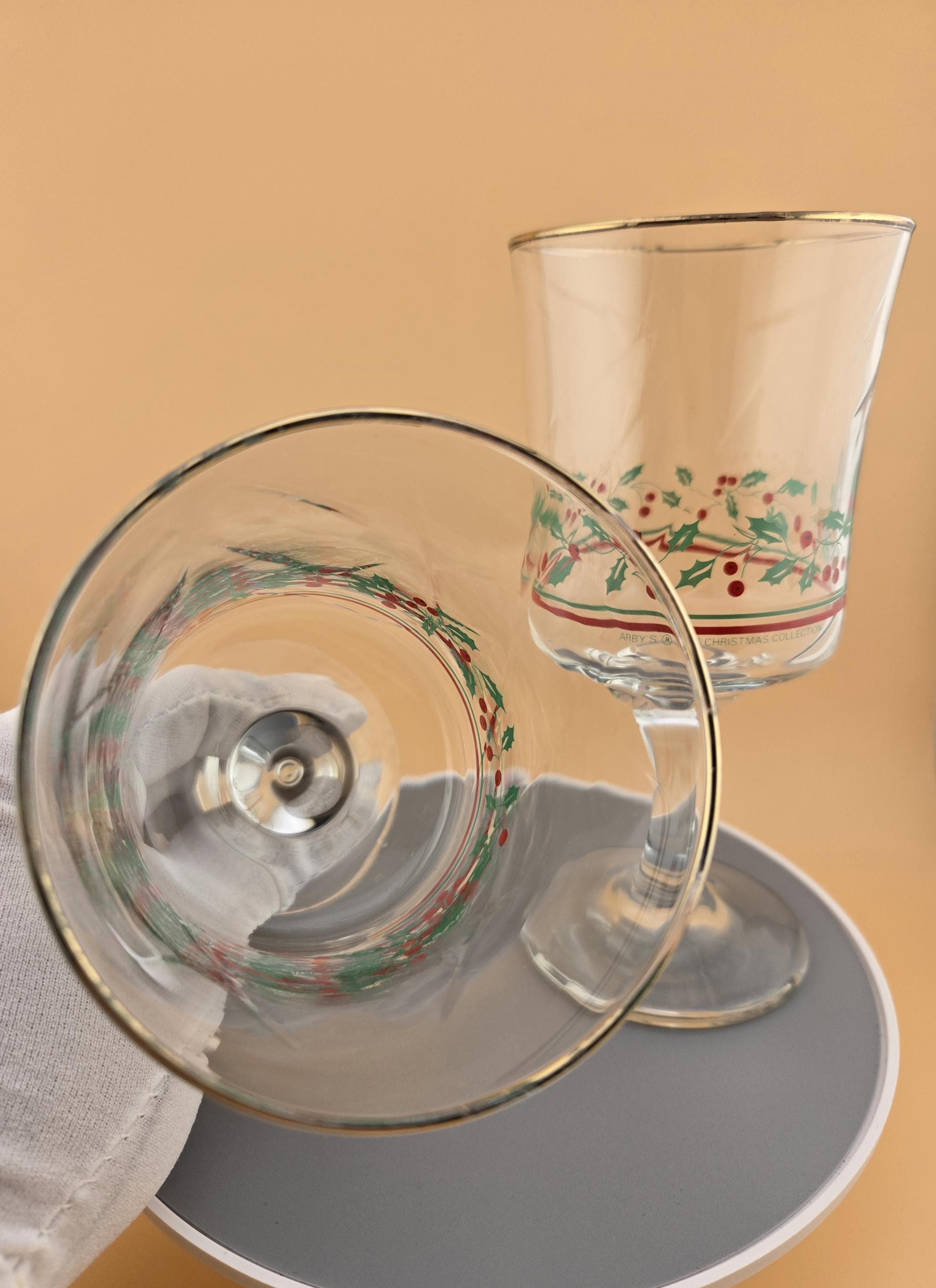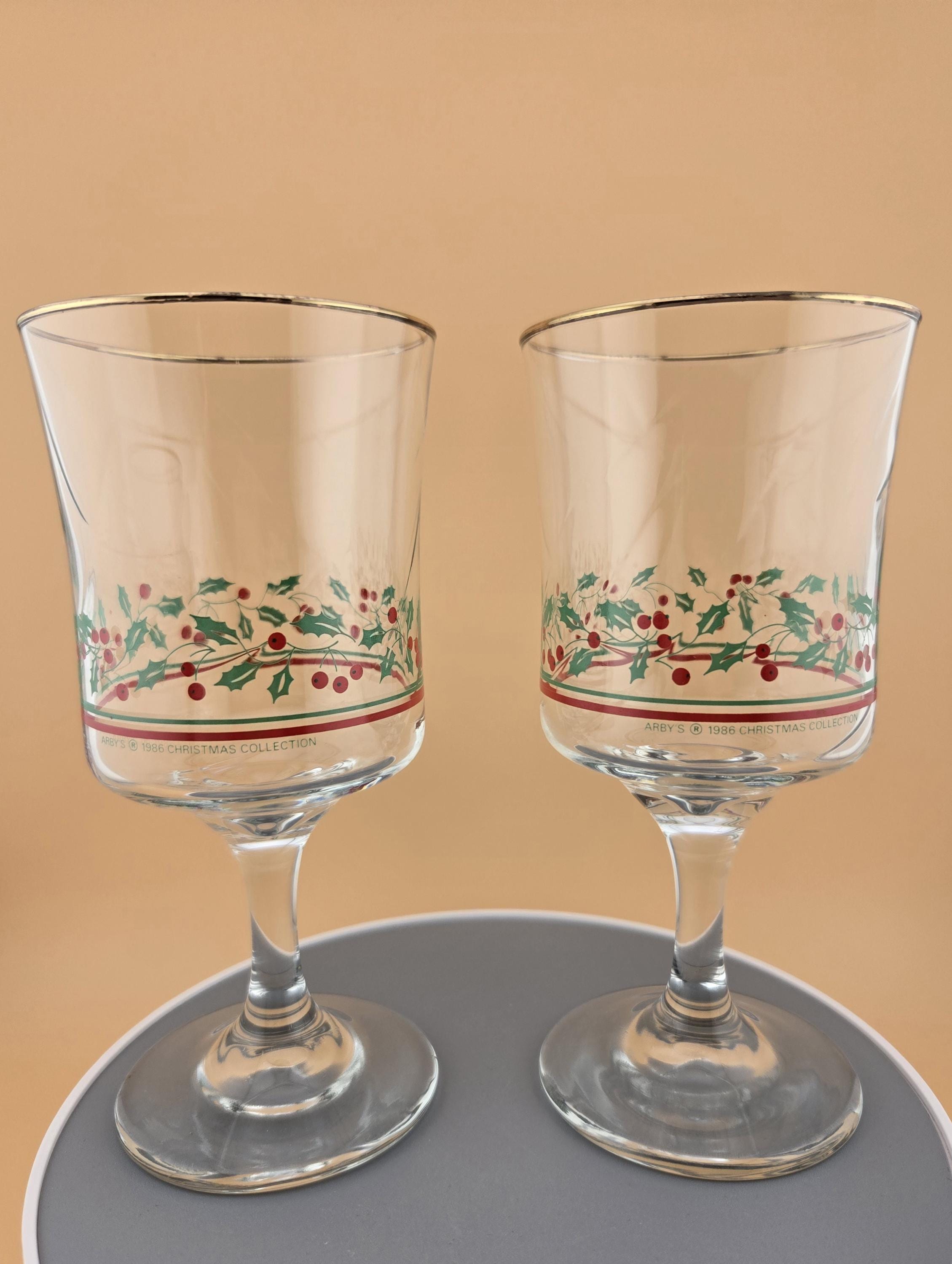 Celebrate the season in vintage style with this pair of Arby’s 1986 Christmas Collection glasses, featuring festive holly and berry designs with elegant gold rims. Bring a touch of nostalgic holiday cheer to your table with this beautiful pair of Arby’s 1986 Christmas Collection stemmed glasses. Standing approximately 6.5 inches tall, these festive glasses feature a classic holly and berry pattern encircling each bowl, accented by brilliant gold rims for an elegant seasonal finish.