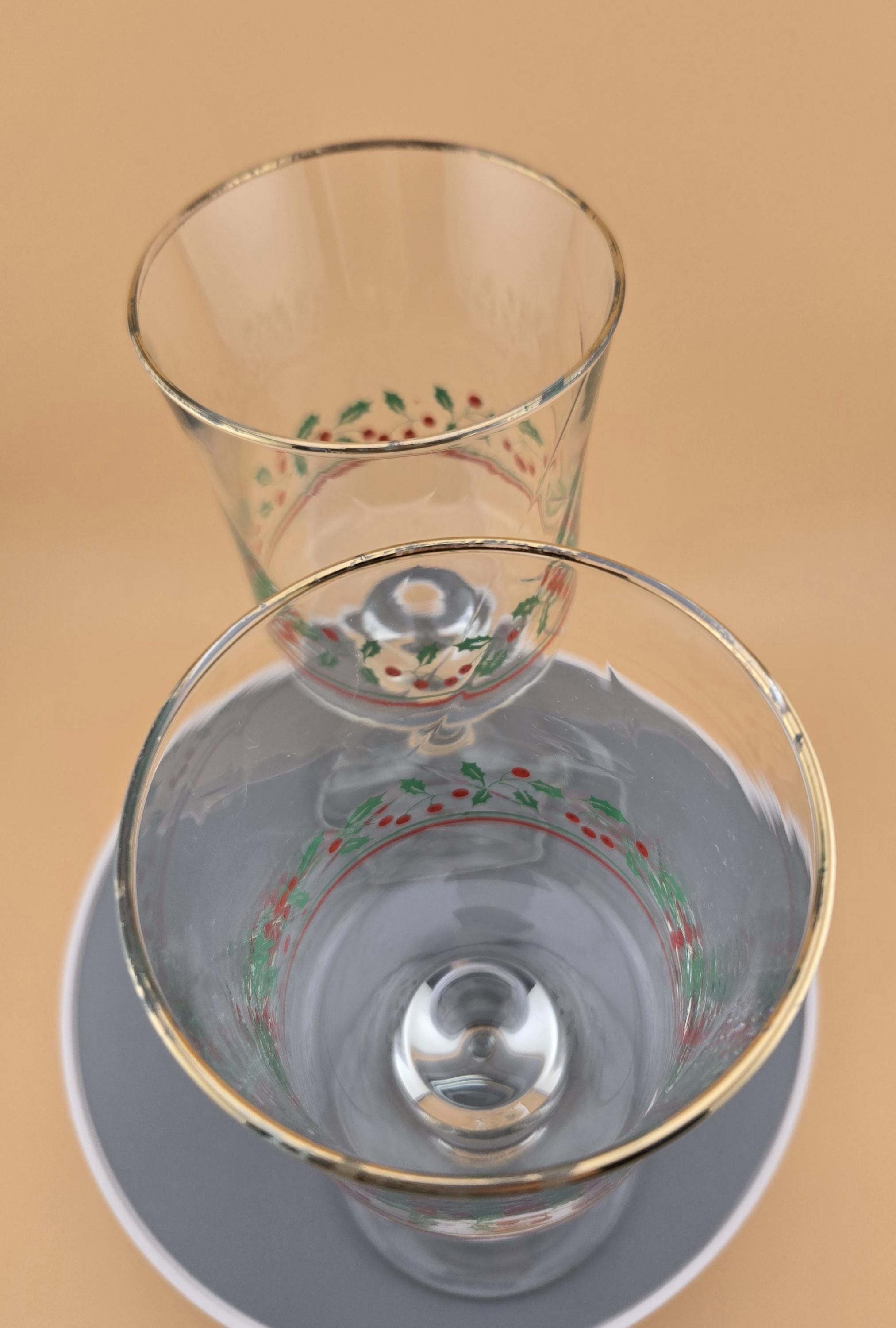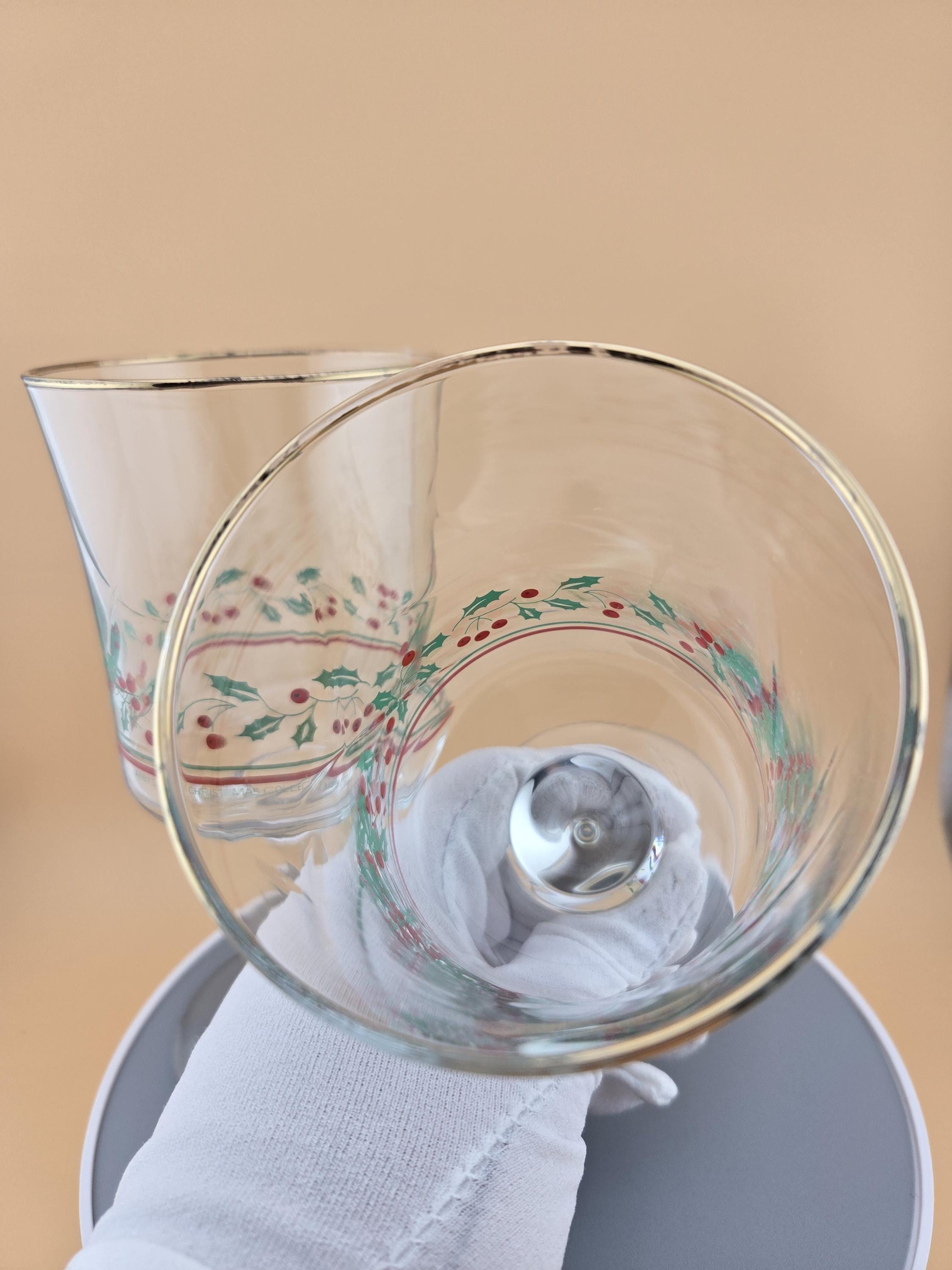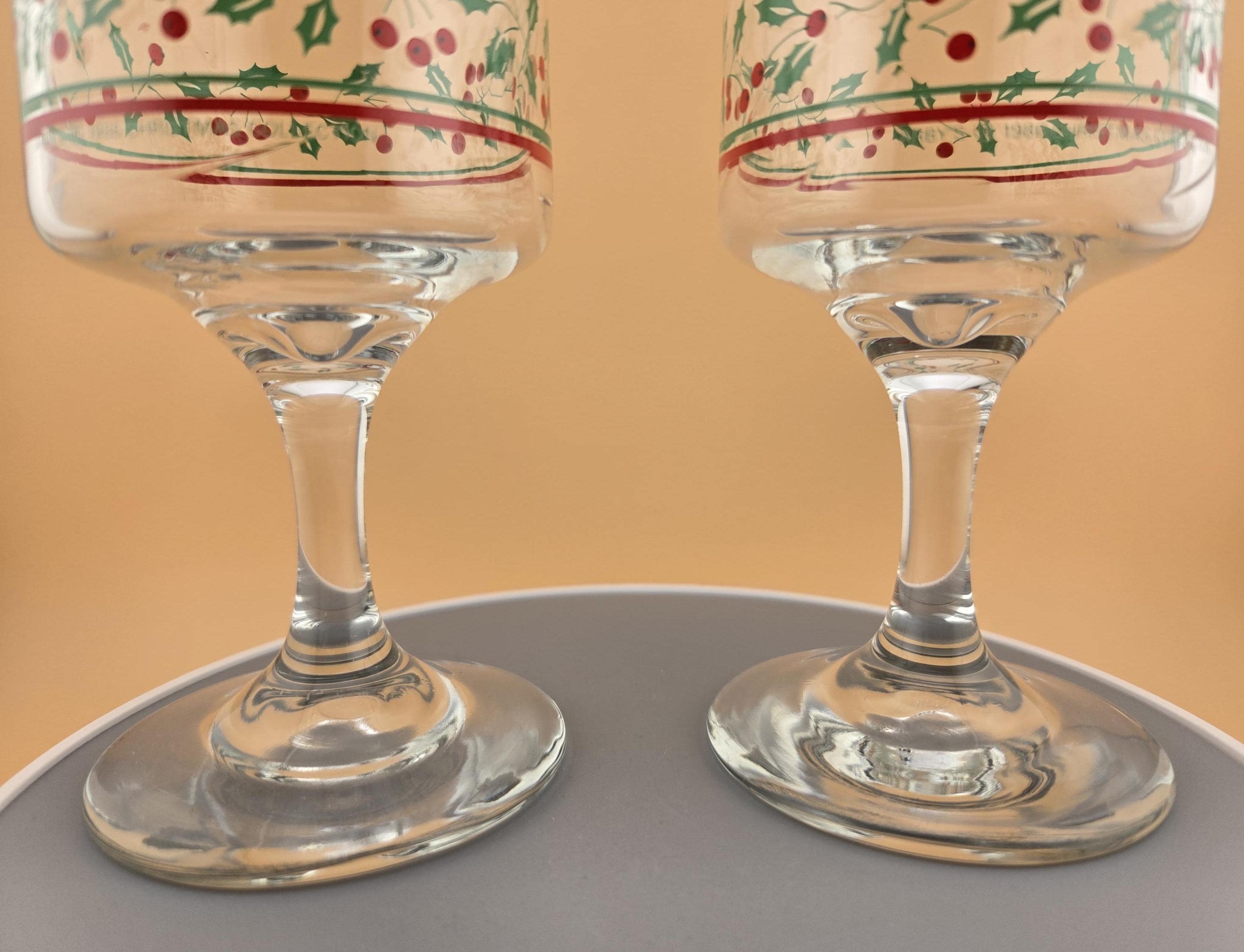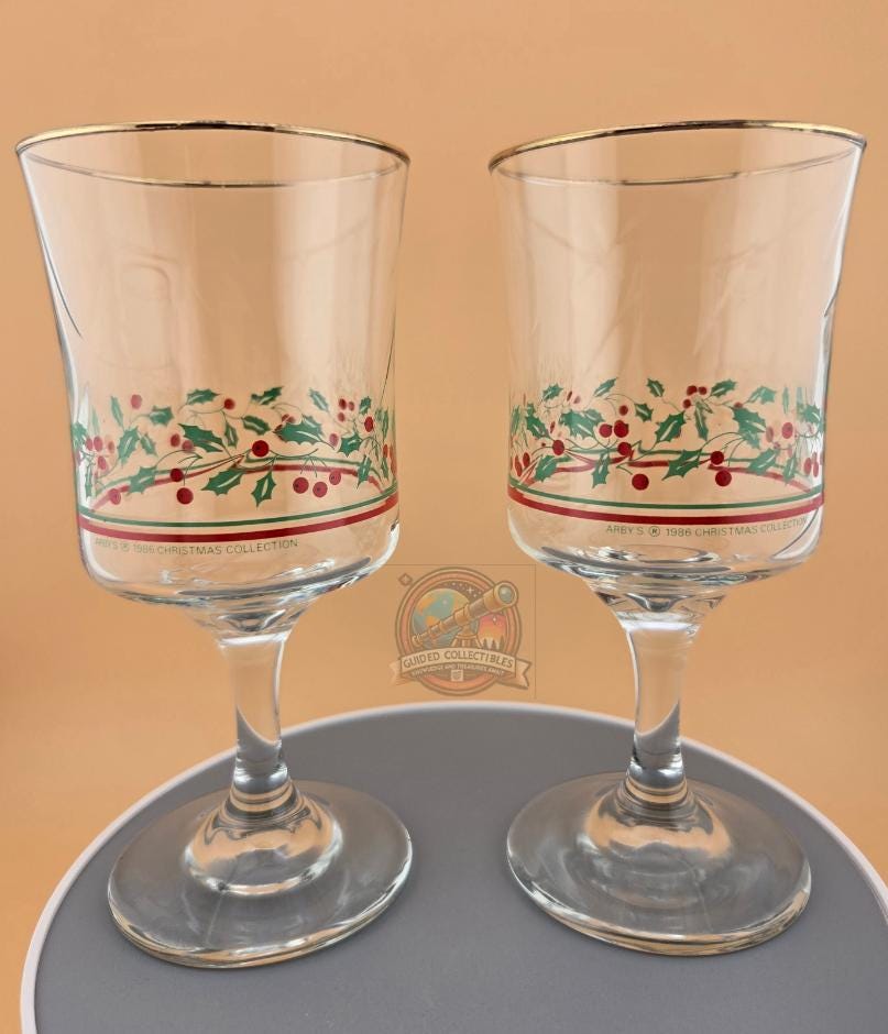Celebrate the season in vintage style with this pair of Arby’s 1986 Christmas Collection glasses, featuring festive holly and berry designs with elegant gold rims. Bring a touch of nostalgic holiday cheer to your table with this beautiful pair of Arby’s 1986 Christmas Collection stemmed glasses. Standing approximately 6.5 inches tall, these festive glasses feature a classic holly and berry pattern encircling each bowl, accented by brilliant gold rims for an elegant seasonal finish.