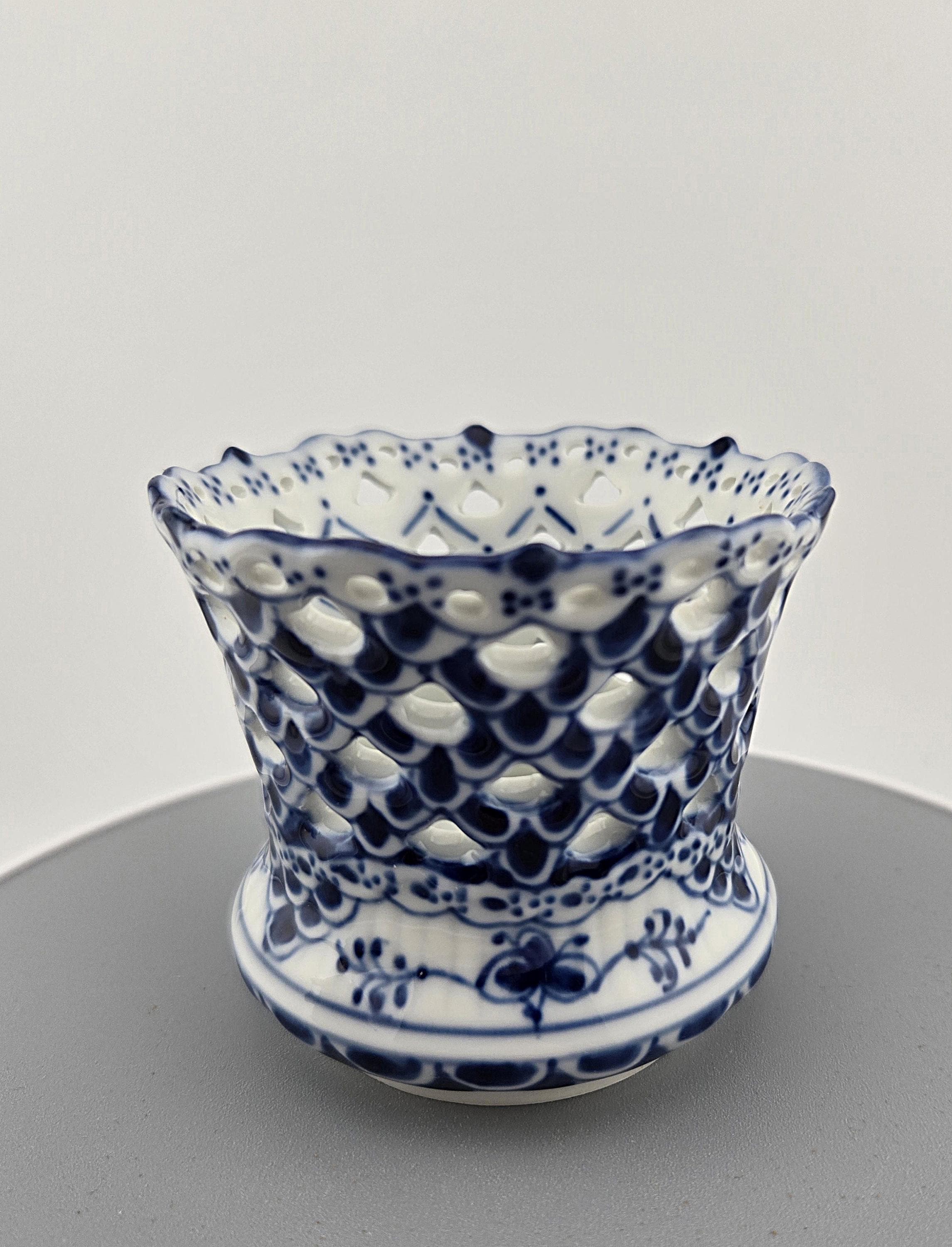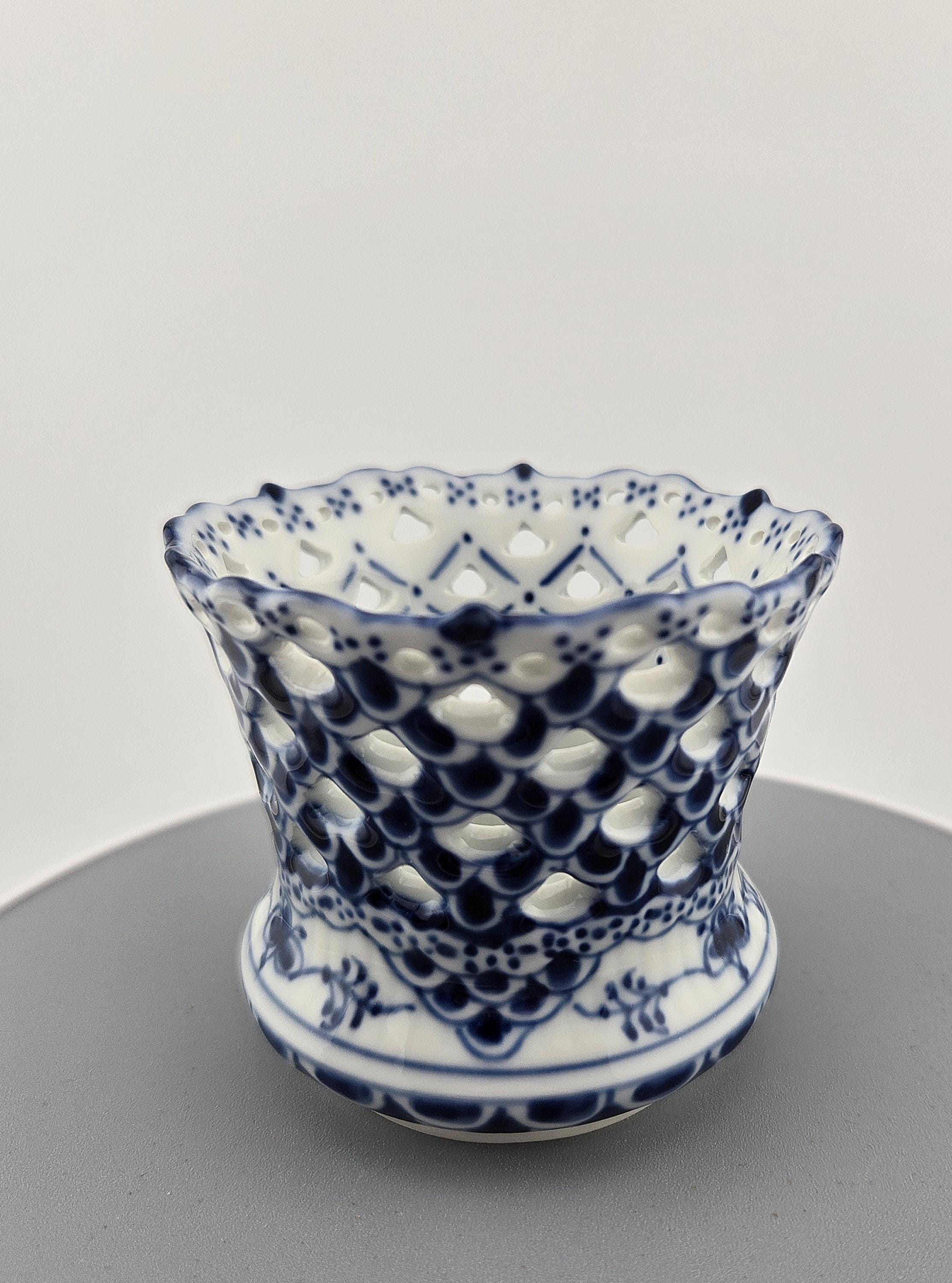 A delicate Royal Copenhagen Blue Fluted Full Lace porcelain vase or candle holder, handcrafted in Denmark and decorated with the classic cobalt-blue lace pattern.