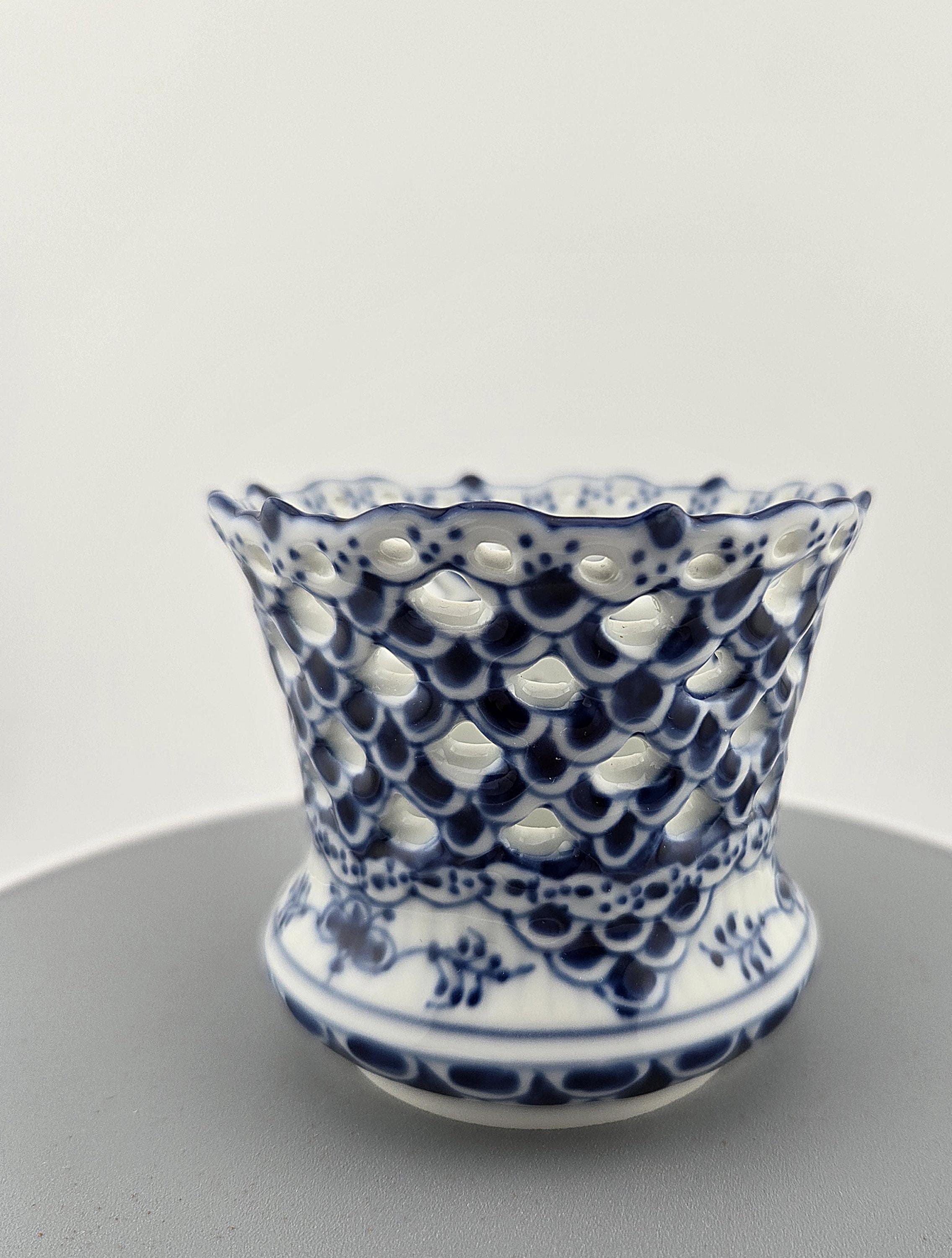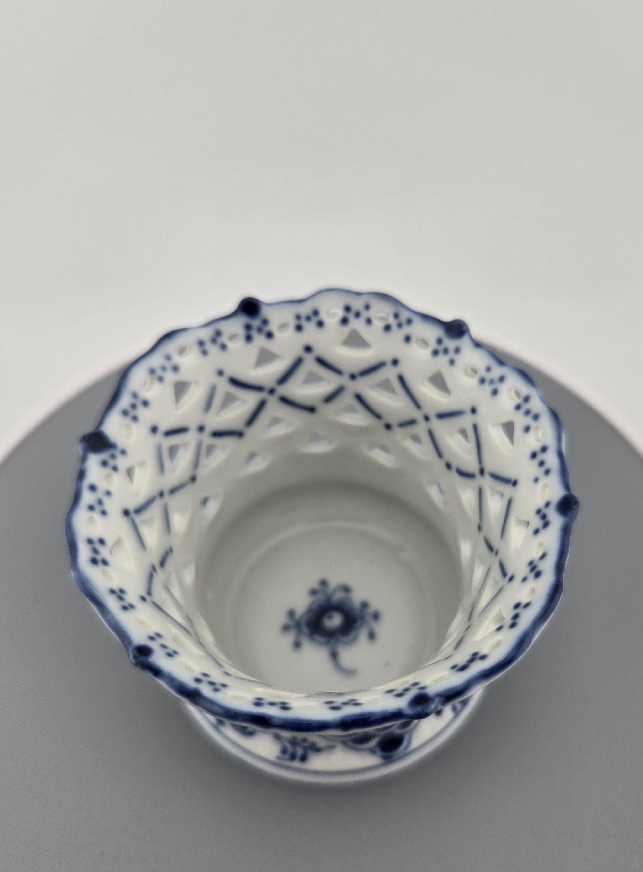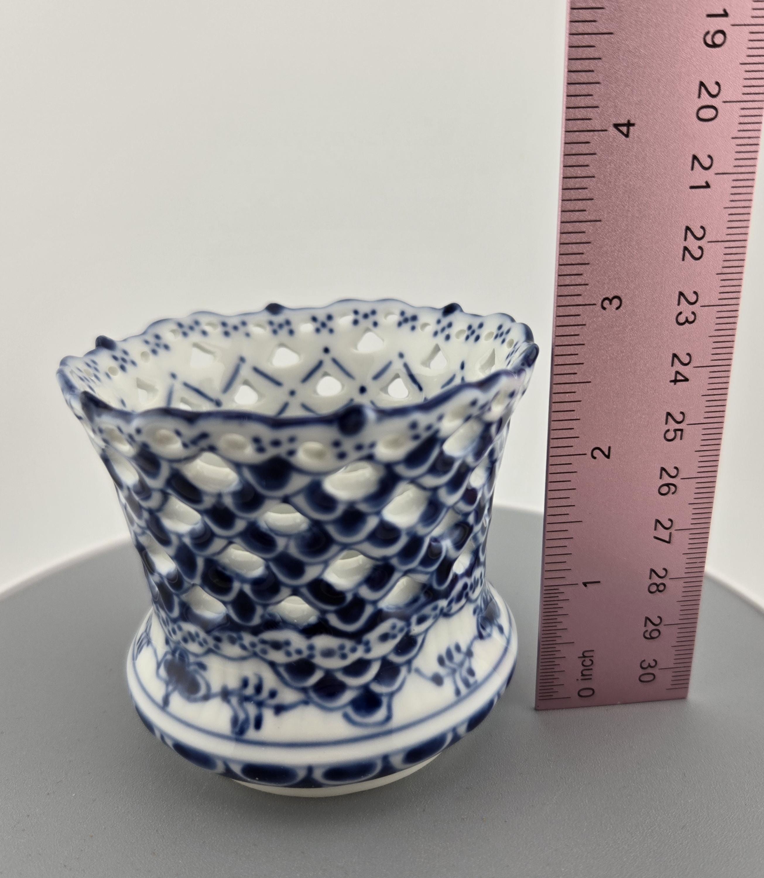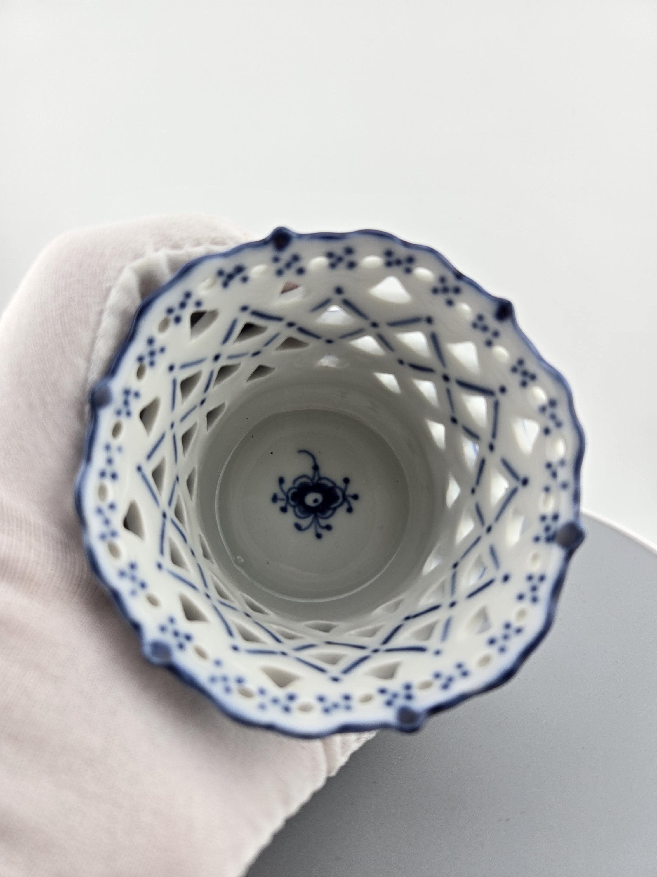 The Blue Fluted Full Lace pattern is among Royal Copenhagen’s most intricate and collectible designs, introduced in the late 1700s and still painted by hand today. The lacework requires extraordinary precision—each cutout and brushstroke applied individually by skilled artisans. Smaller pieces like this #1015 holder were made in limited runs, making them prized additions for collectors of Danish porcelain.