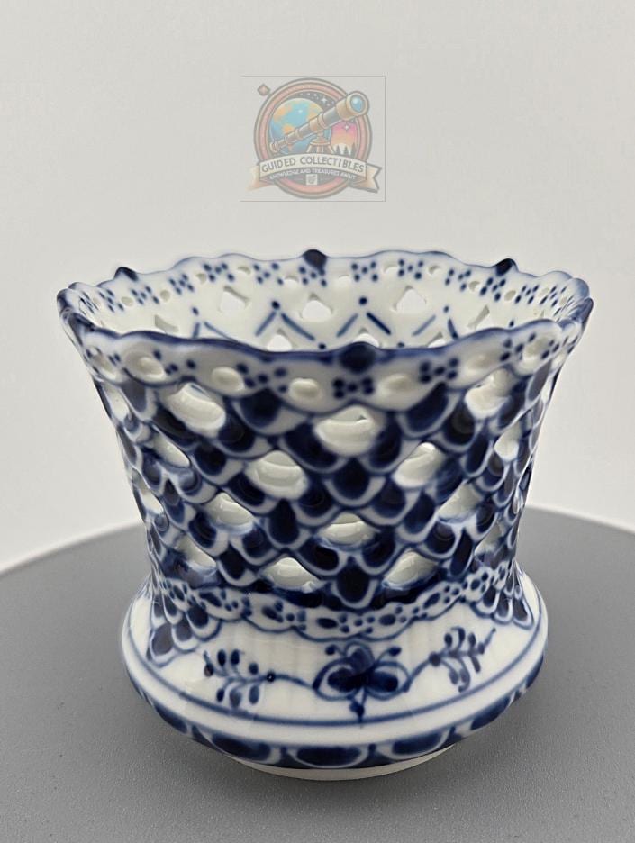 Each detail—from the scalloped edge to the intricate latticework—reflects Royal Copenhagen’s dedication to hand-painted excellence and fine European porcelain tradition. The underside bears the Royal Copenhagen Denmark hallmark with the green crown stamp, blue wave marks, and hand-painted artist initials, confirming its authenticity and heritage.