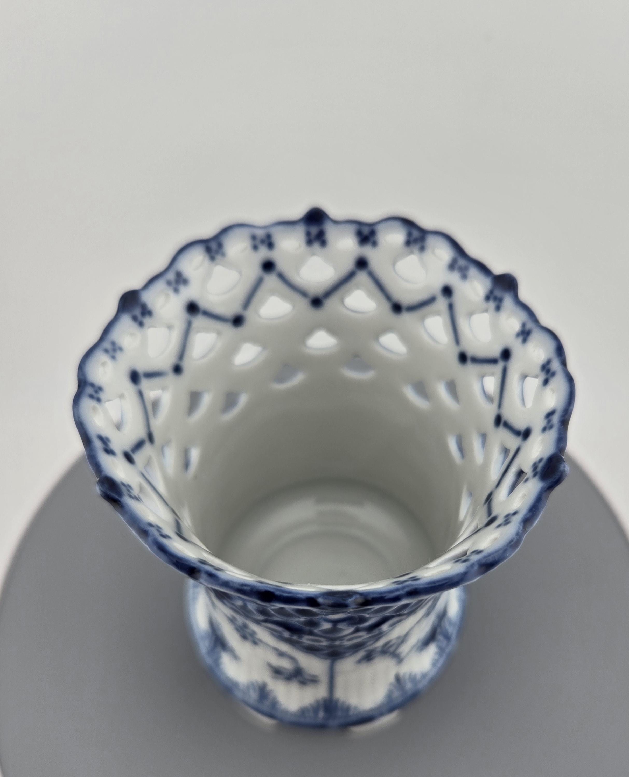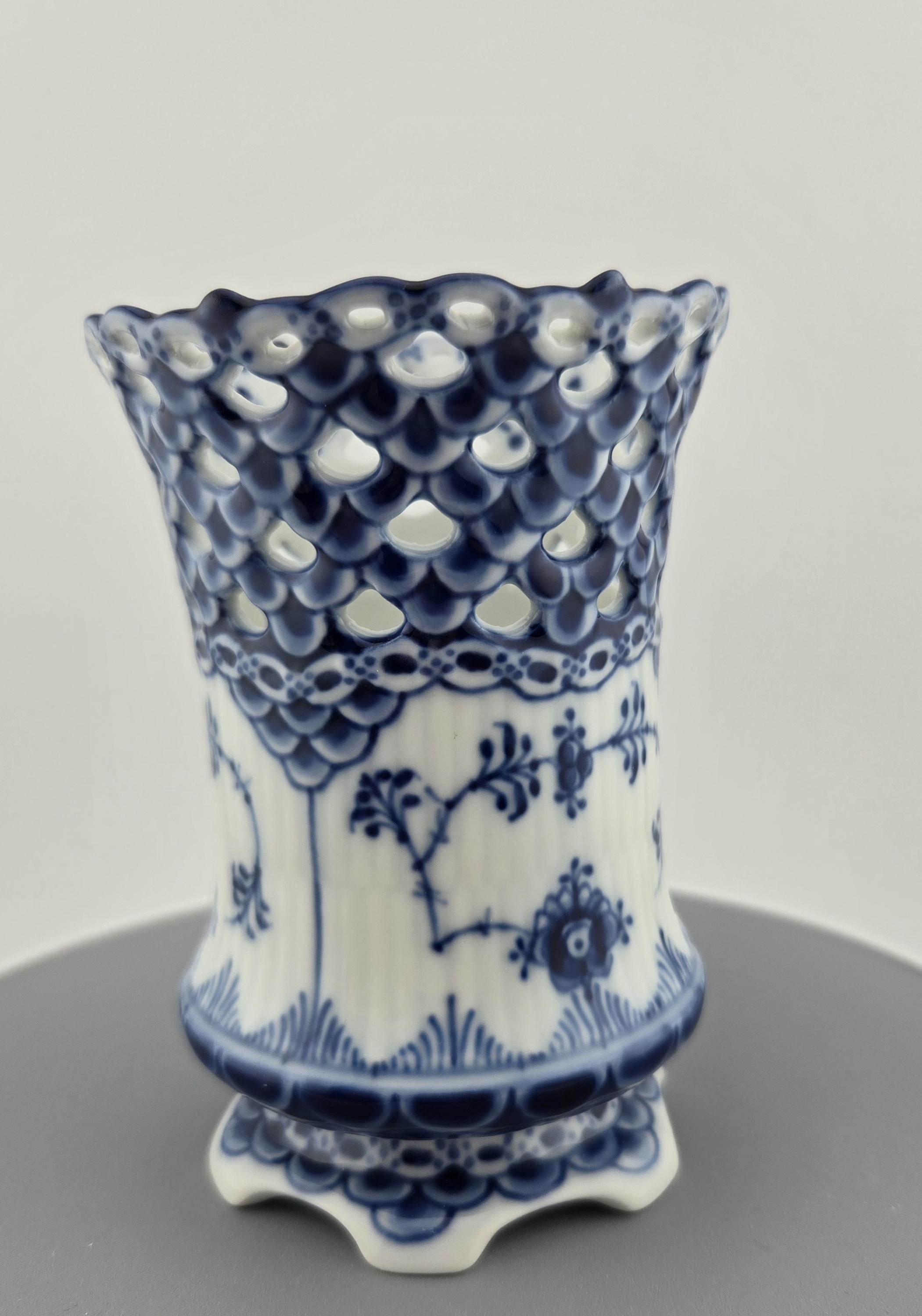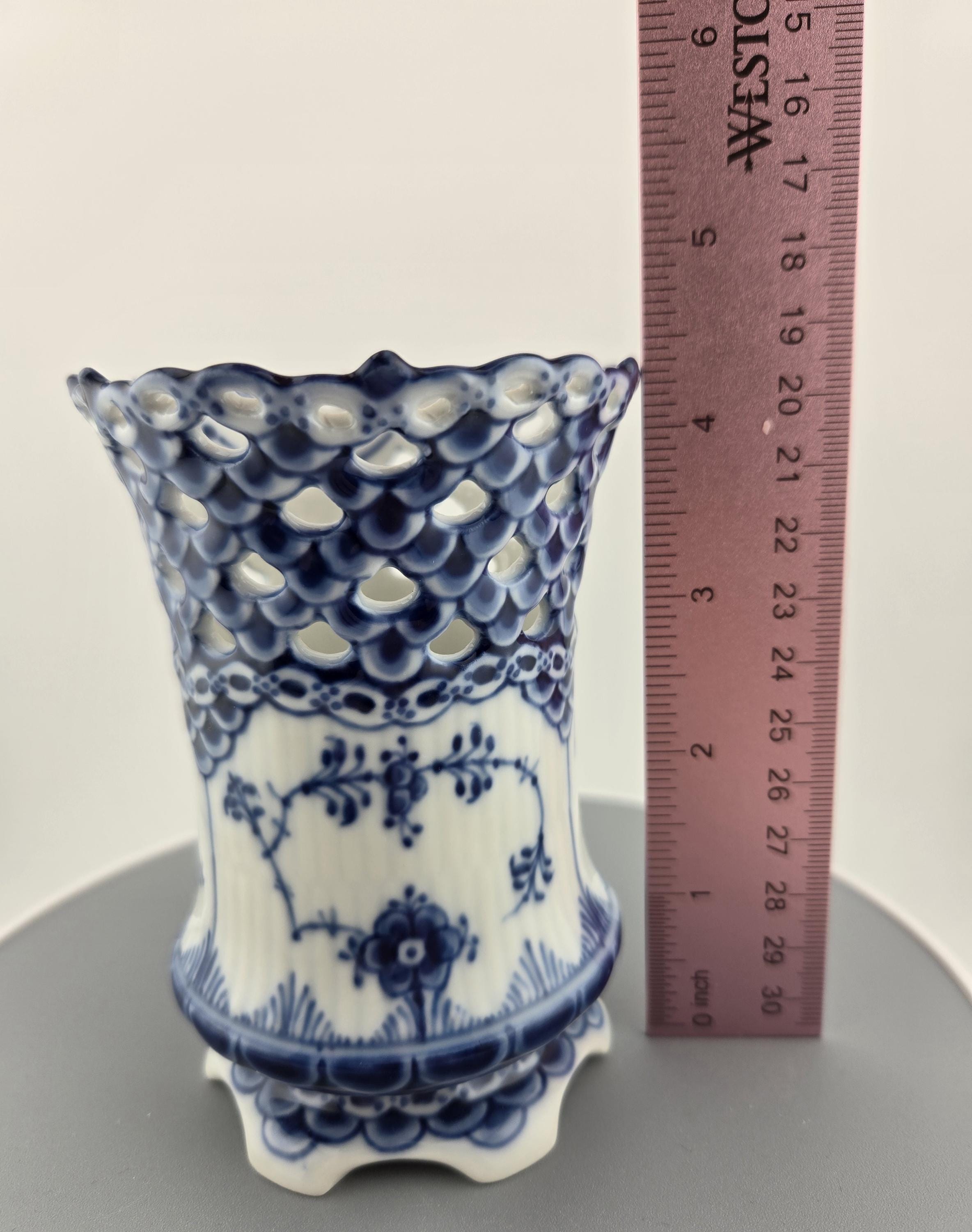 A timeless example of Danish porcelain artistry. This Royal Copenhagen Blue Fluted Full Lace vase, model 1016, showcases the brand’s iconic hand-painted cobalt blue floral design with intricate openwork detailing along the upper rim. Standing approximately 4.75 inches tall, it exemplifies the precision and beauty of 20th-century Scandinavian craftsmanship.
