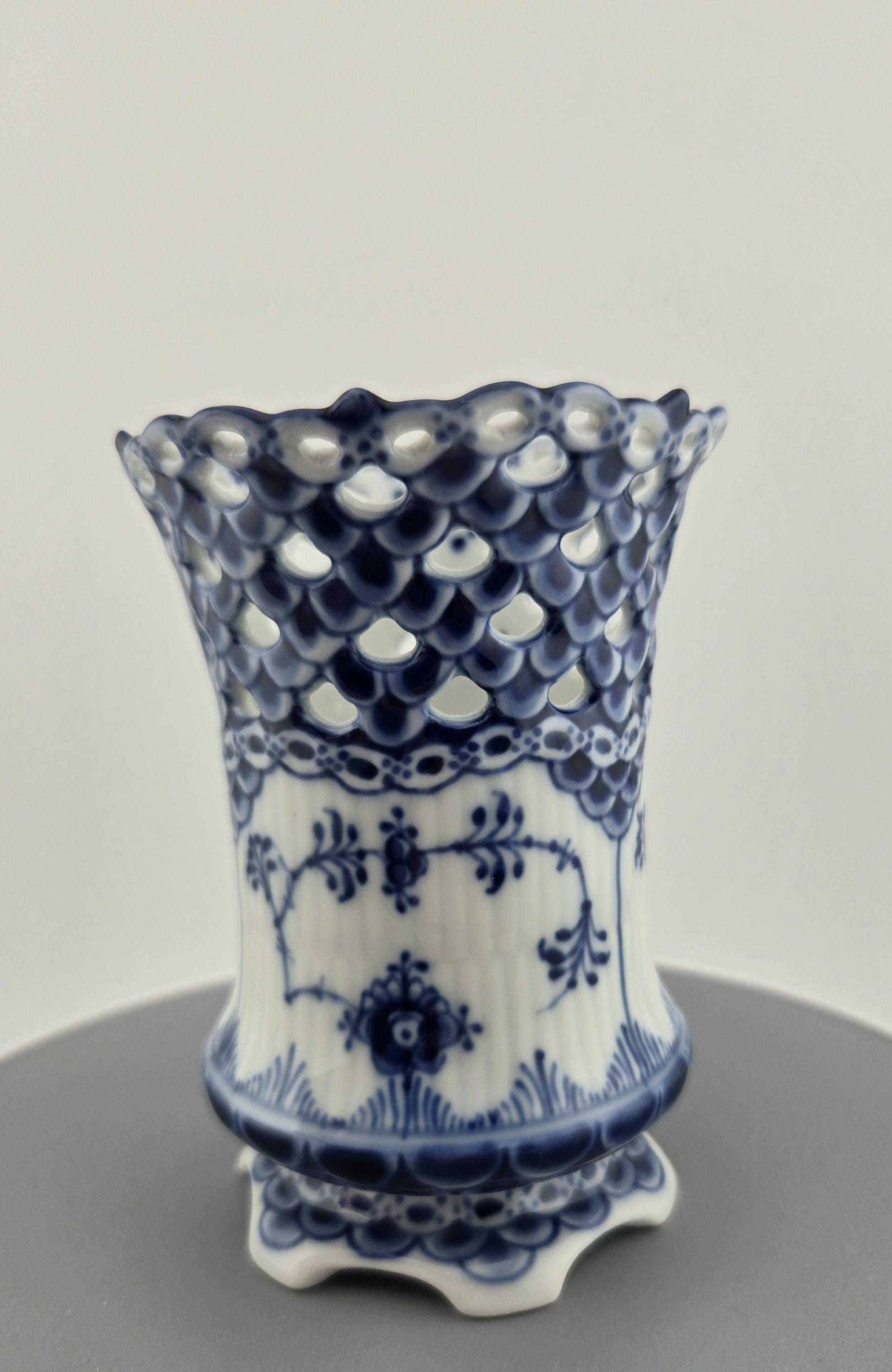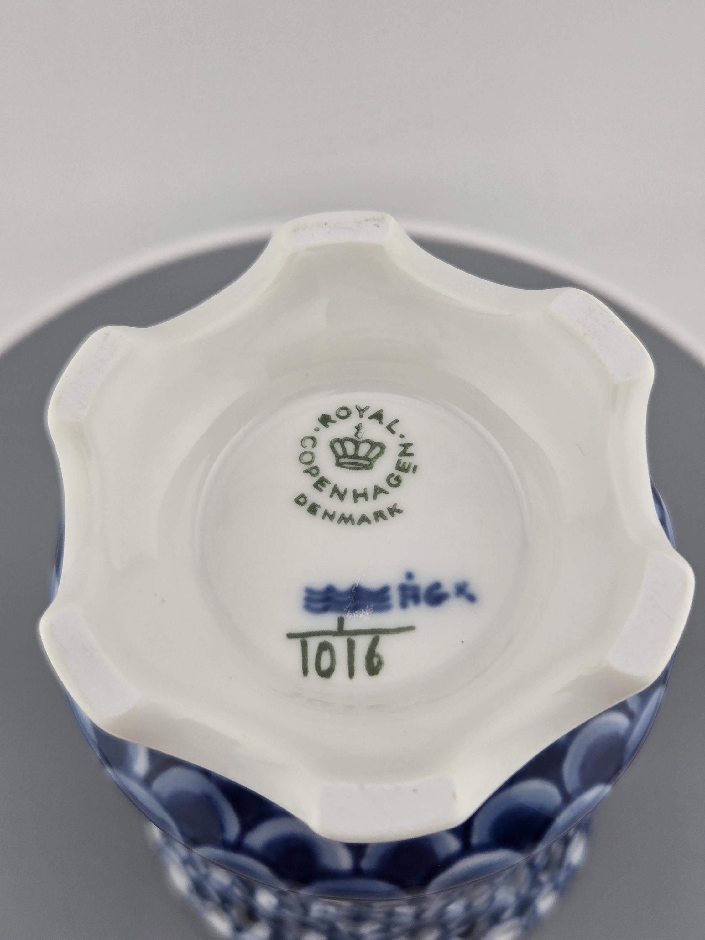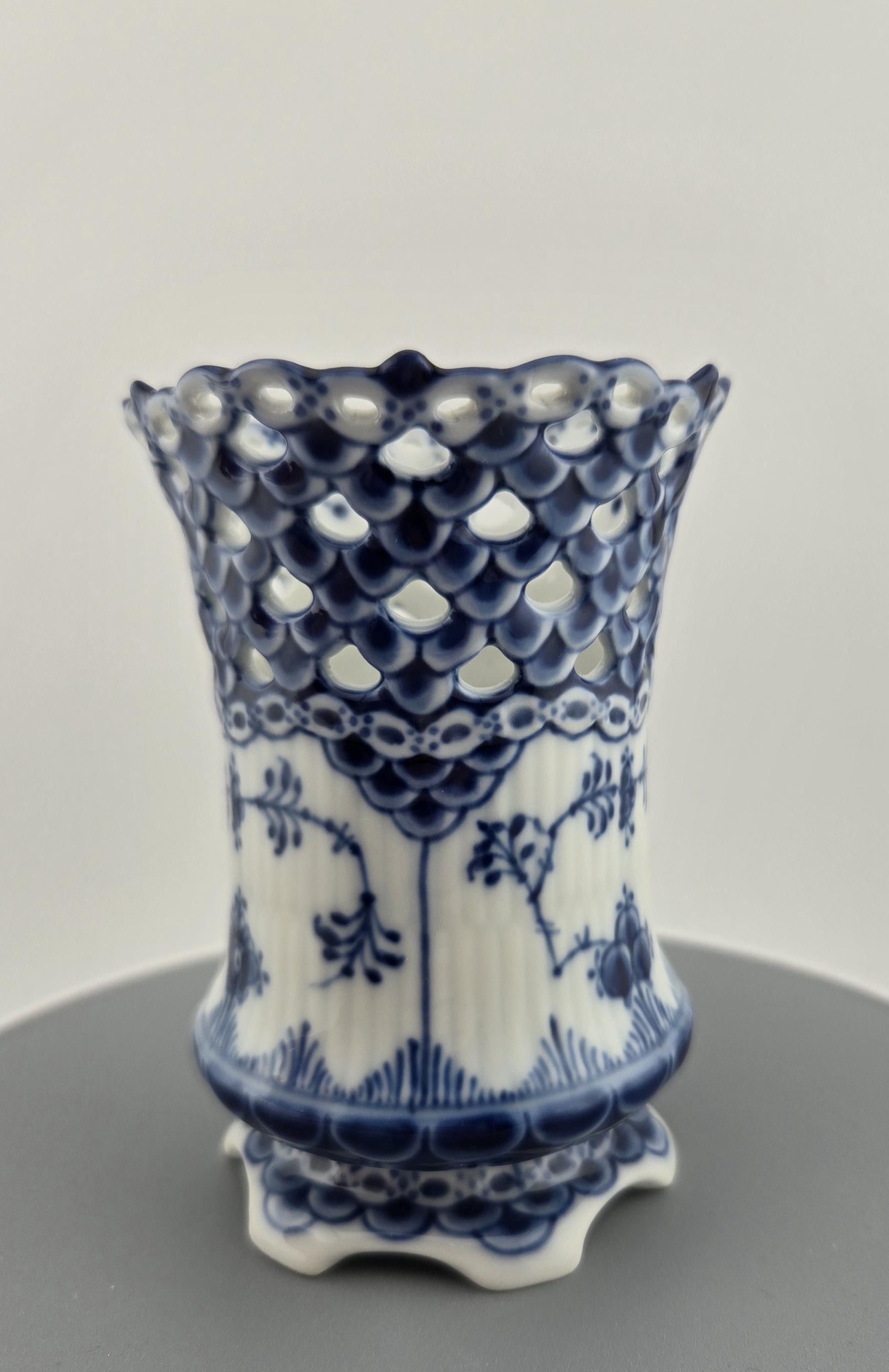 A timeless example of Danish porcelain artistry. This Royal Copenhagen Blue Fluted Full Lace vase, model 1016, showcases the brand’s iconic hand-painted cobalt blue floral design with intricate openwork detailing along the upper rim. Standing approximately 4.75 inches tall, it exemplifies the precision and beauty of 20th-century Scandinavian craftsmanship.