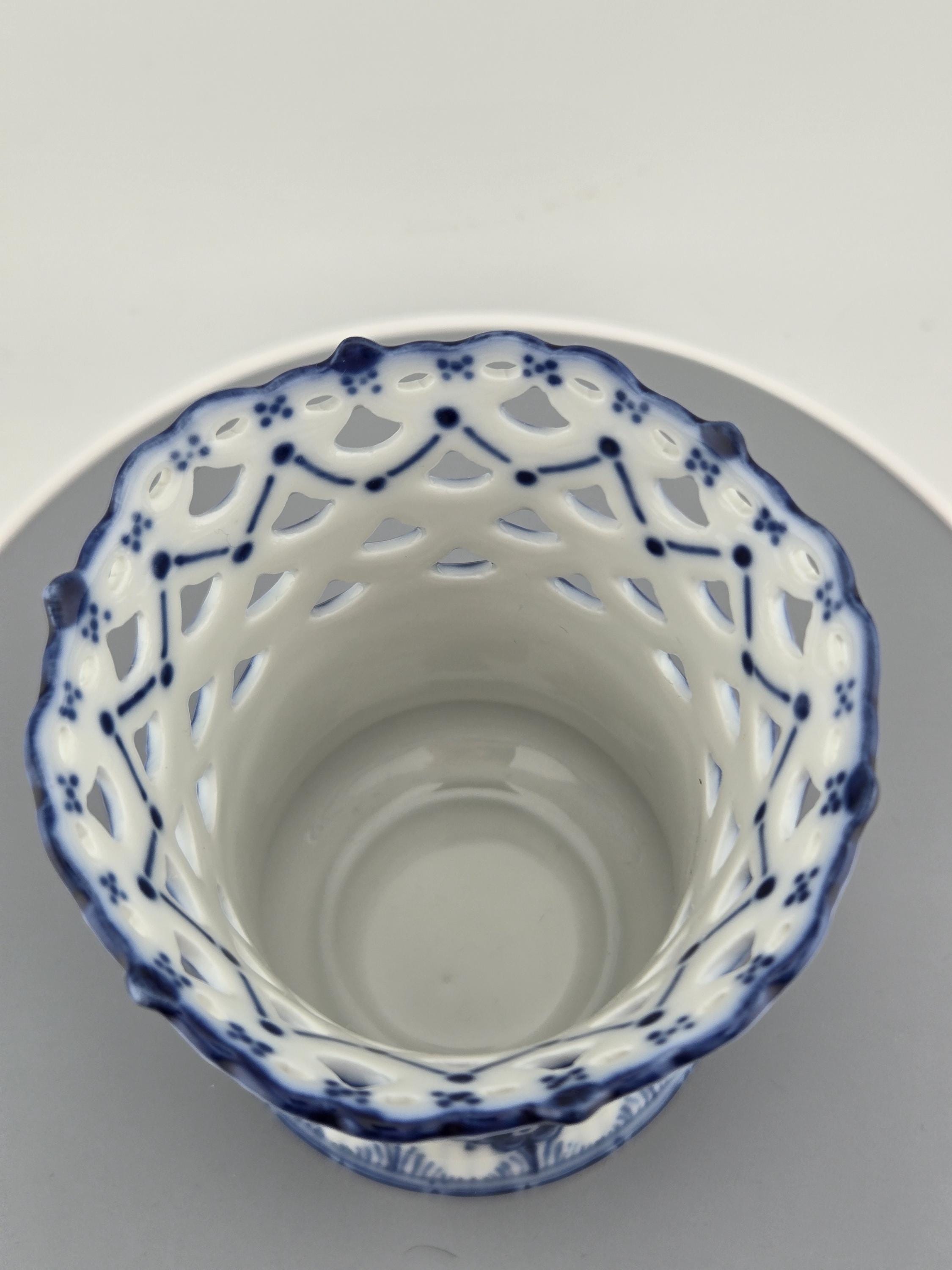 Each delicate lattice opening is hand-pierced before firing, creating a lace-like effect that pairs beautifully with the scalloped base and fluted body. The deep cobalt floral motifs, applied entirely by hand, bring elegant contrast to the crisp white porcelain.