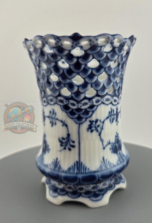 Bearing the Royal Copenhagen hallmark with painter’s initials and the traditional three wavy blue lines (symbolizing Denmark’s waterways), this piece reflects the esteemed “Full Lace” series — among the most intricate and sought-after of Royal Copenhagen’s Blue Fluted patterns.
