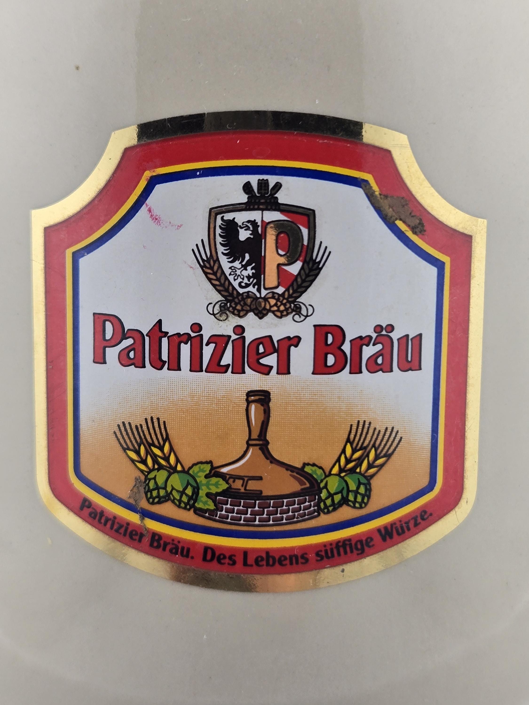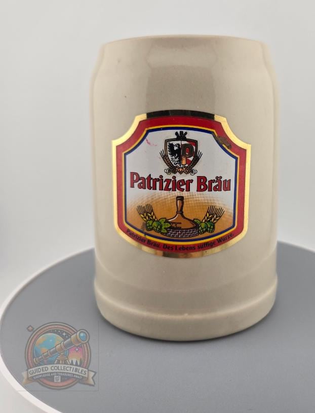 This vintage Patrizier Bräu stoneware beer stein was crafted in 1989 by Rastal in Höhr-Grenzhausen, Germany—renowned for their precision-made brewery mugs and collectible steins. Made from high-quality ceramic stoneware, it features the classic Patrizier Bräu brewery logo in rich red, gold, and black enamel tones, with barley and hops motif and the brewery’s slogan, “Des Lebens süffige Würze” (“The savory spice of life”).