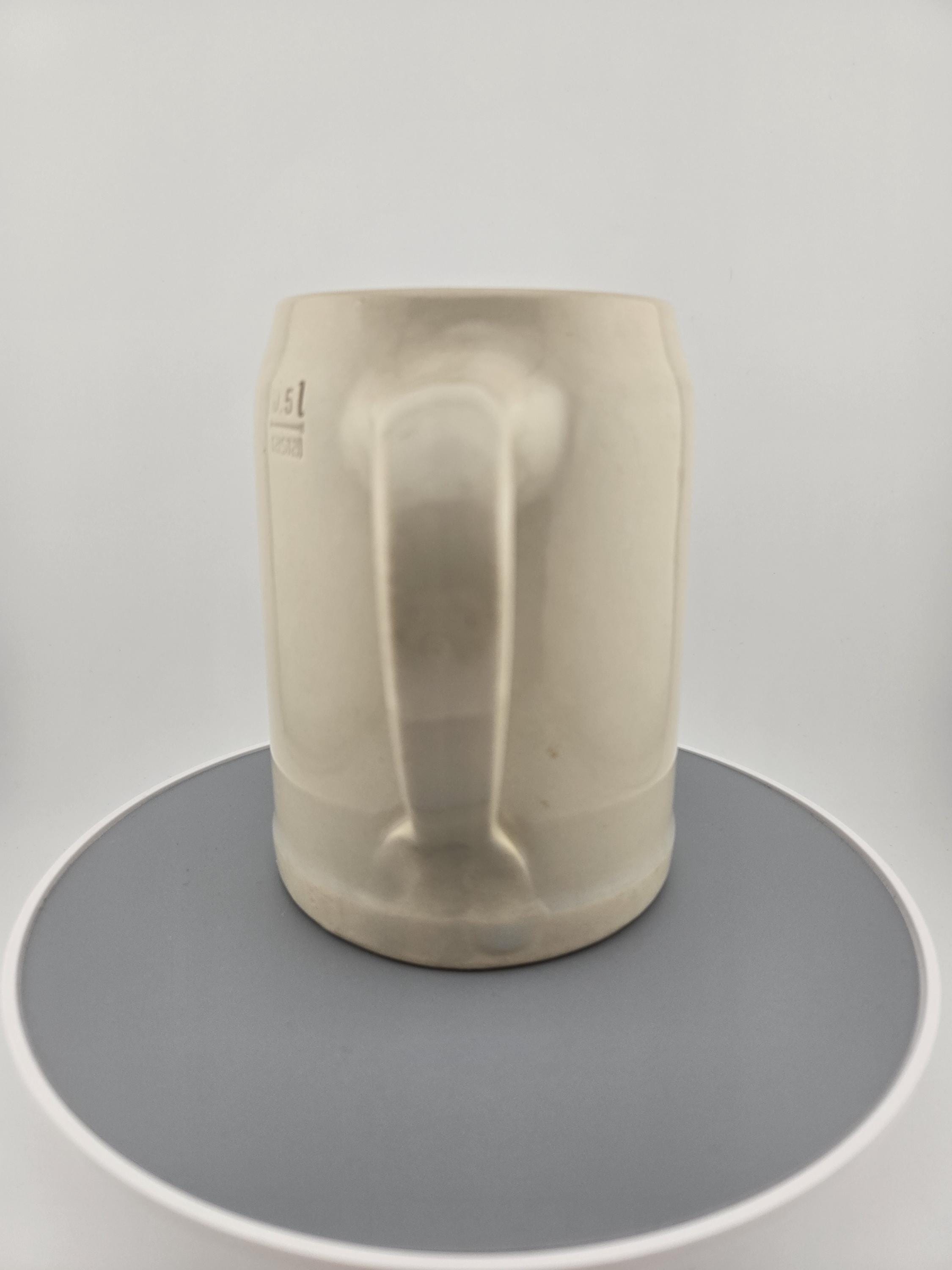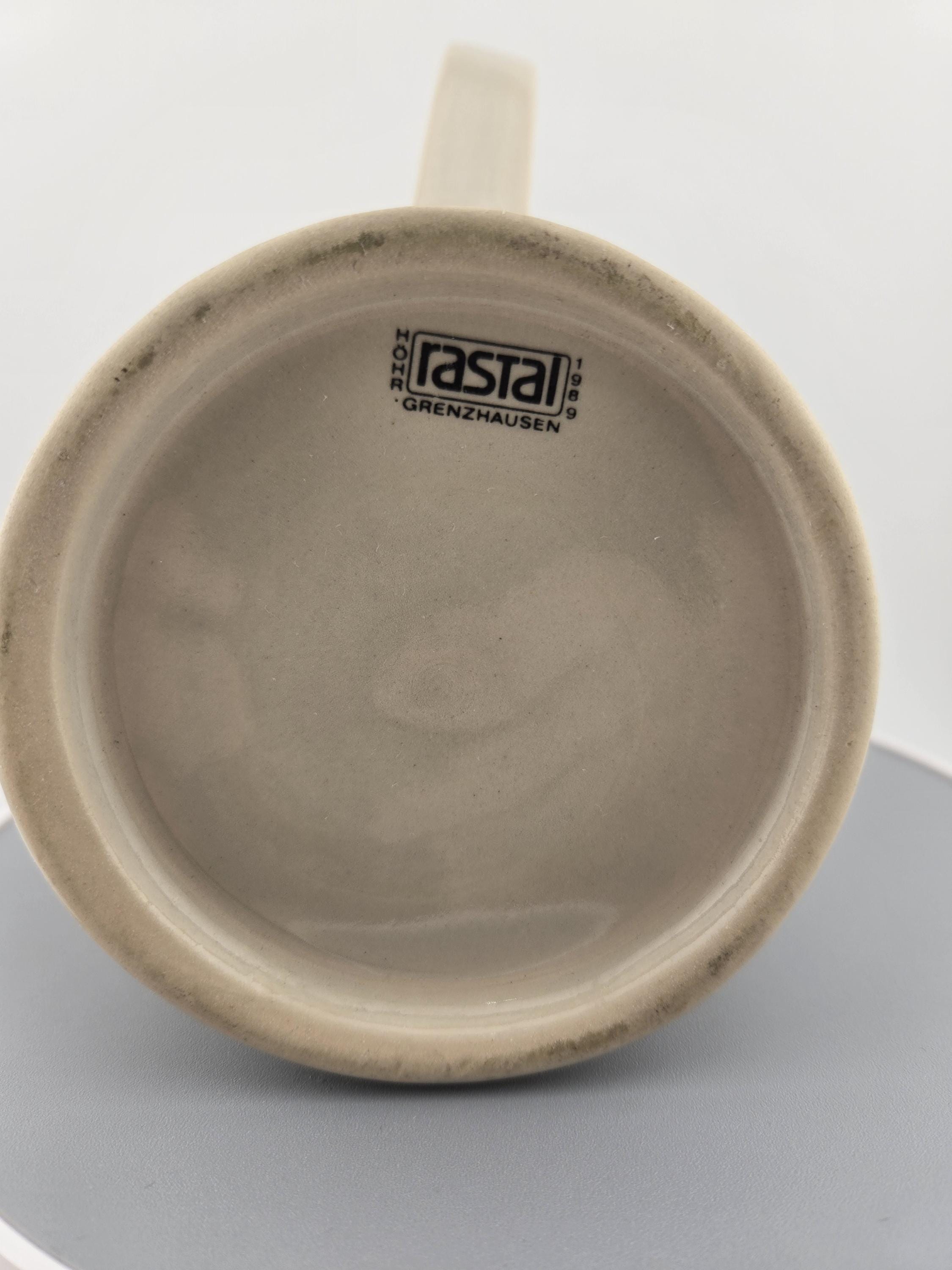 The interior is glazed for durability, while the exterior retains its traditional matte finish typical of Rastal’s late 20th-century production. The handle is sturdy and well-balanced, making it perfect for both display and practical use. The embossed 0.5L capacity mark and stamped Rastal Grenzhausen 1989 hallmark authenticate its origin and quality.