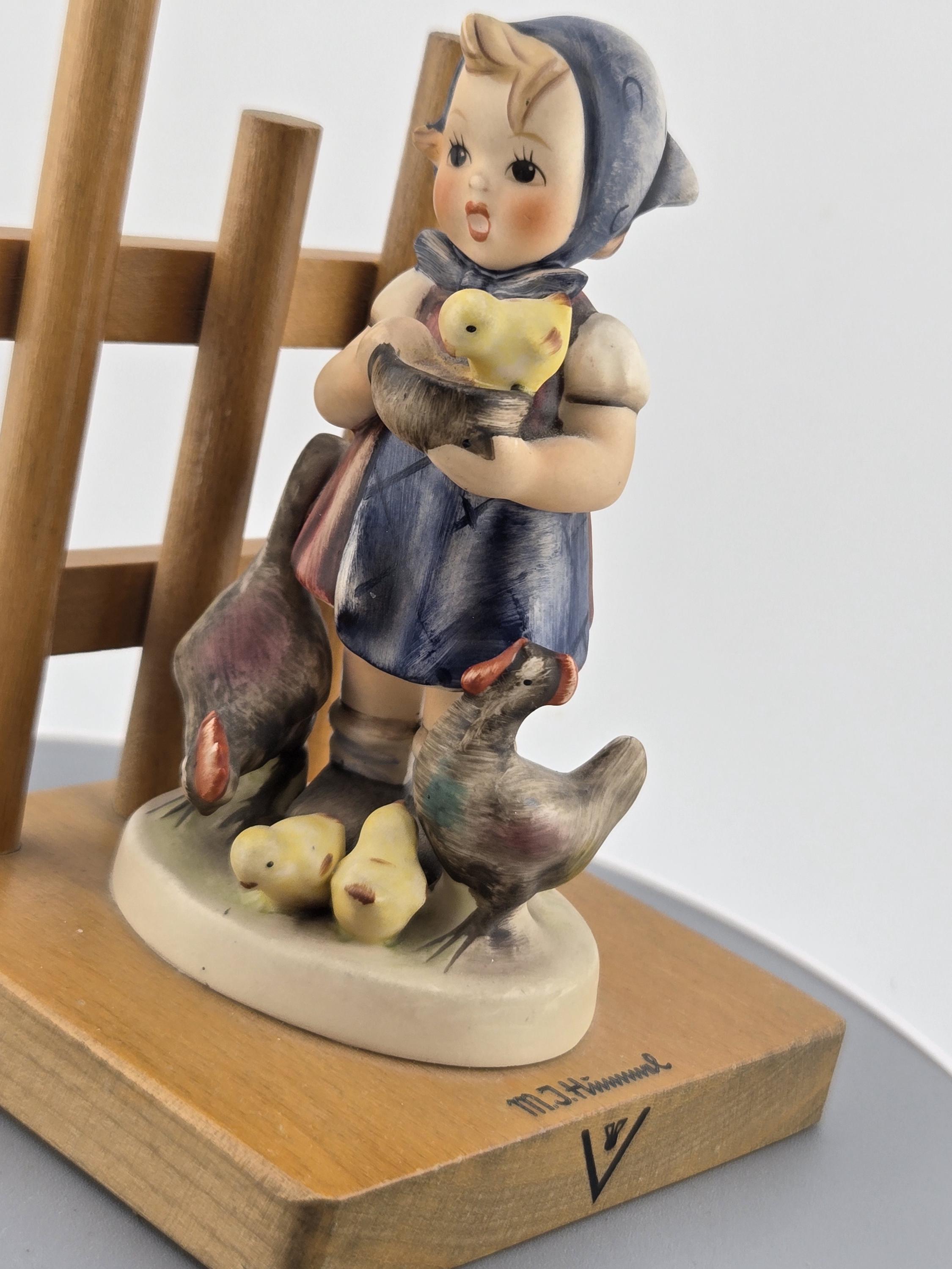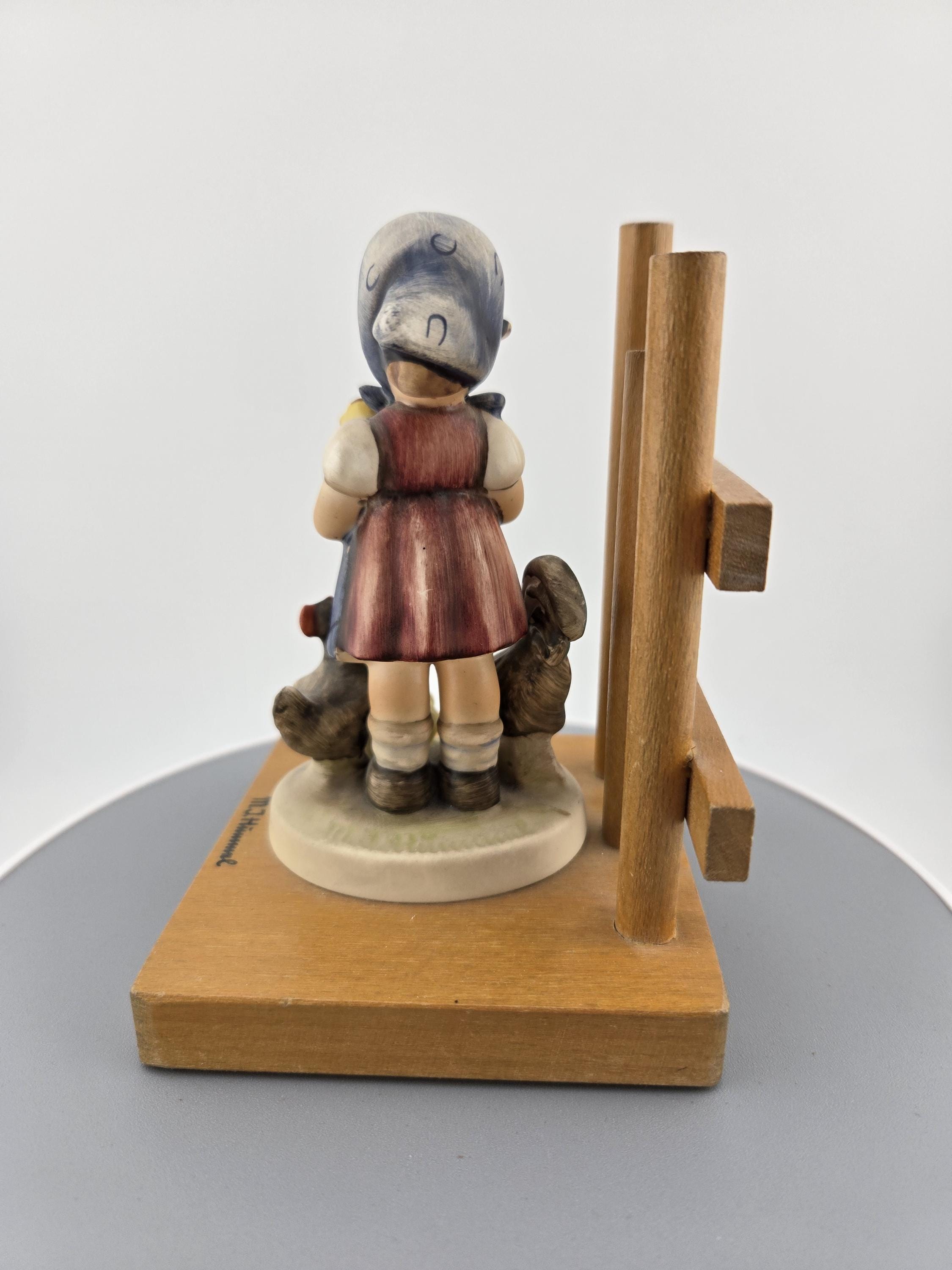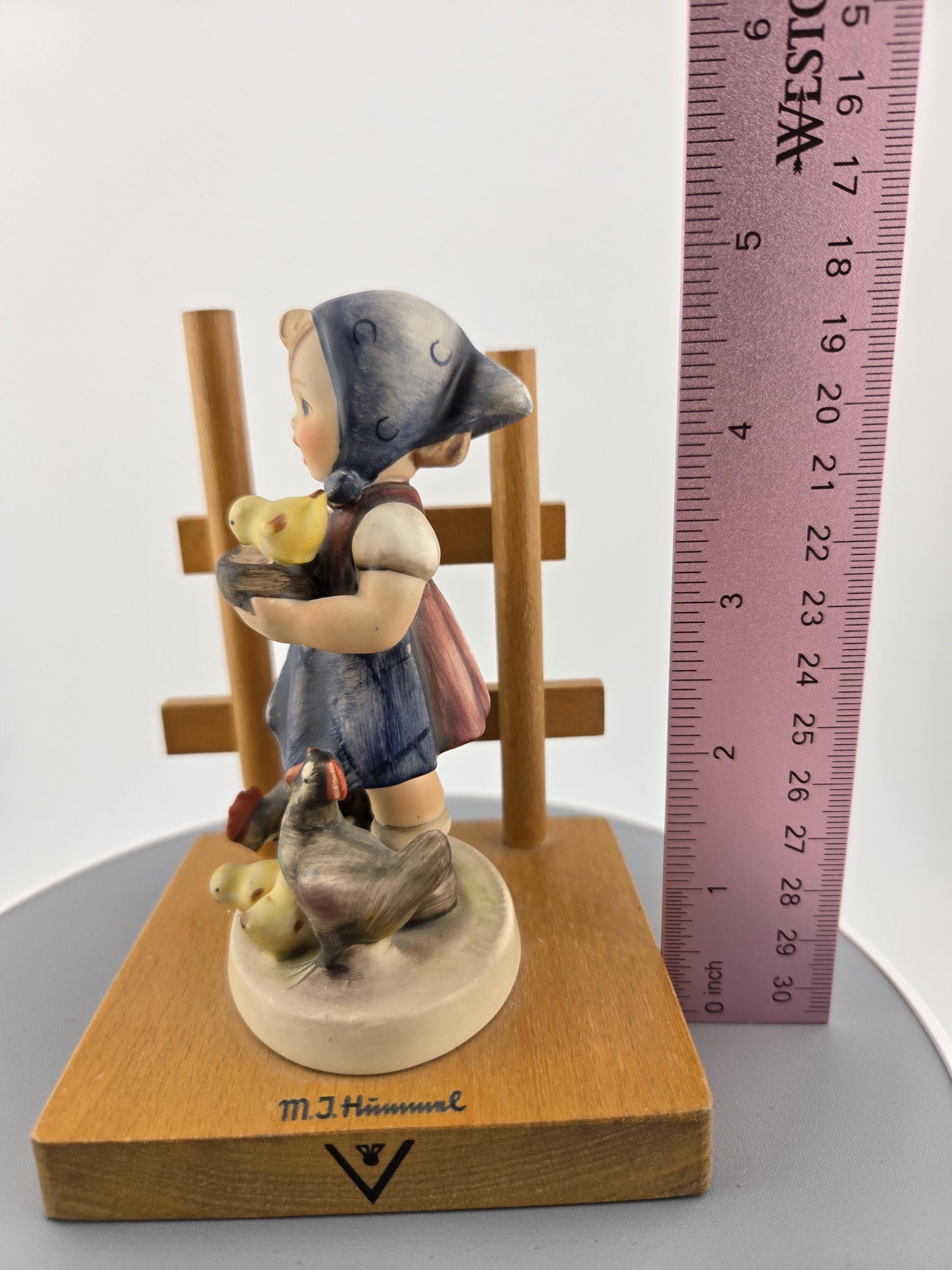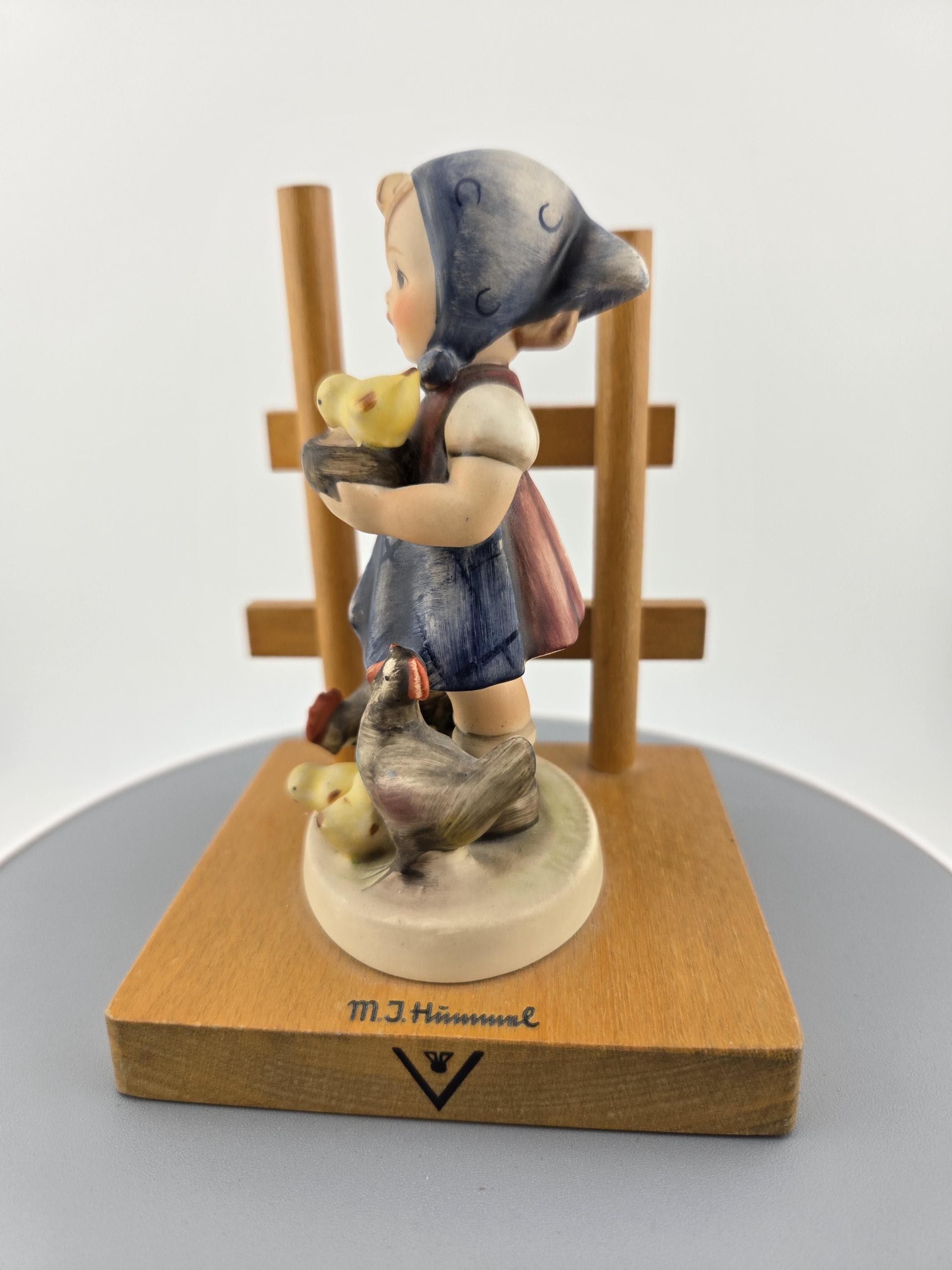 Details: Height: approx. 5 inches Base: solid wood with trellis design Finish: hand-painted with matte glaze Markings: “M.I. Hummel” signature, Goebel bee mark TMK-5, “Feeding Time” 🇩🇪 Made in West Germany