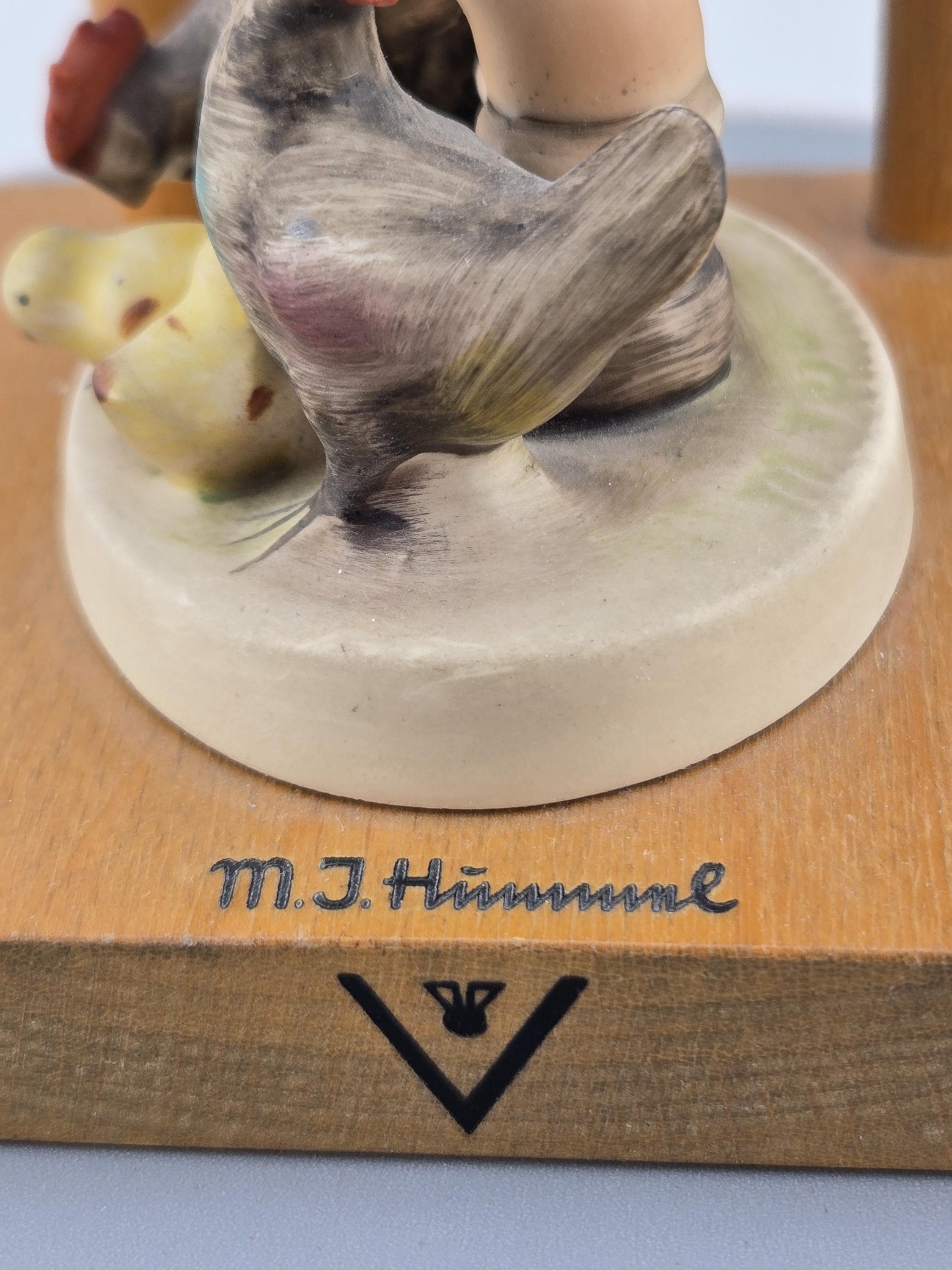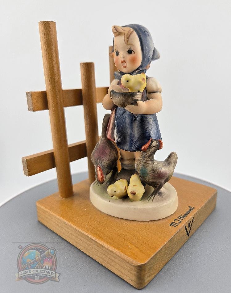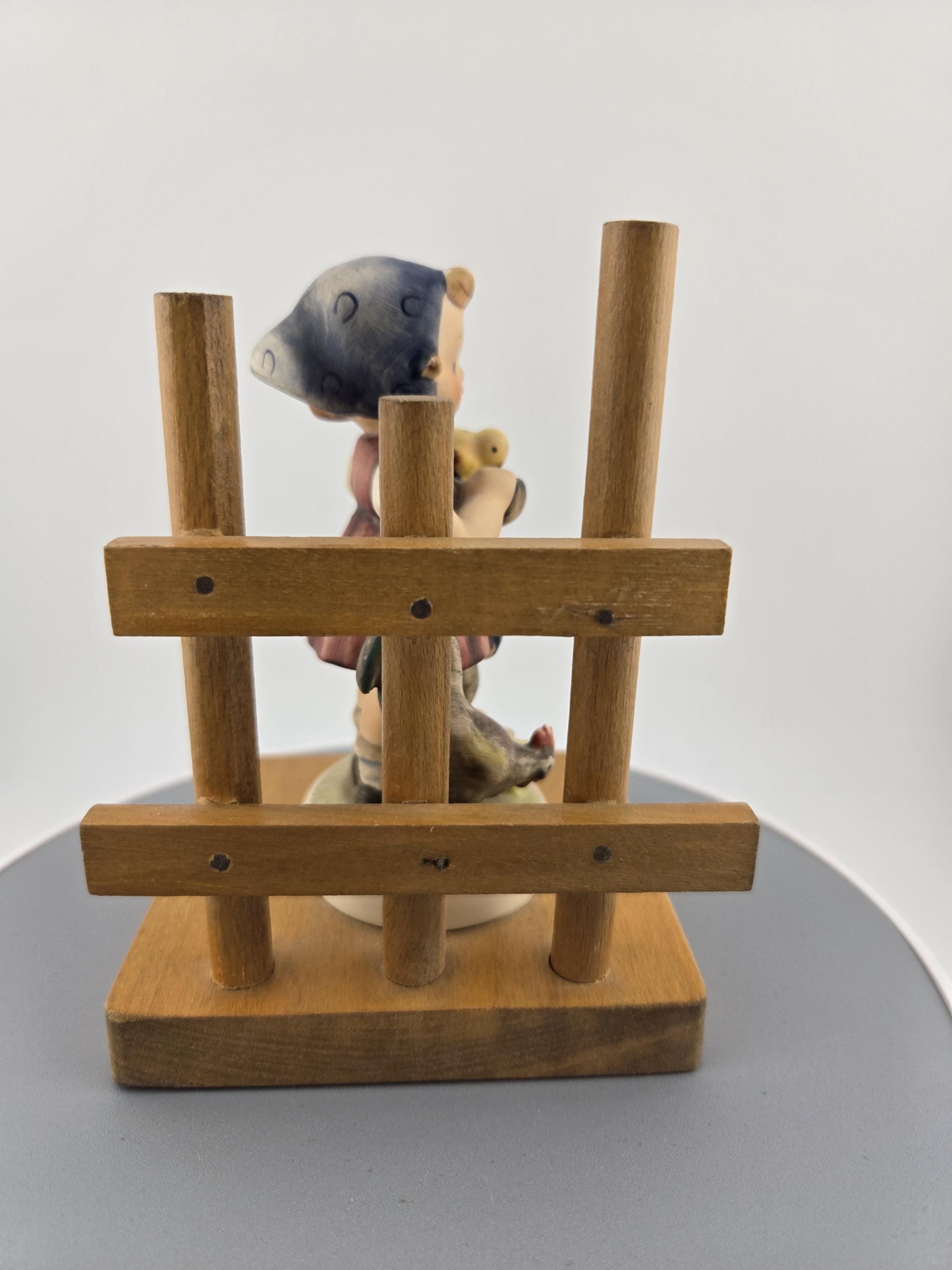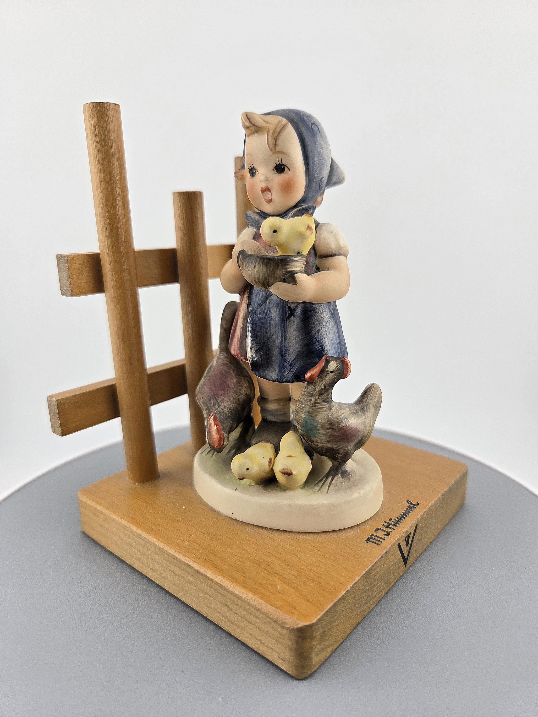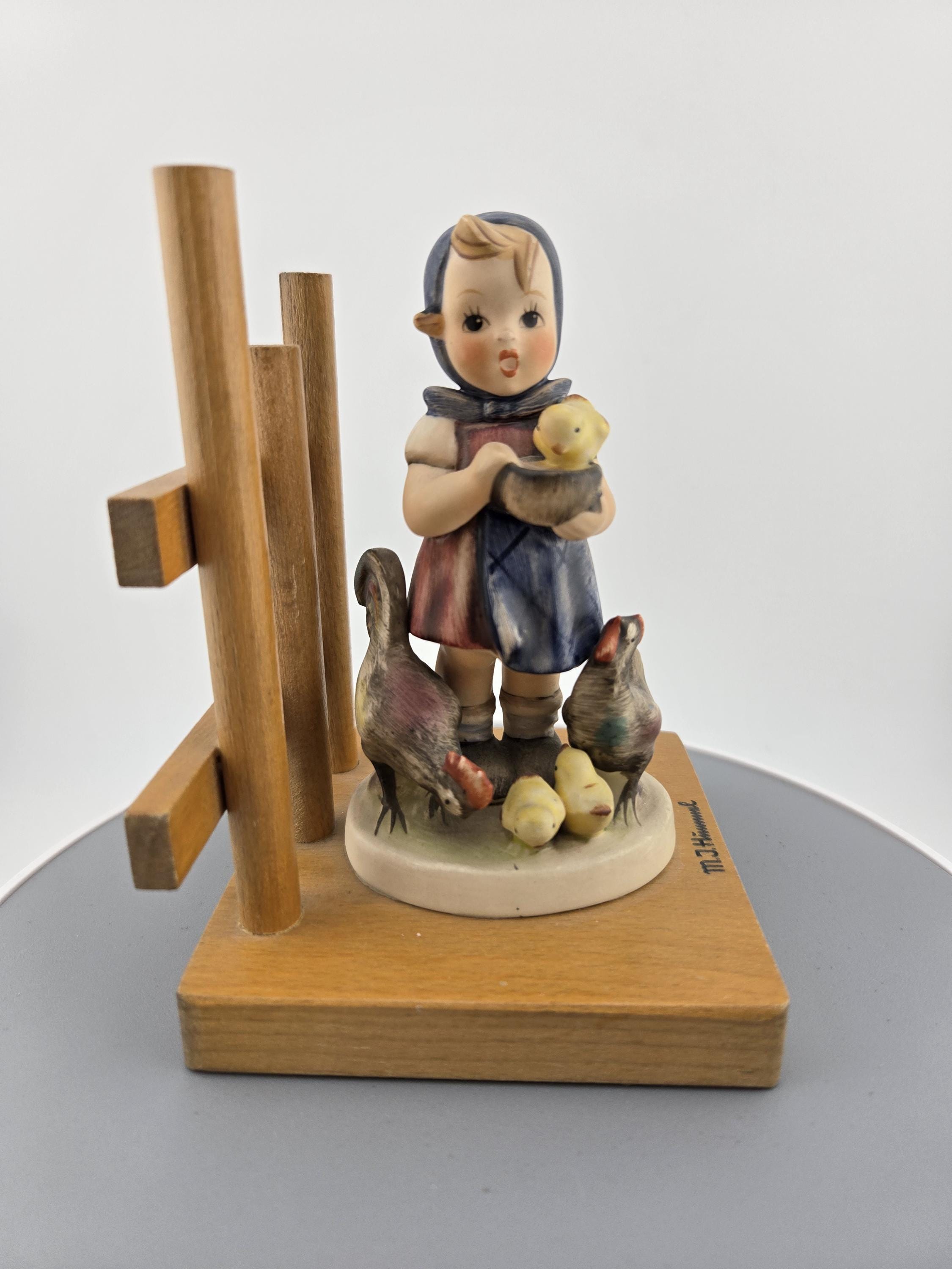 Details: Height: approx. 5 inches Base: solid wood with trellis design Finish: hand-painted with matte glaze Markings: “M.I. Hummel” signature, Goebel bee mark TMK-5, “Feeding Time” 🇩🇪 Made in West Germany