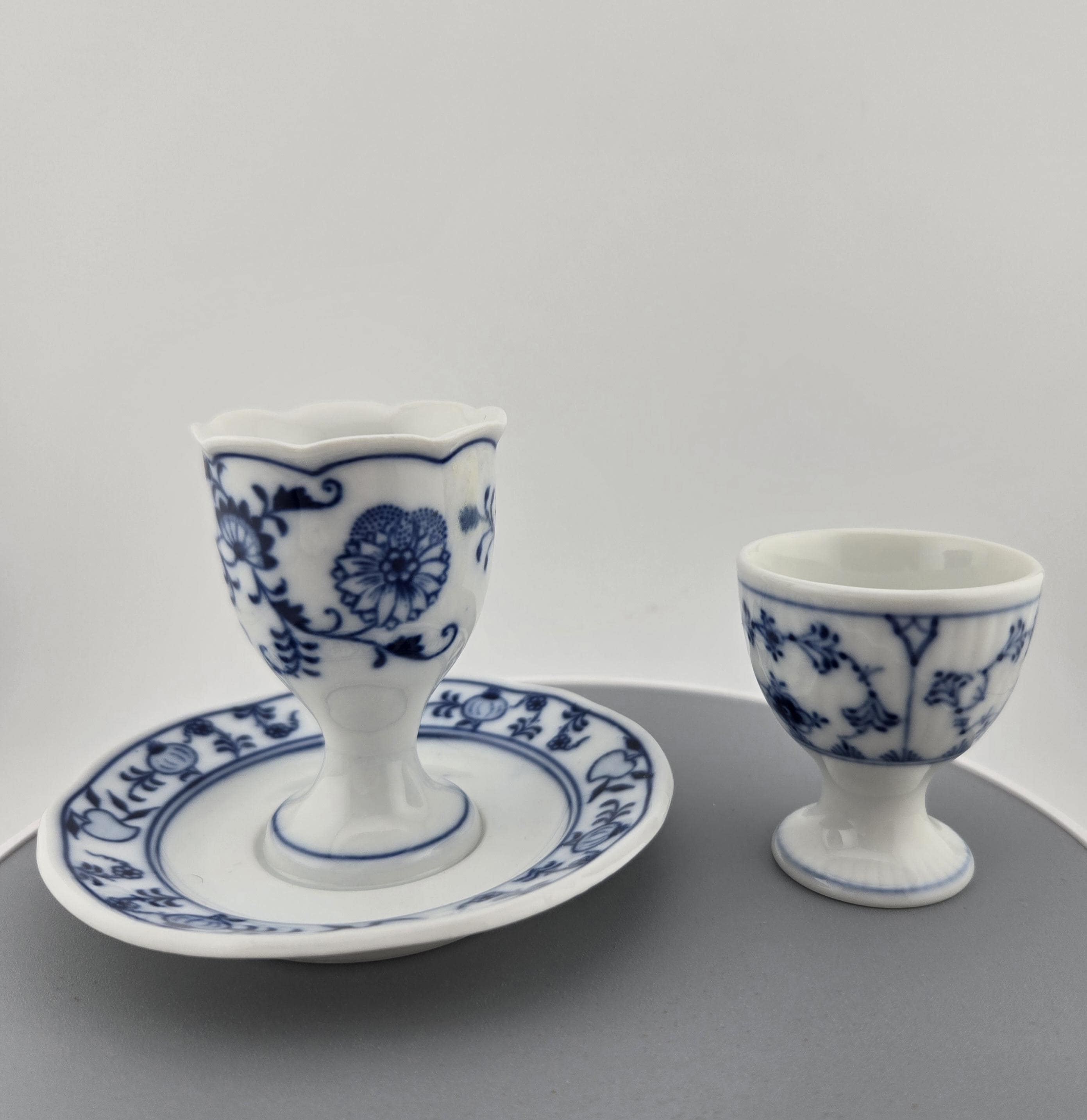 Royal Copenhagen Blue Fluted egg coddler set, hand-painted in Denmark. Includes Half Lace and Plain designs—timeless Danish porcelain elegance. This exquisite set of two Royal Copenhagen porcelain egg coddlers showcases Denmark’s timeless Blue Fluted designs—a beloved hand-painted pattern first introduced in the 1770s. Crafted in fine white porcelain and hand-decorated in cobalt blue, this set includes one Blue Fluted Half Lace coddler with scalloped rim and matching saucer, and one Blue Fluted Plain coddler, both marked with the iconic Royal Copenhagen crown hallmark and the factory’s hand-painted wave signature.
