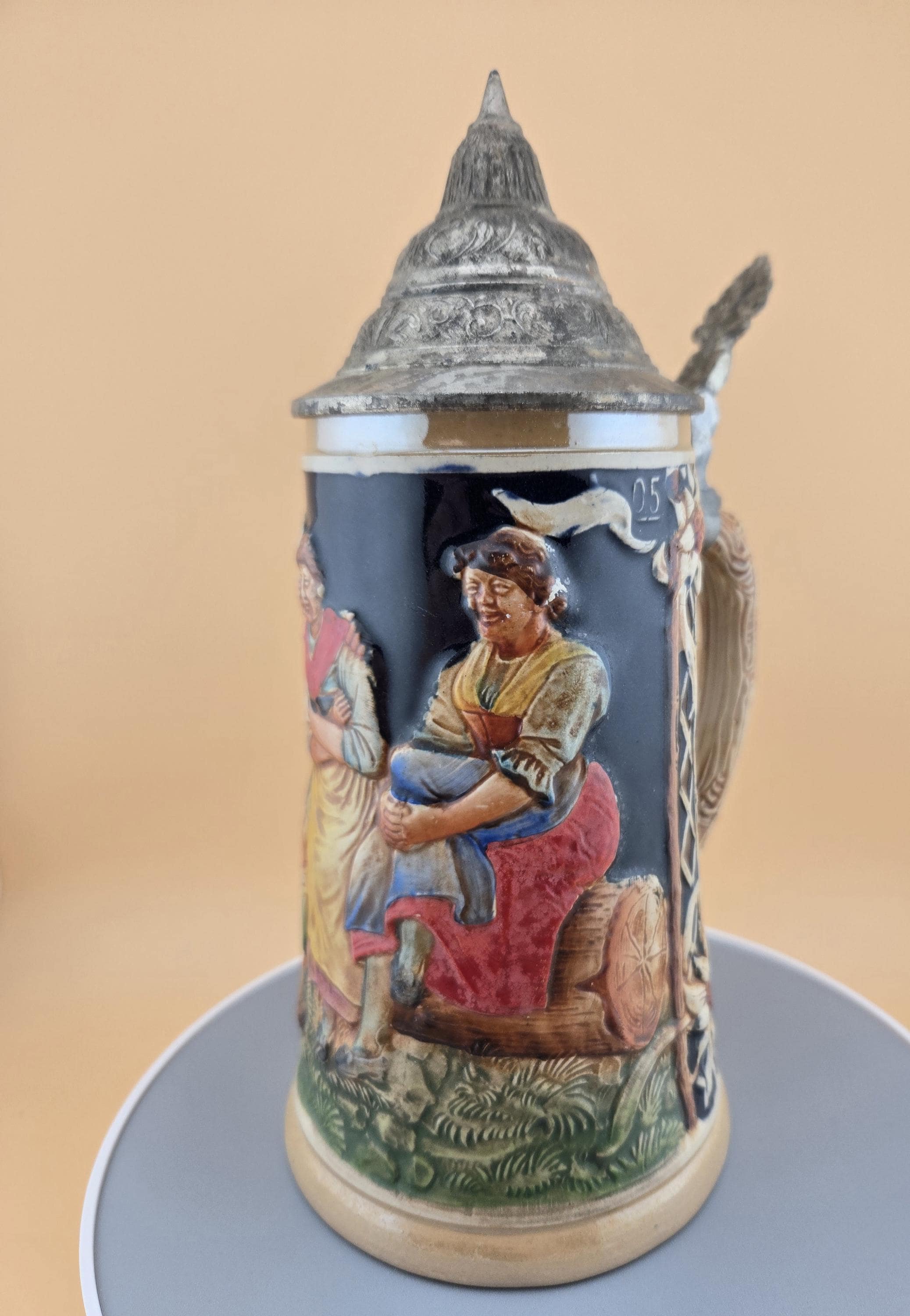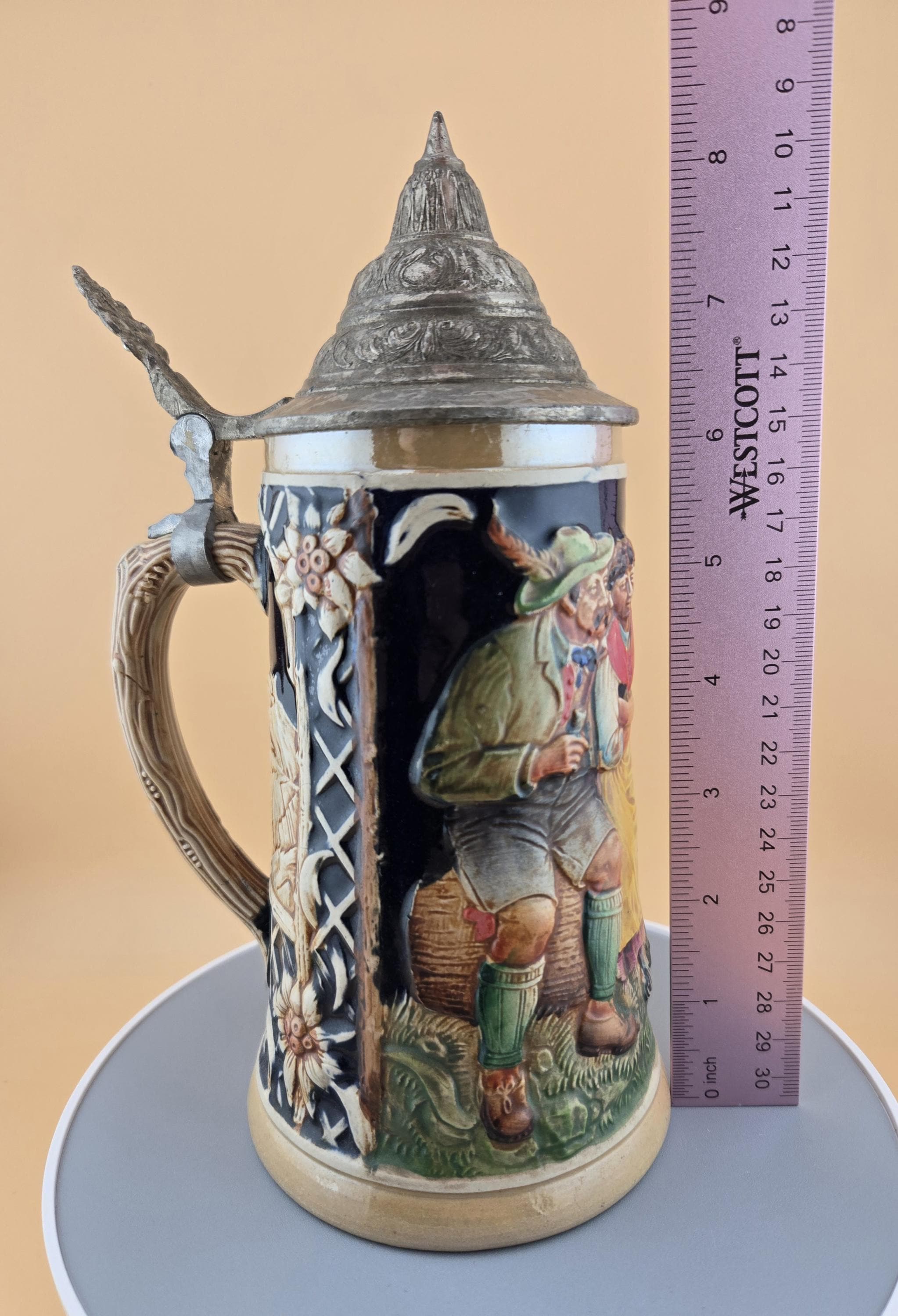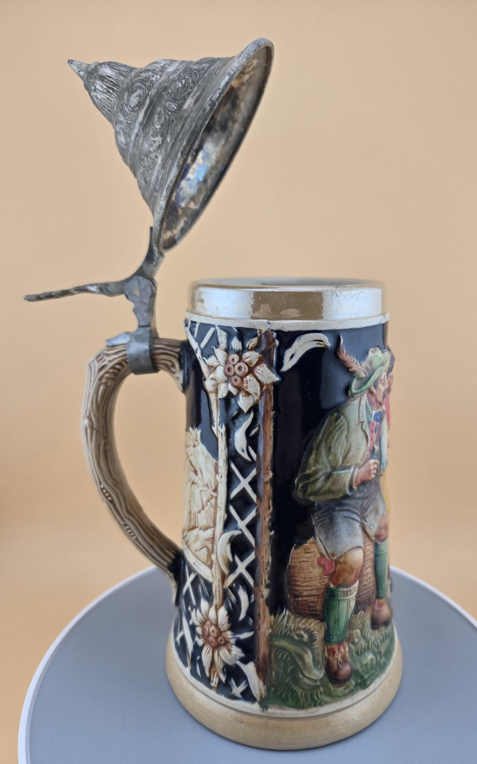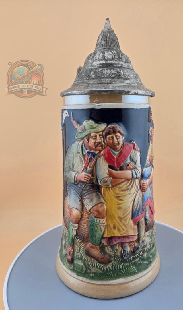 Authentic vintage German beer stein with pewter lid and hand-painted Bavarian scene — a classic collectible for beer lovers and Oktoberfest fans.