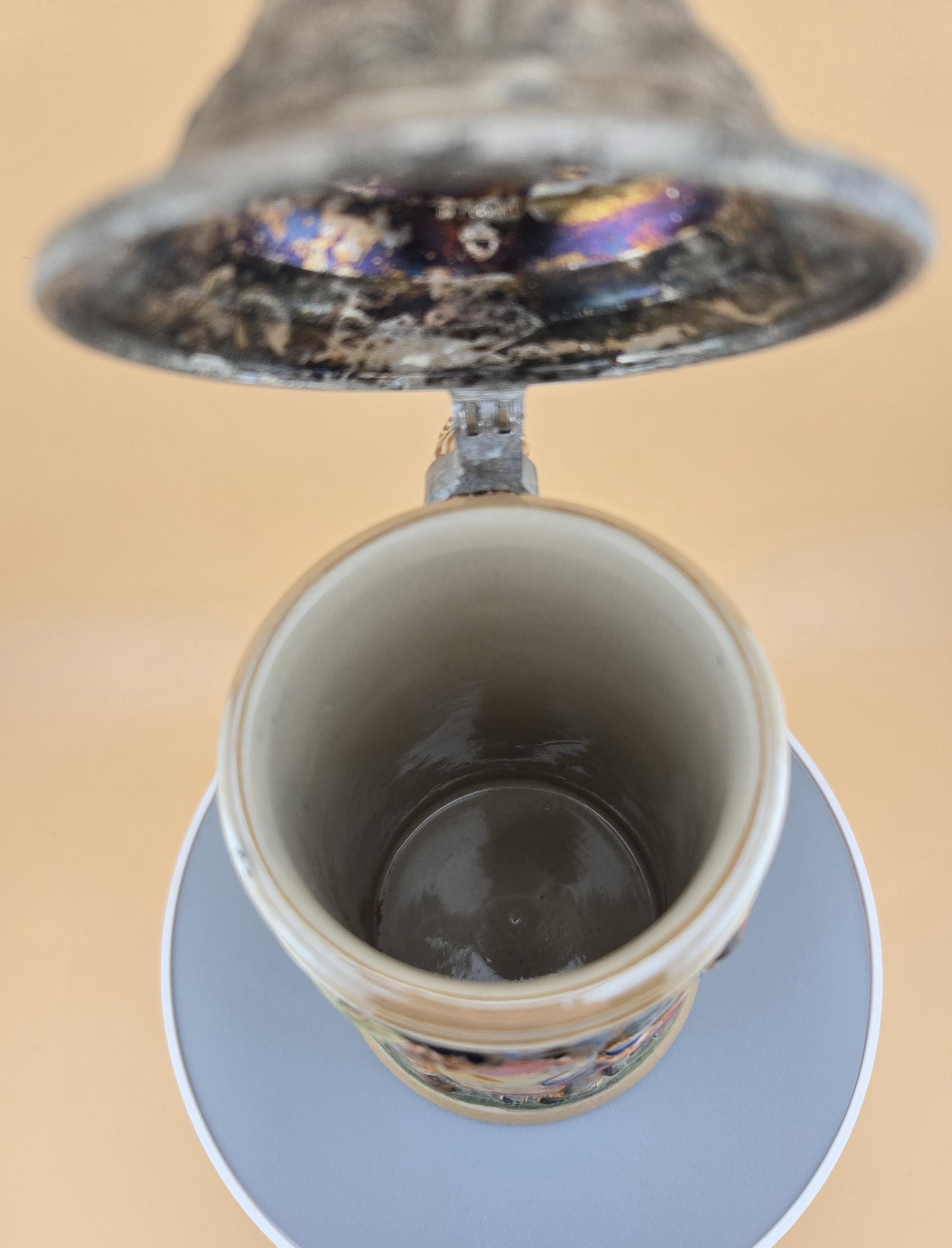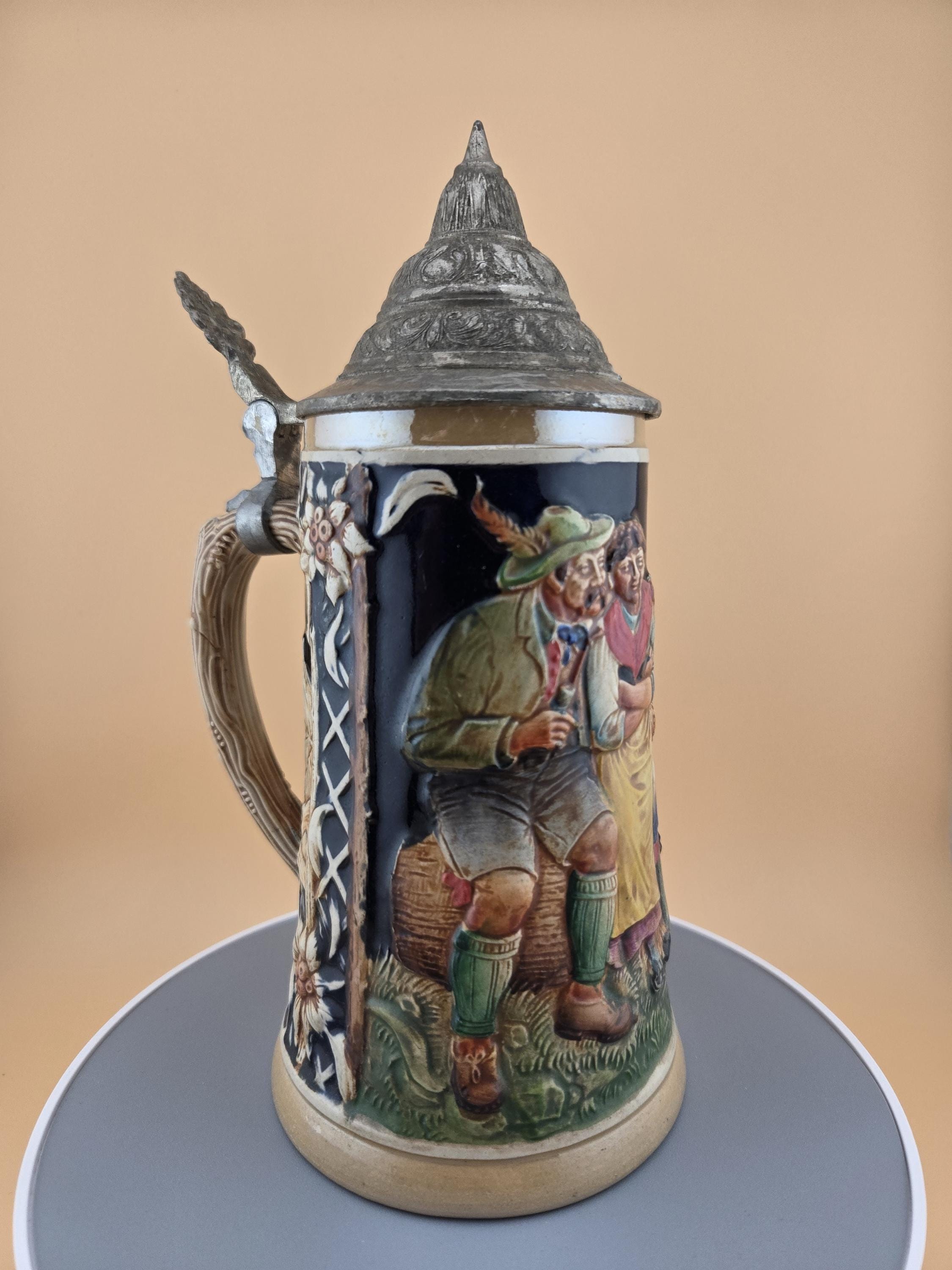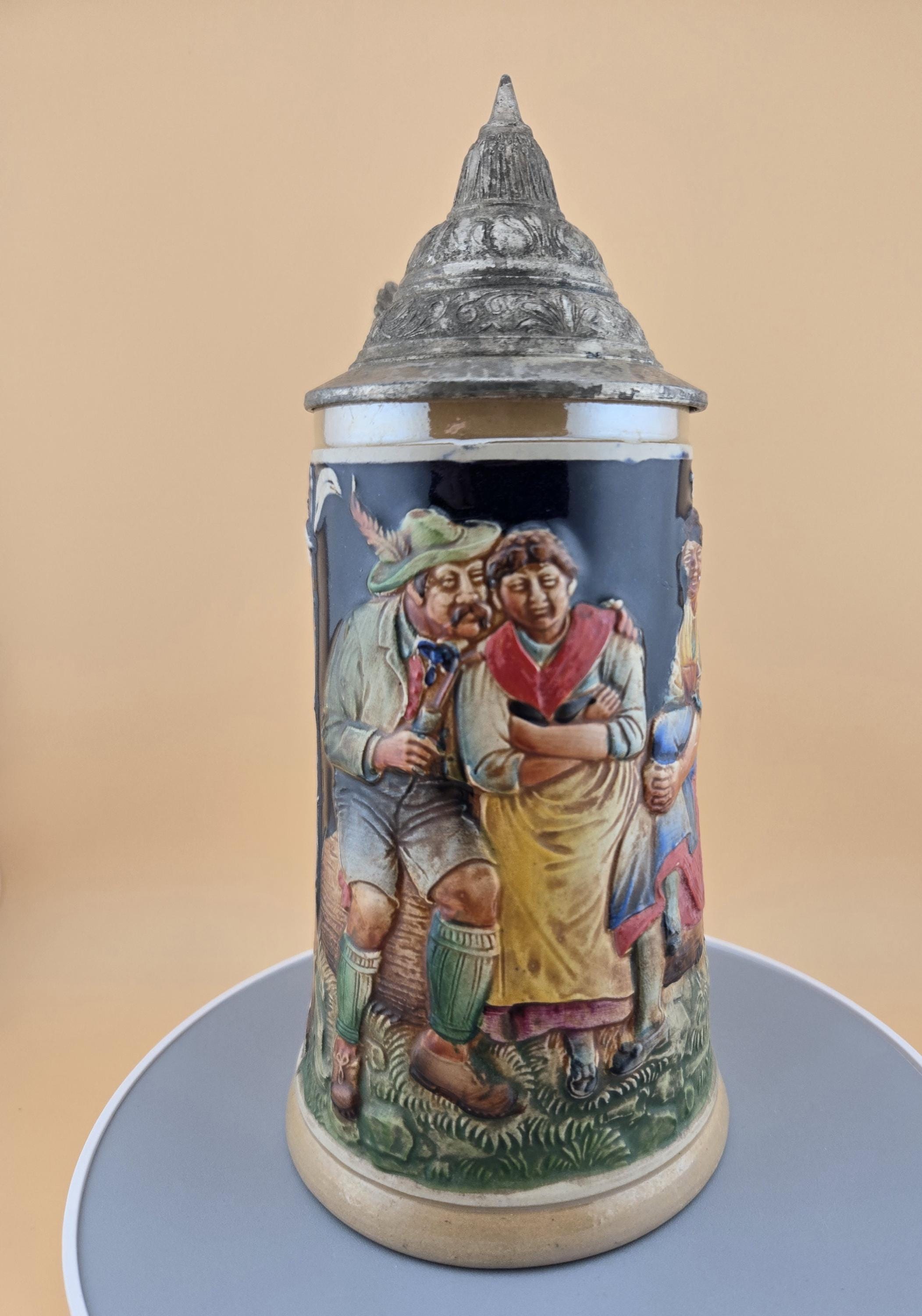 Authentic vintage German beer stein with pewter lid and hand-painted Bavarian scene — a classic collectible for beer lovers and Oktoberfest fans.
