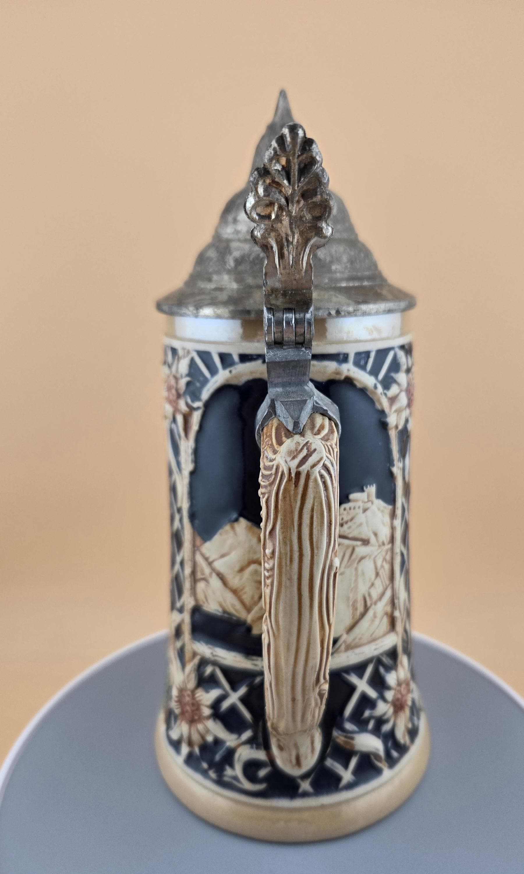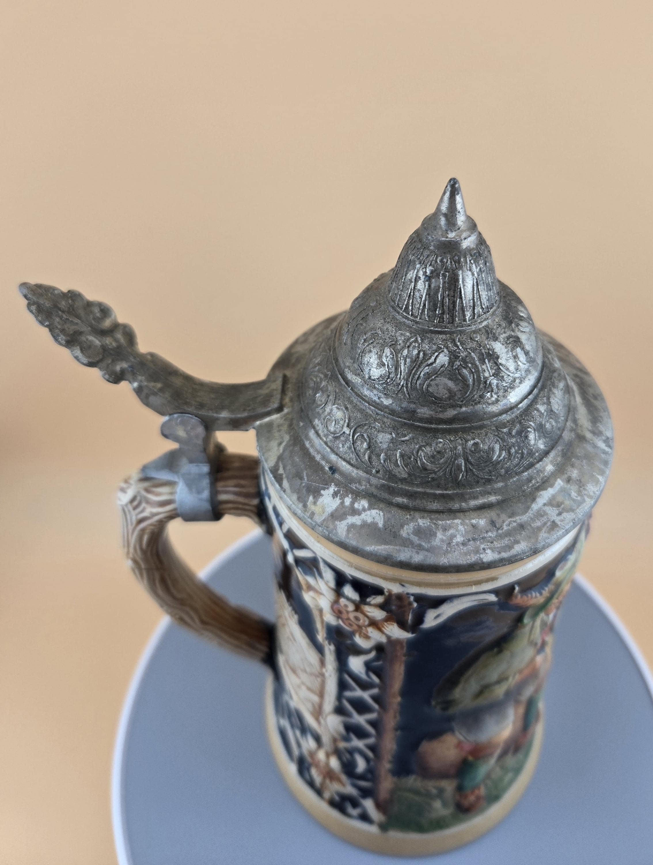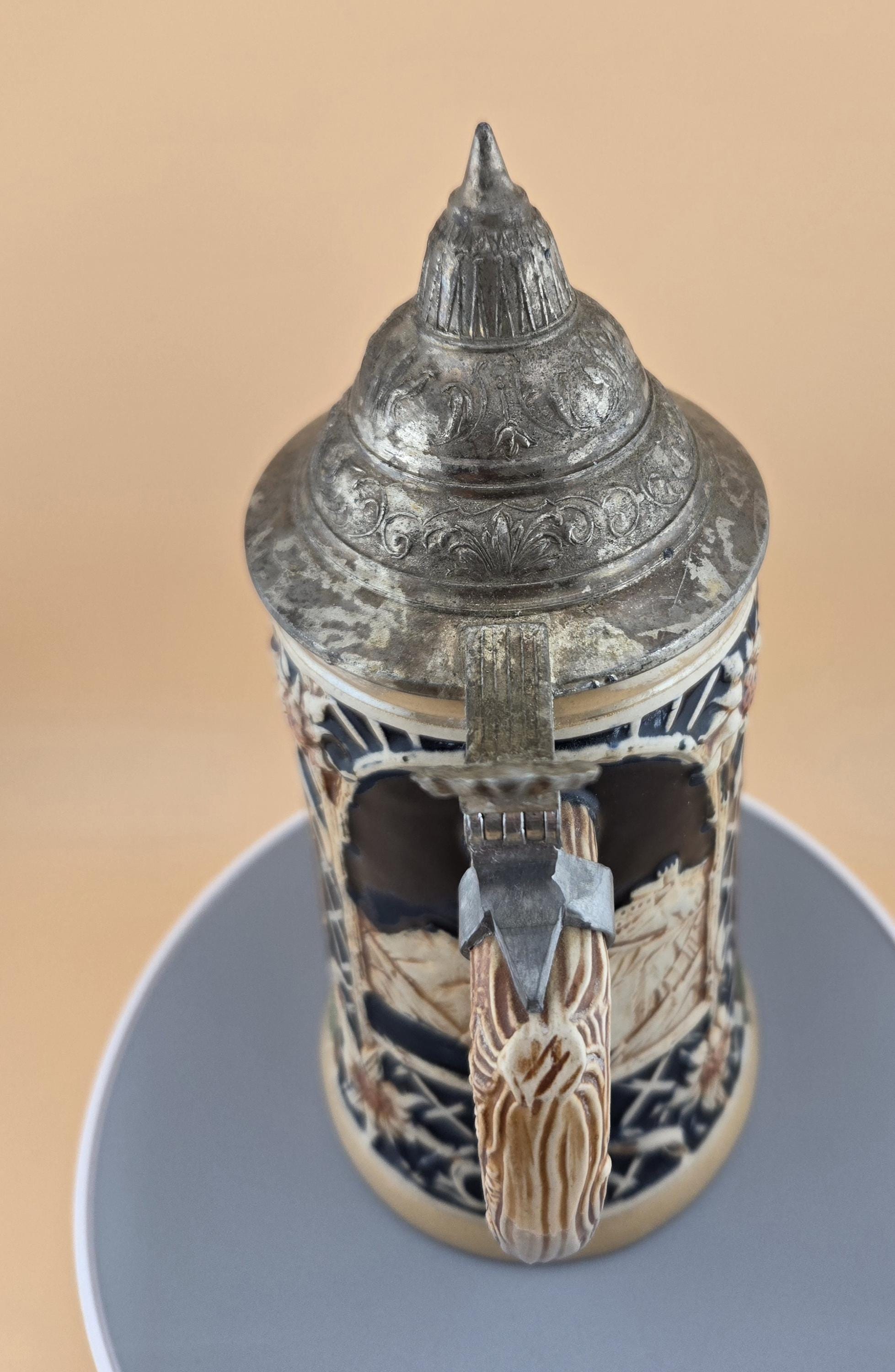 The stein’s ornate pewter lid showcases intricate embossing and a pointed finial, paired with a decorative tree-bark style handle for traditional authenticity. The base is impressed with hallmark stamps and production numbers, confirming its German origin and collectible quality.