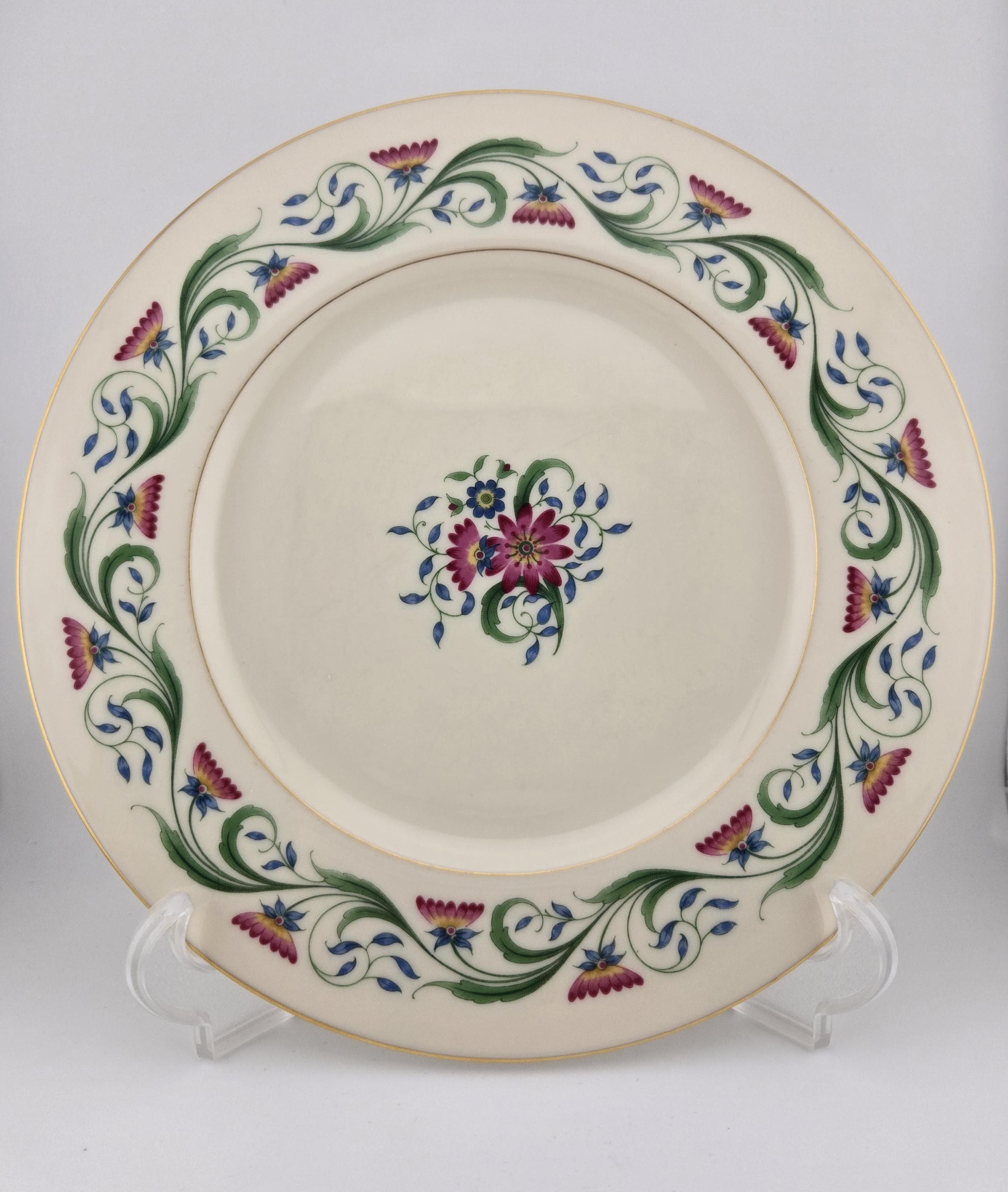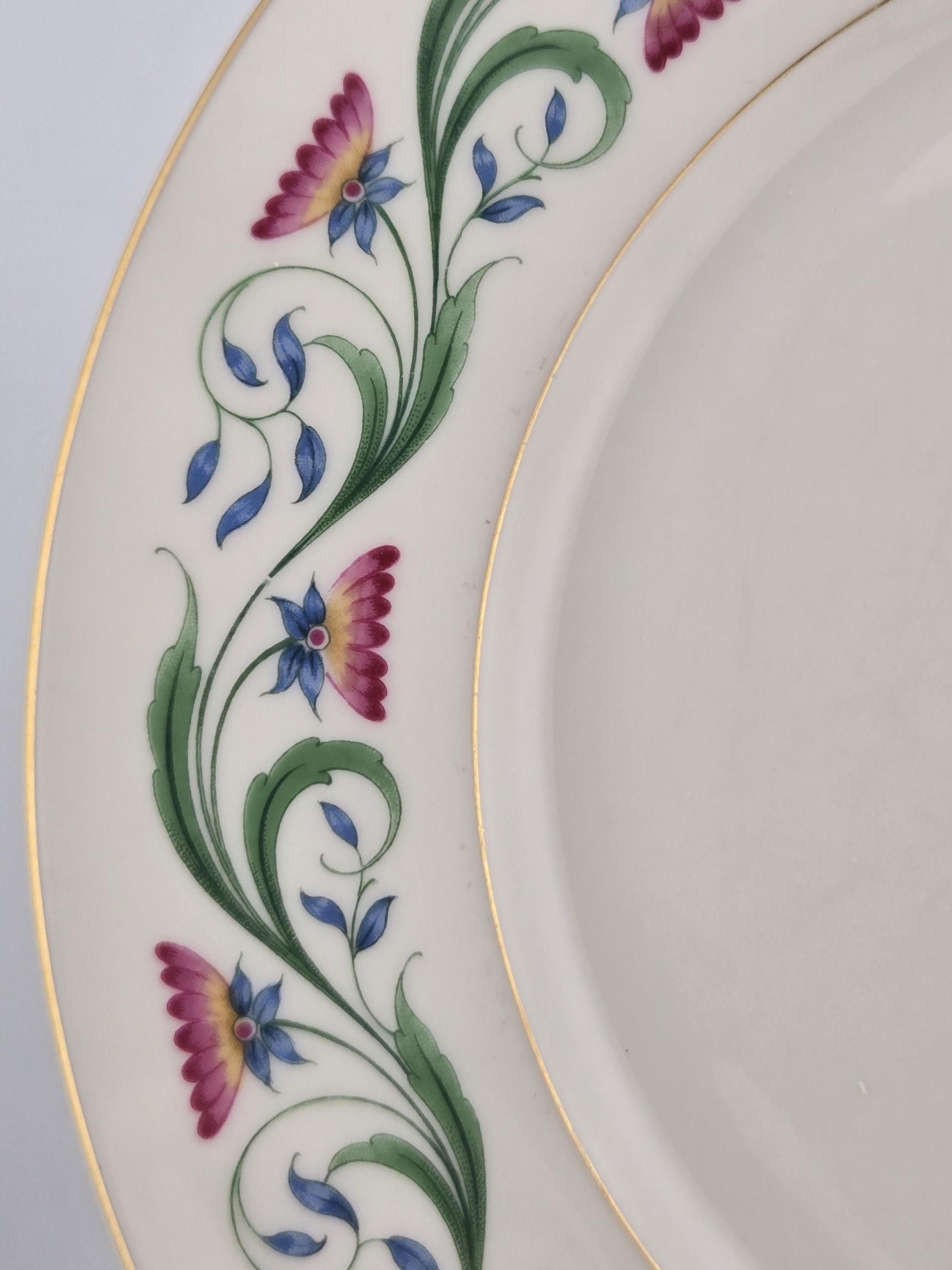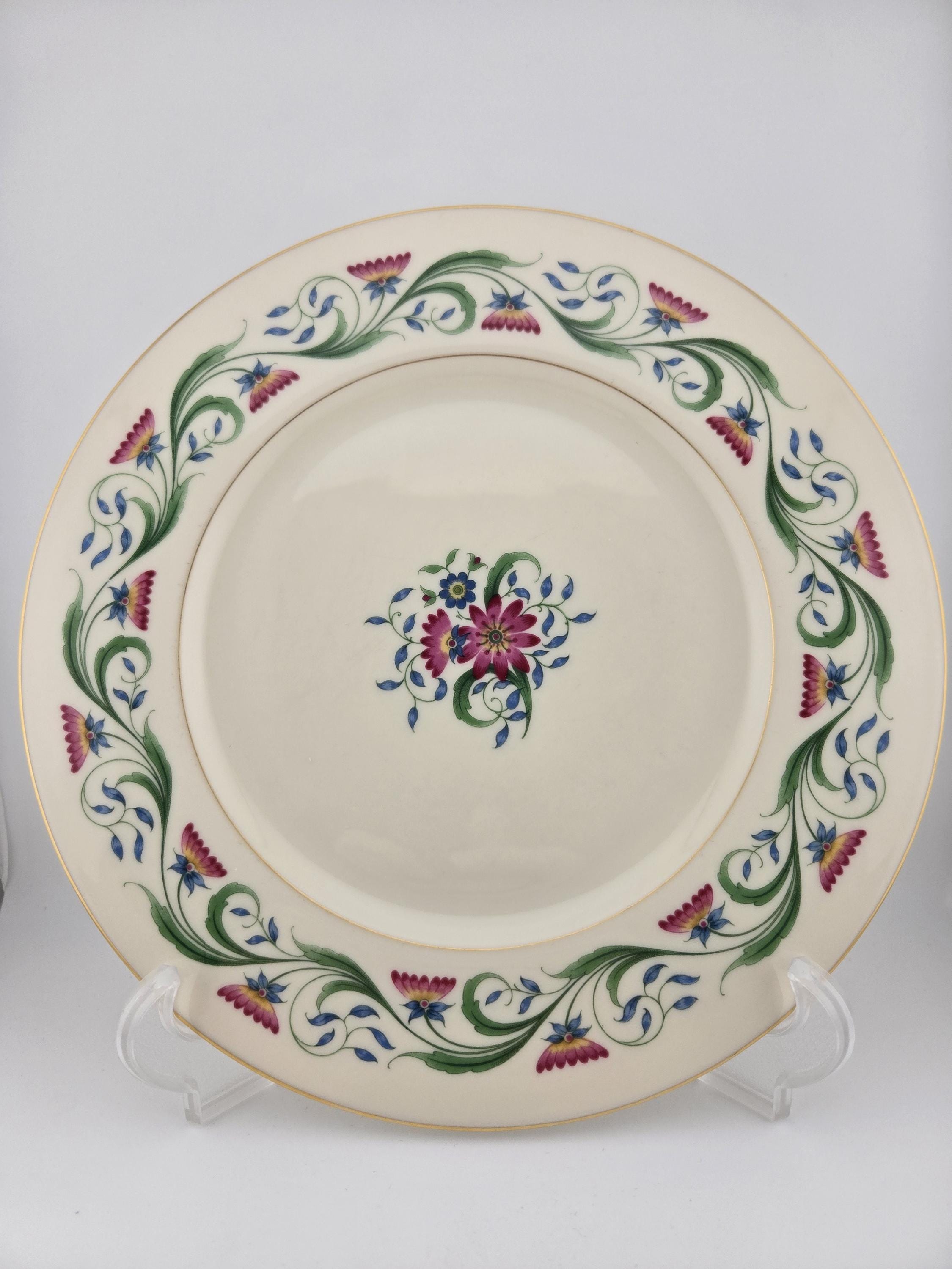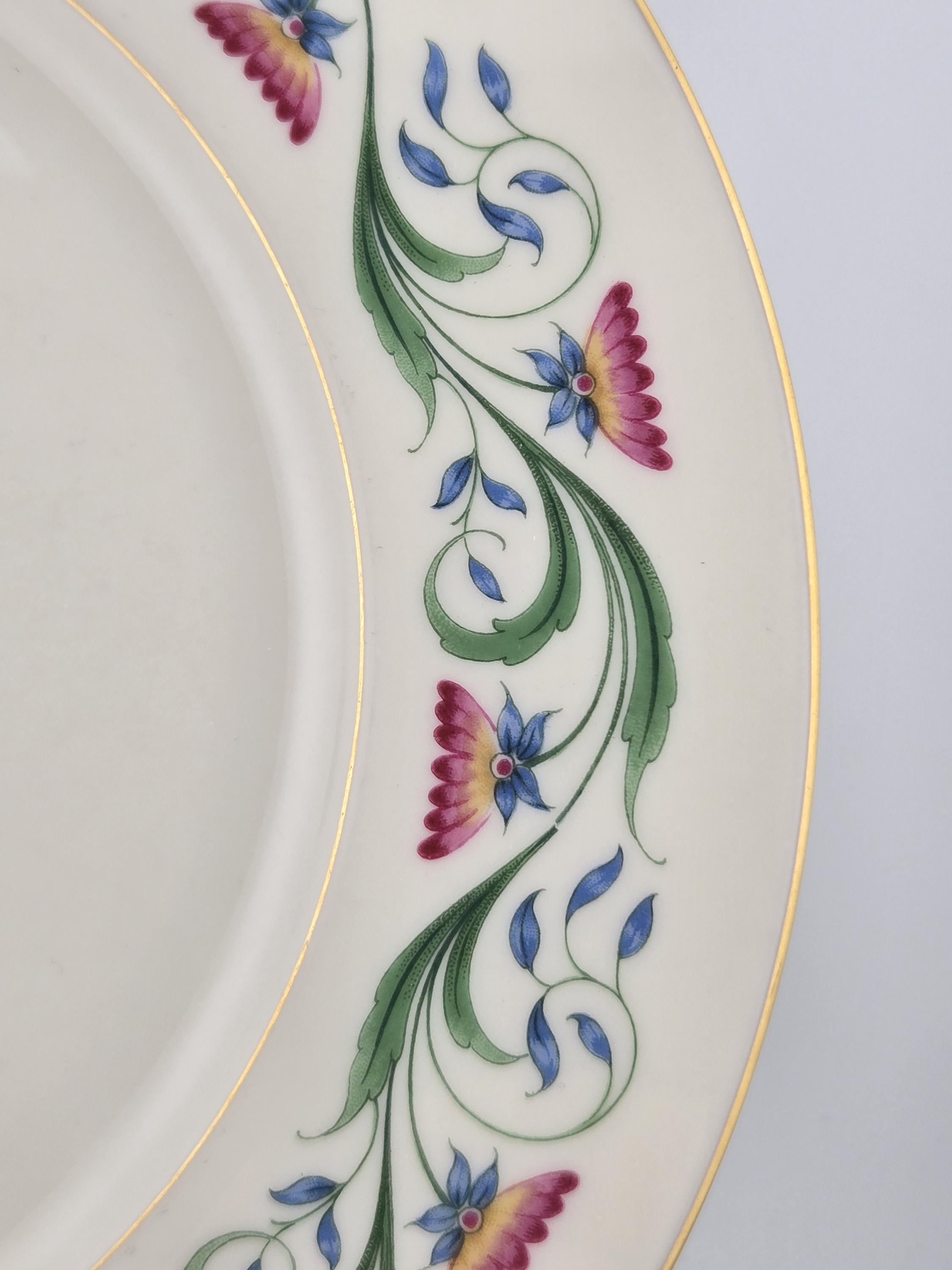 Elegant 1938–1948 Lenox “Monterey” 10.5" dinner plate in ivory bone china with colorful floral scrolls and gold trim. Made in USA, sold individually.