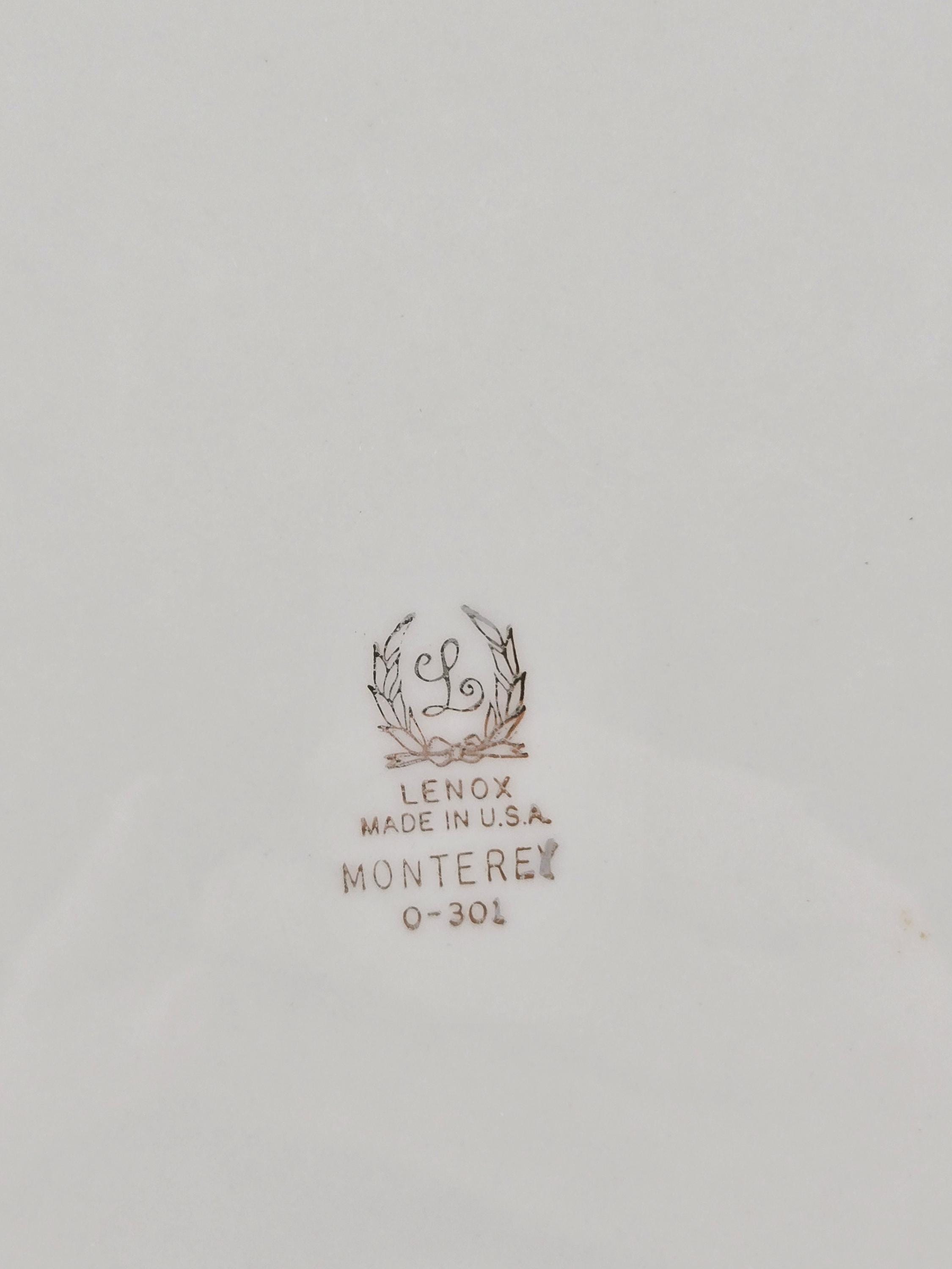 Each plate is marked “Lenox Made in U.S.A. – Monterey O-301” on the reverse, confirming its authenticity and heritage. The Monterey pattern blends formal elegance with artistic color, making it suitable for both display and daily use.