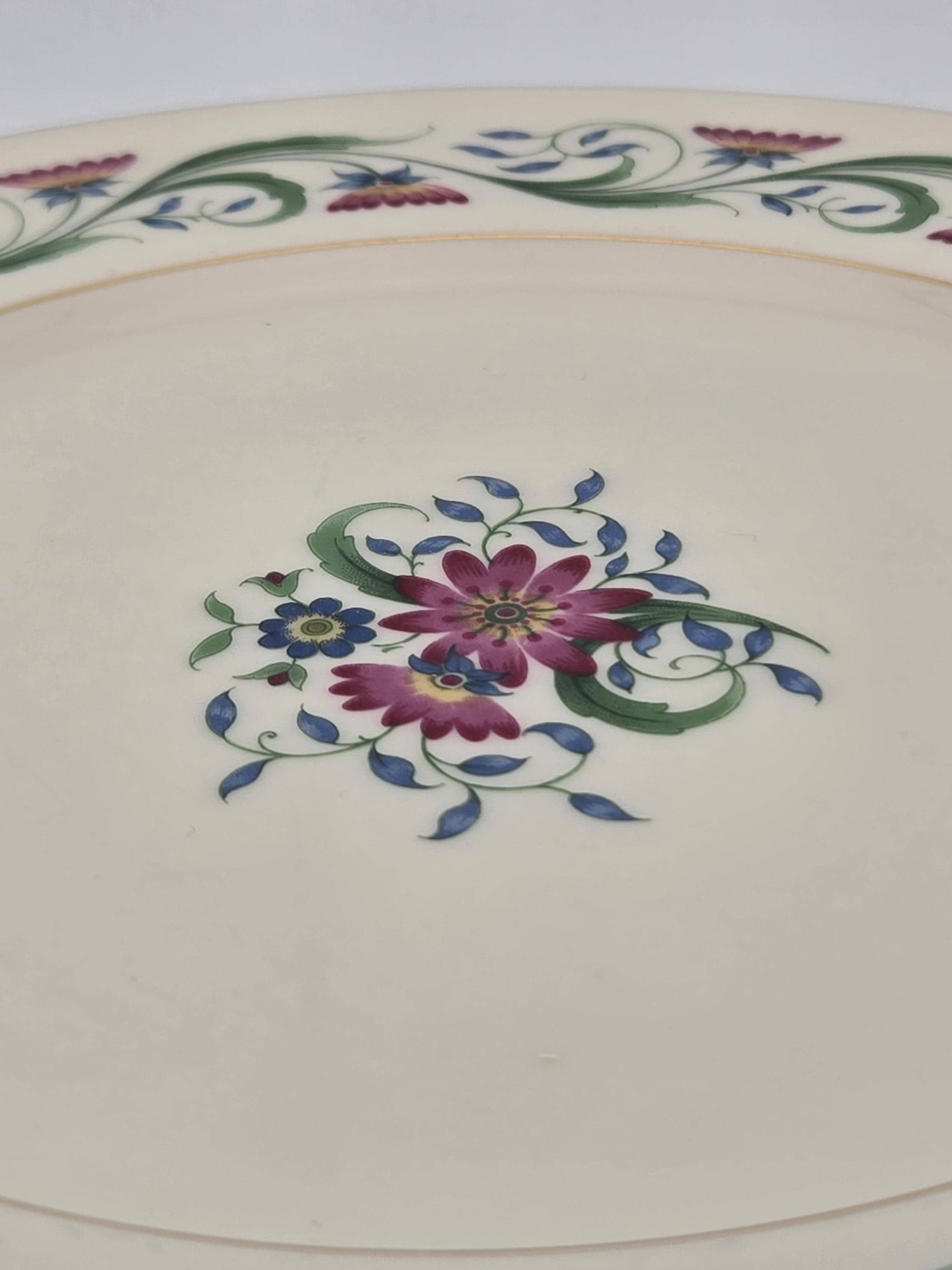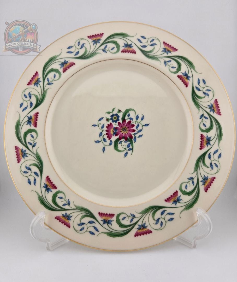 Step back in time with this elegant Lenox “Monterey” Dinner Plate (Pattern O-301) — a beautiful example of classic American-made bone china craftsmanship. Produced between 1938 and 1948, this 10.5-inch plate features a soft ivory background accented by vibrant hand-applied floral scrolls in pink, blue, and green, finished with a delicate 24K gold rim that adds a touch of timeless sophistication.