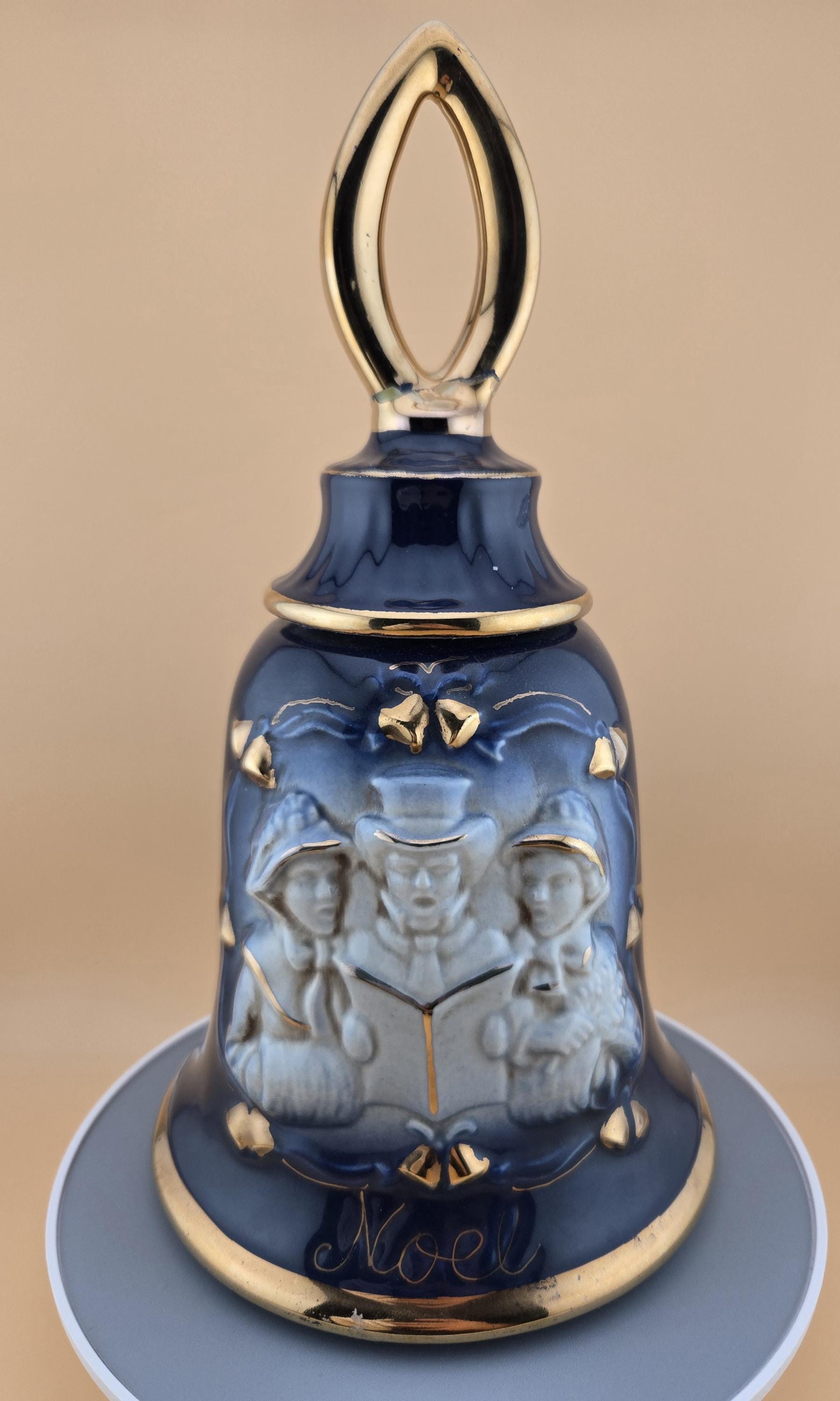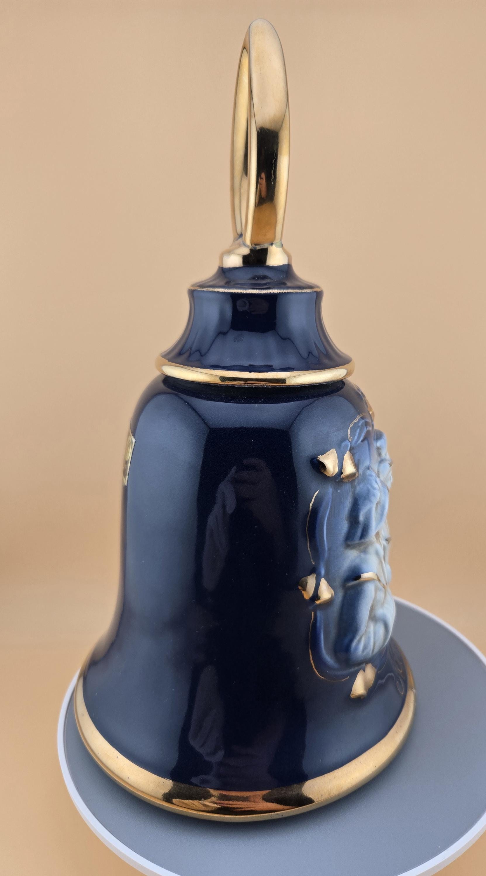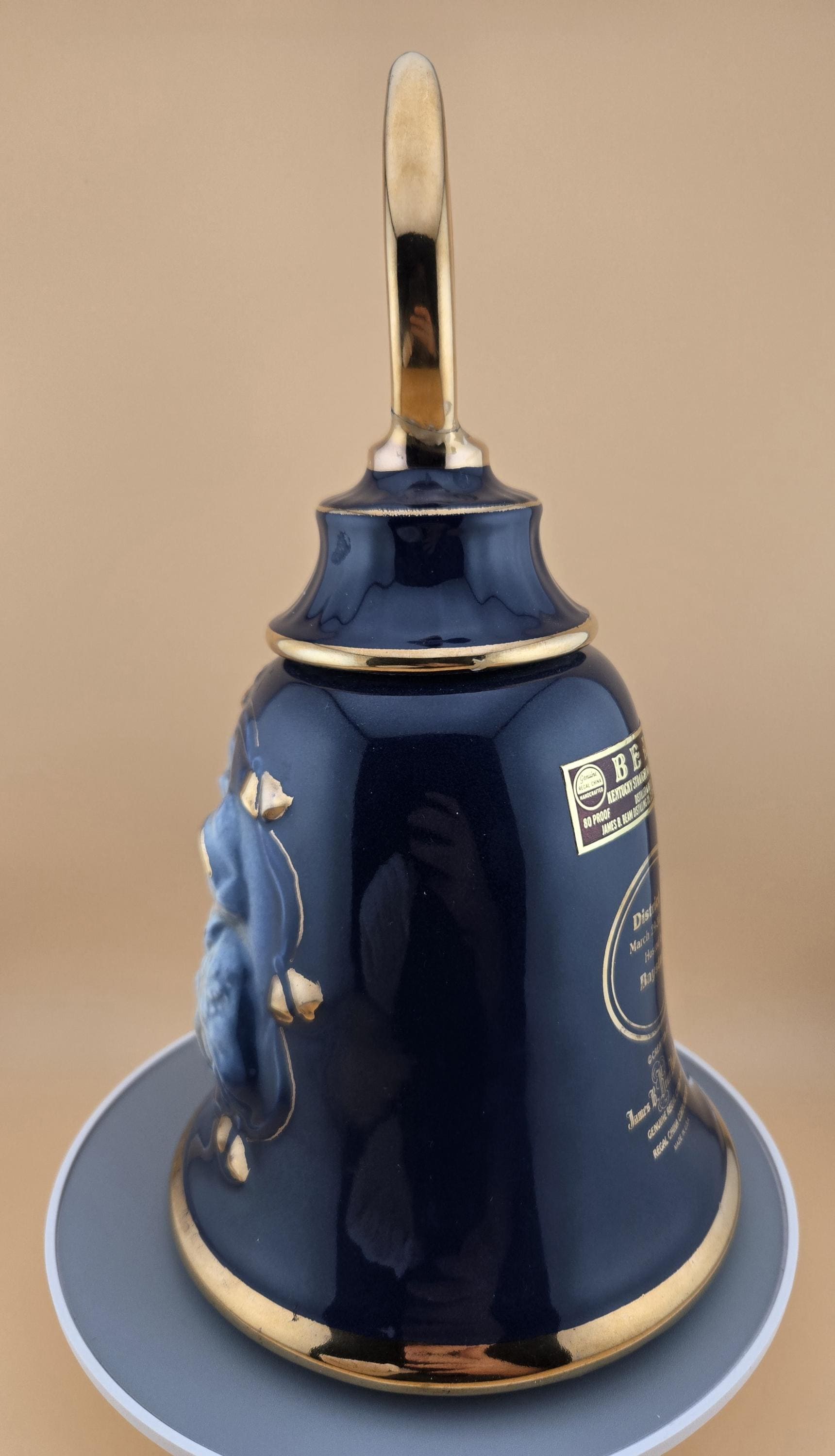 Rare 1984 Jim Beam “Noel” bell-shaped decanter in cobalt blue and gold. Regal China craftsmanship, excellent vintage condition, collectible display piece.