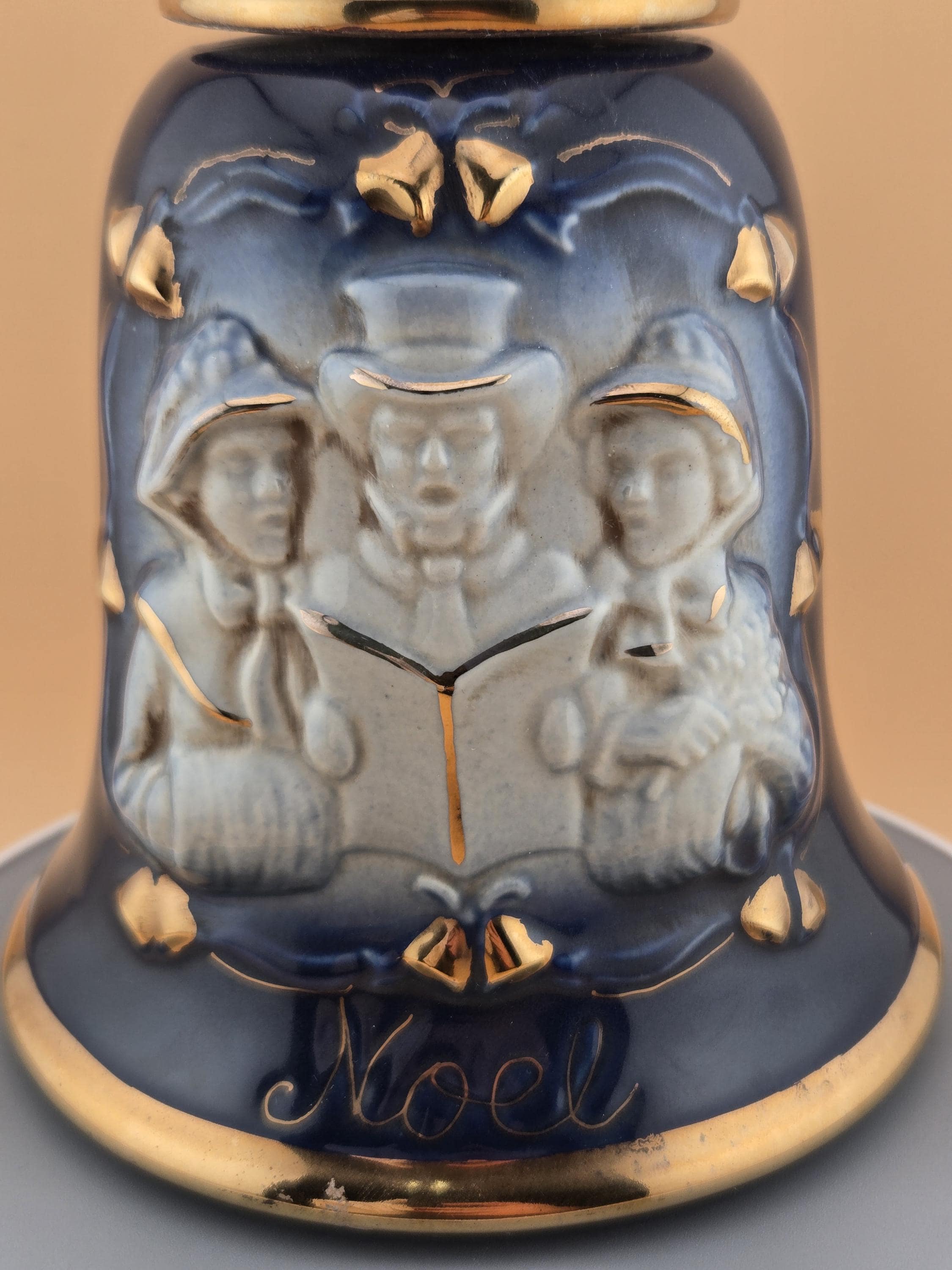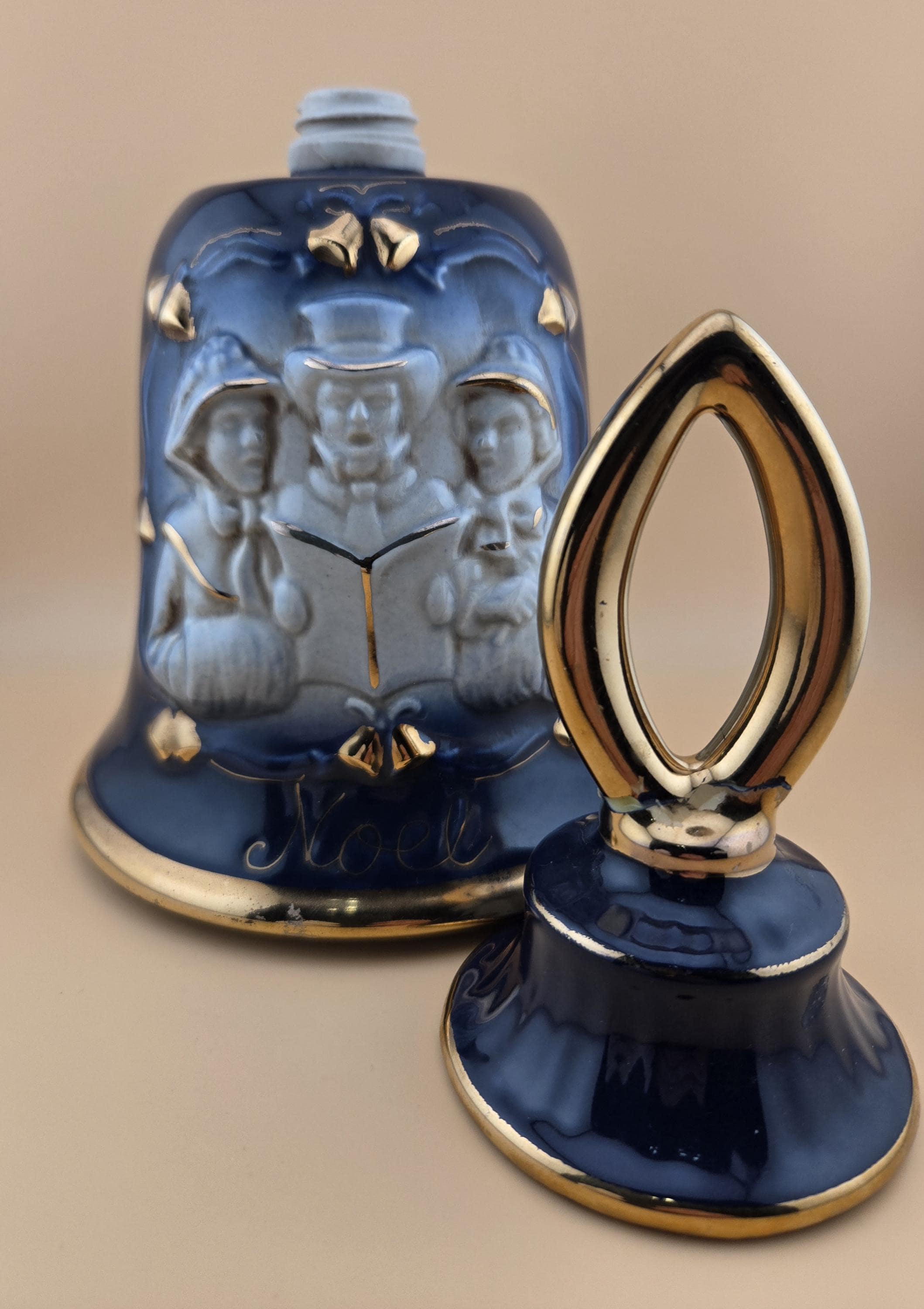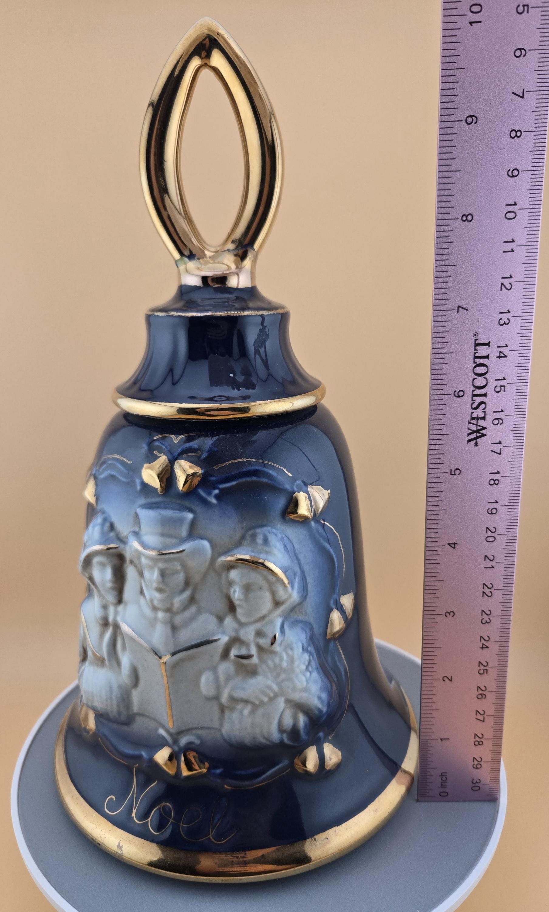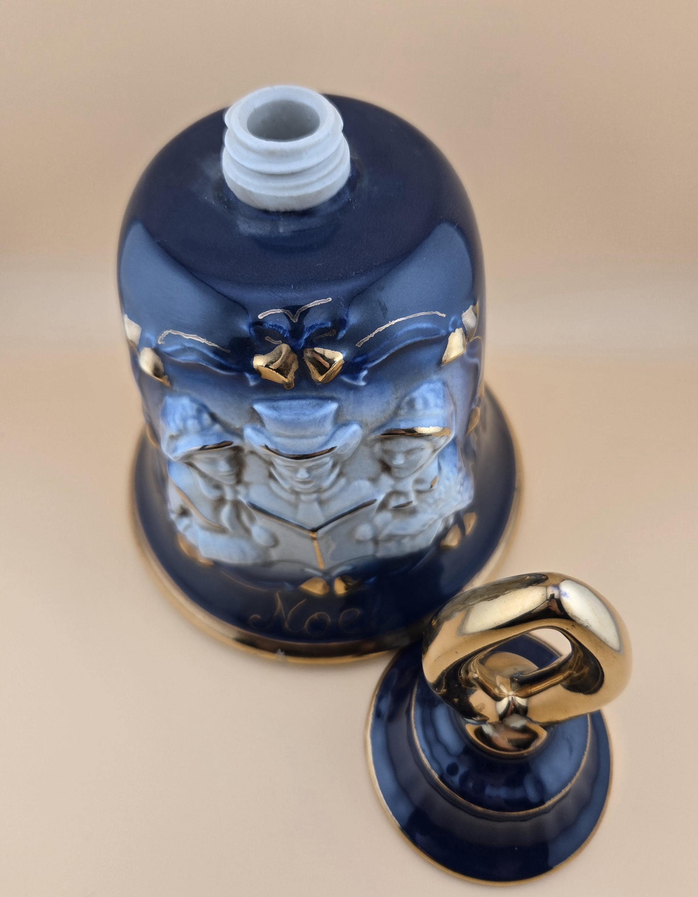 Rare 1984 Jim Beam “Noel” bell-shaped decanter in cobalt blue and gold. Regal China craftsmanship, excellent vintage condition, collectible display piece.
