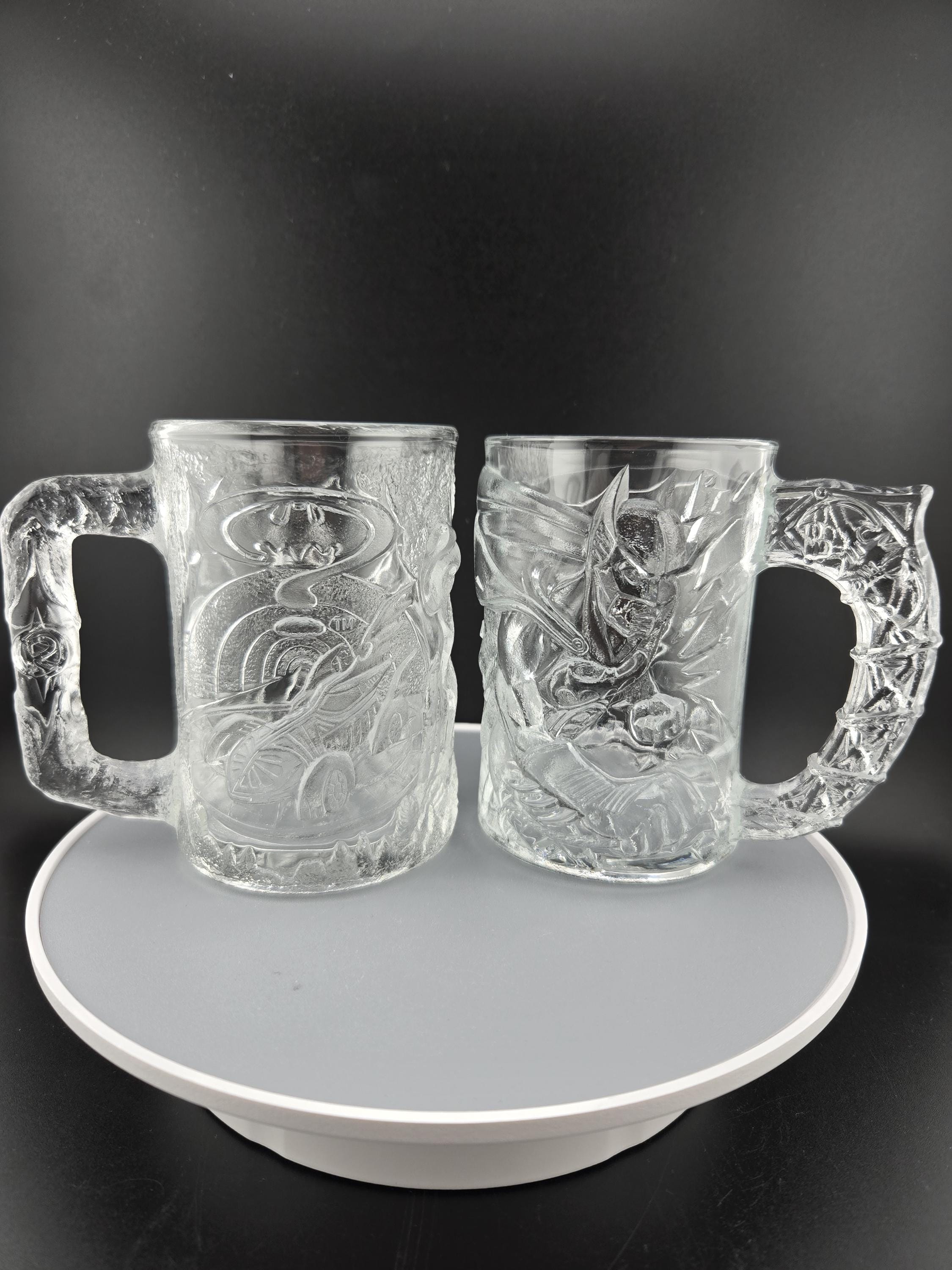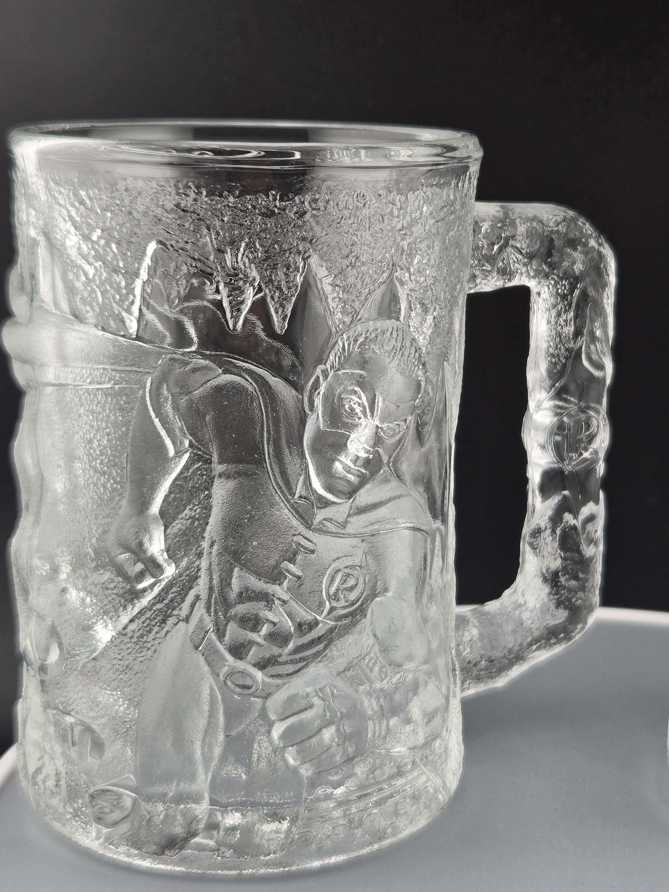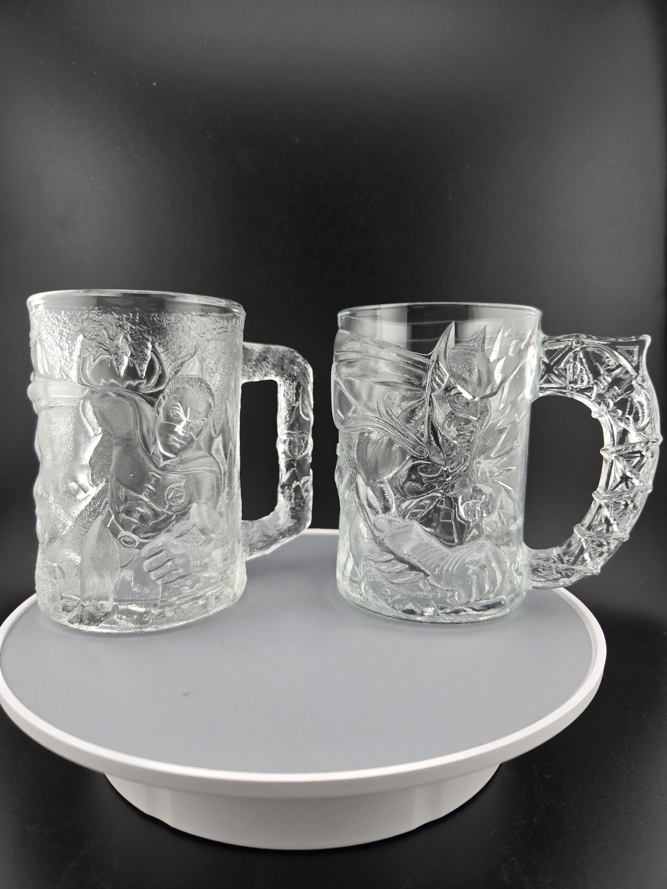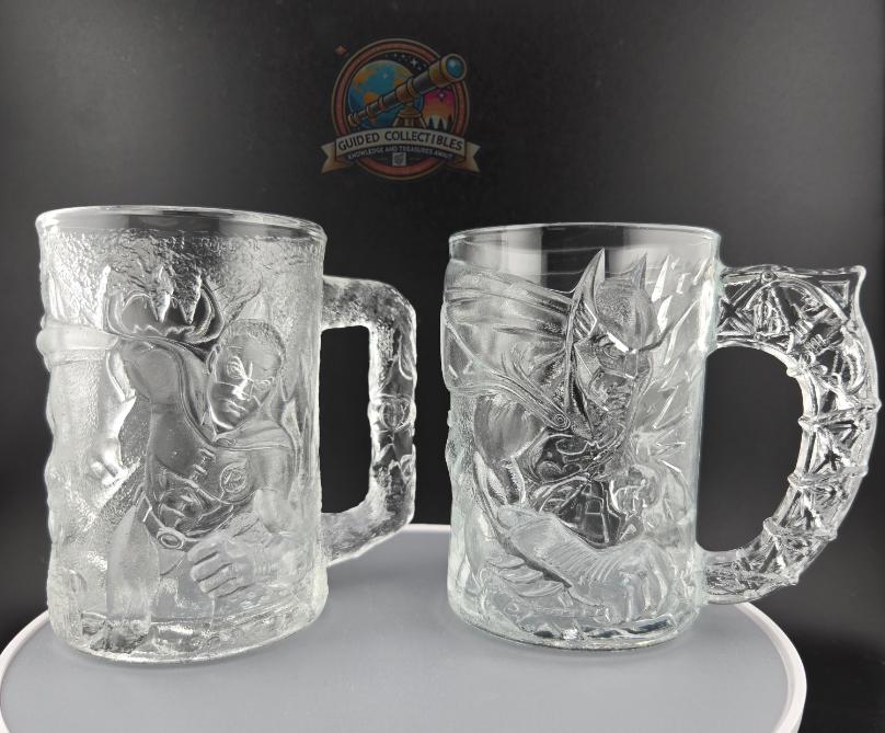 Own a striking piece of 1990s pop-culture history — this rare McDonald’s Batman Forever glass mug set features embossed Batman and Robin designs with impressive weight, detail, and display appeal. A must-have for DC Comics collectors. This vintage set of McDonald’s Batman Forever collectible glass mugs is an authentic piece of 1990s DC Comics memorabilia, produced to celebrate the release of Batman Forever (1995). Featuring Batman and Robin in deeply embossed, high-relief designs, these mugs were made with thick, heavy glass and dramatic sculptural detailing rarely seen in modern promotional glassware.