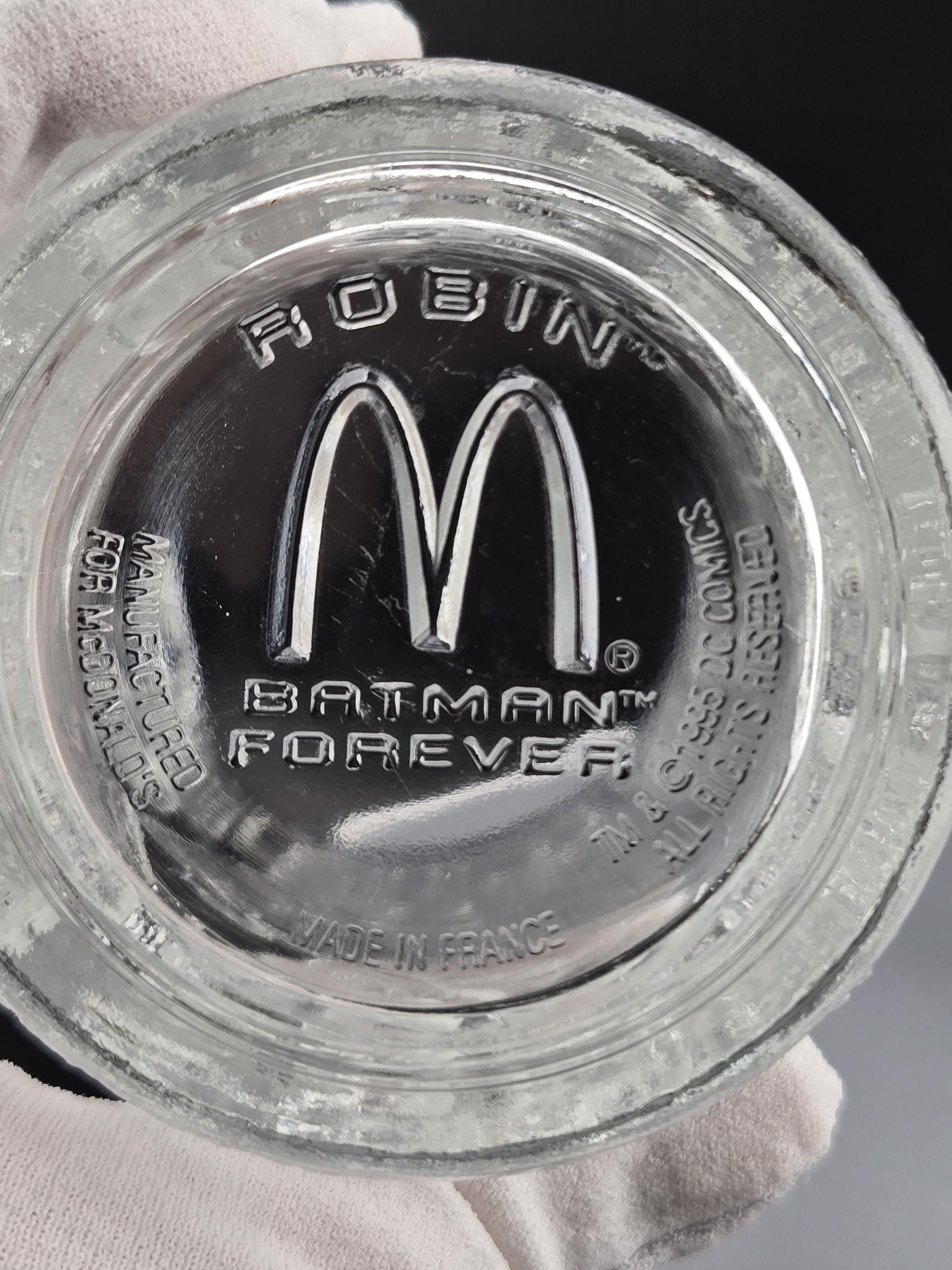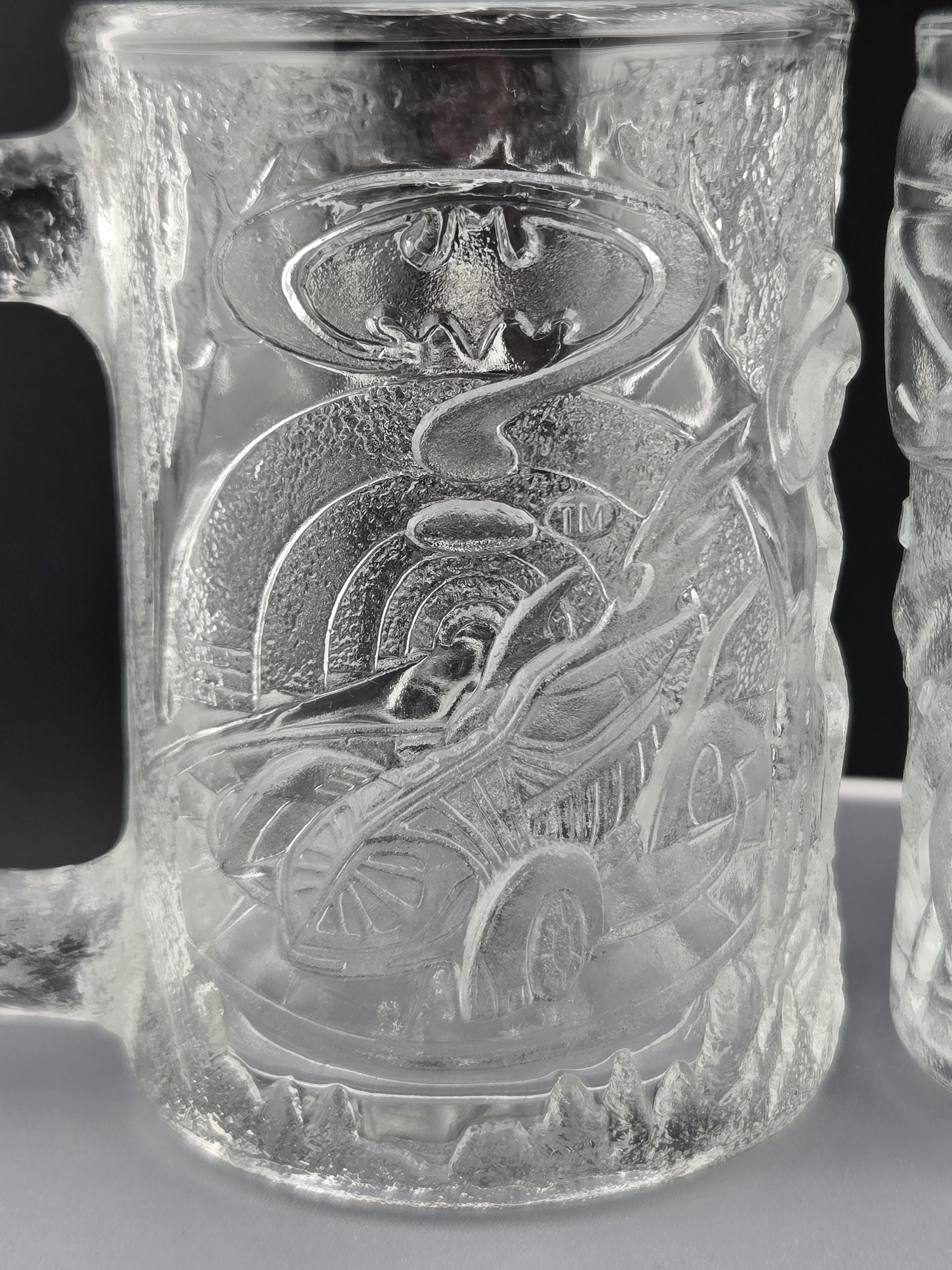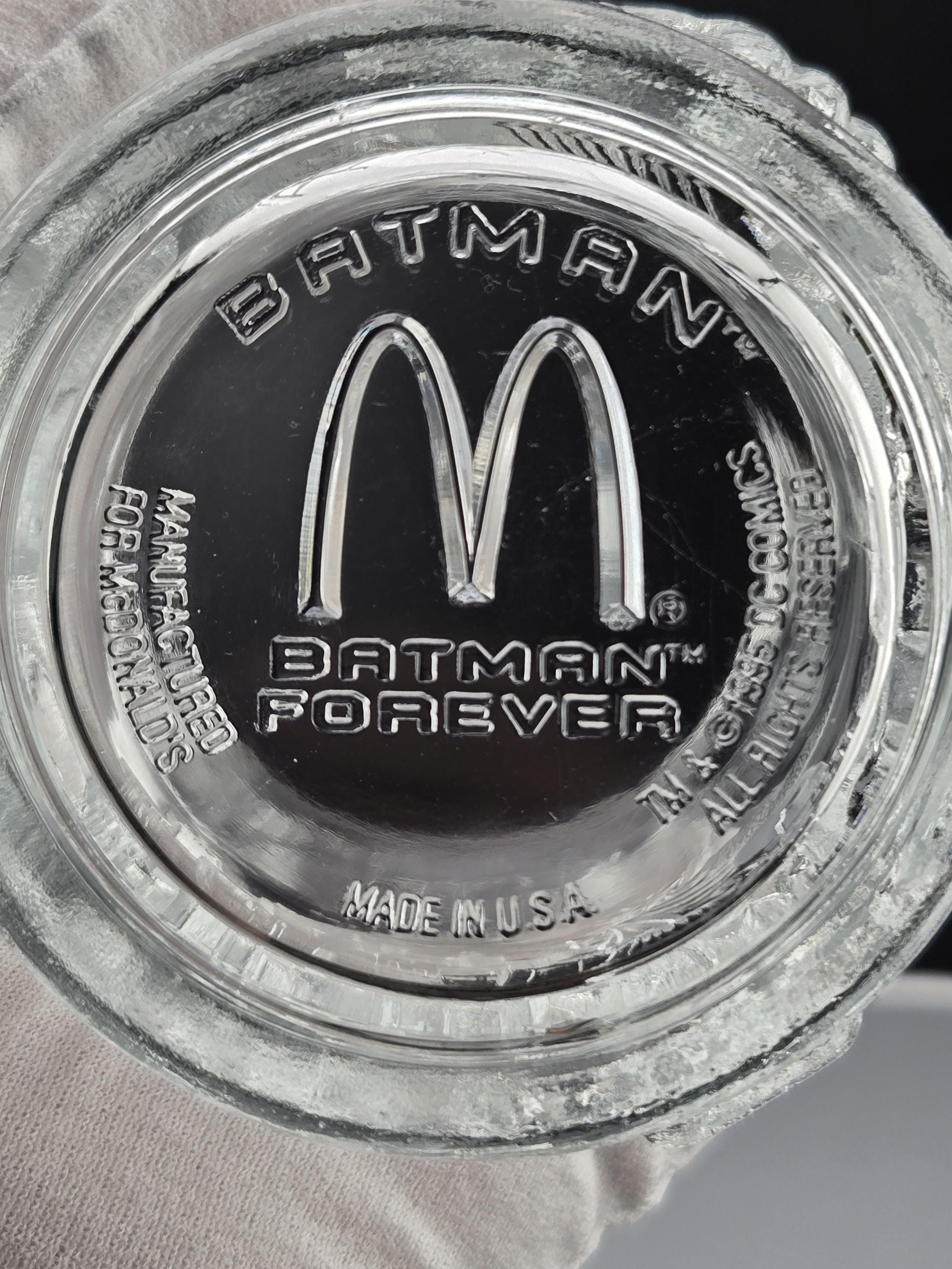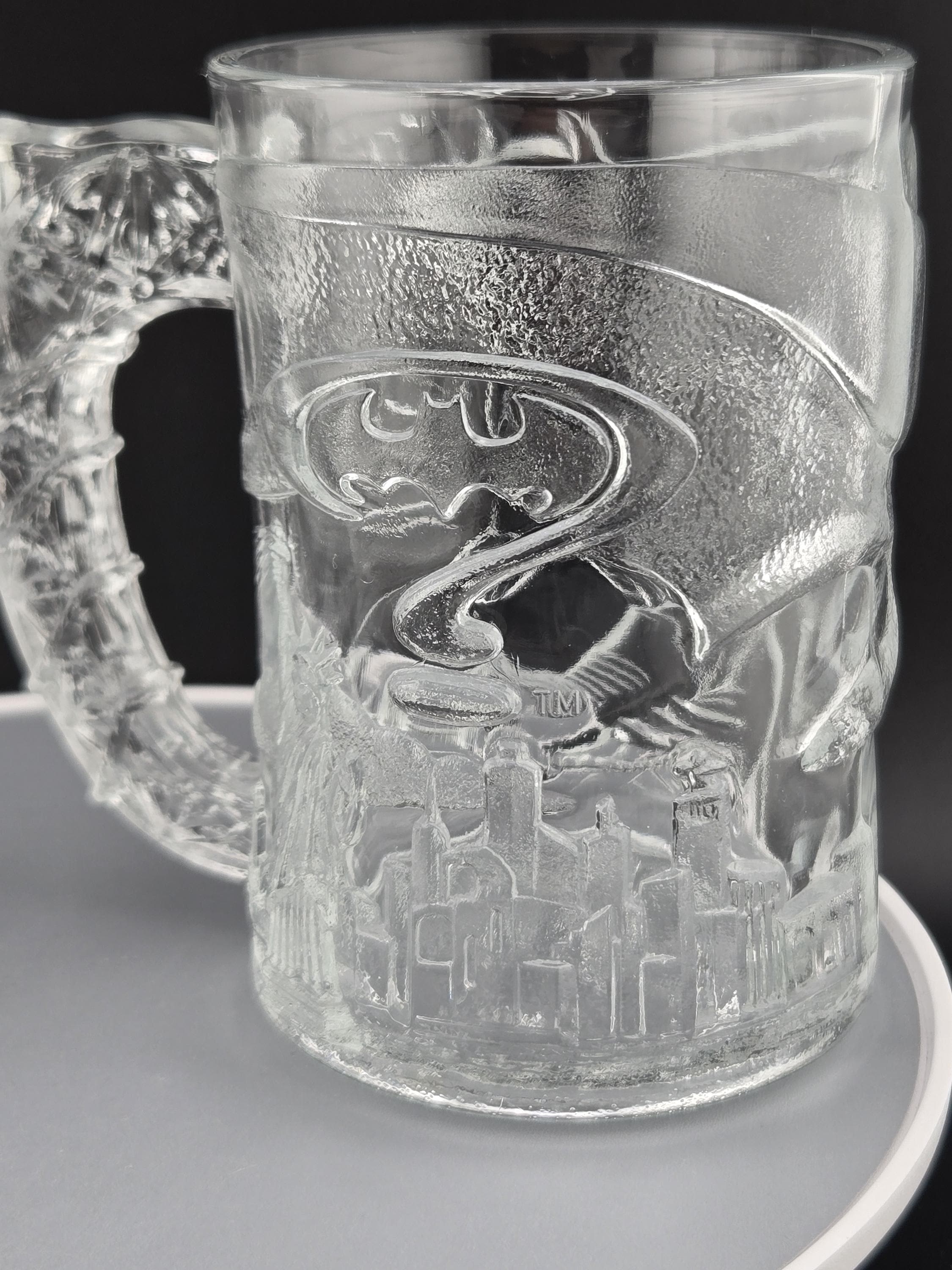 Own a striking piece of 1990s pop-culture history — this rare McDonald’s Batman Forever glass mug set features embossed Batman and Robin designs with impressive weight, detail, and display appeal. A must-have for DC Comics collectors. This vintage set of McDonald’s Batman Forever collectible glass mugs is an authentic piece of 1990s DC Comics memorabilia, produced to celebrate the release of Batman Forever (1995). Featuring Batman and Robin in deeply embossed, high-relief designs, these mugs were made with thick, heavy glass and dramatic sculptural detailing rarely seen in modern promotional glassware.