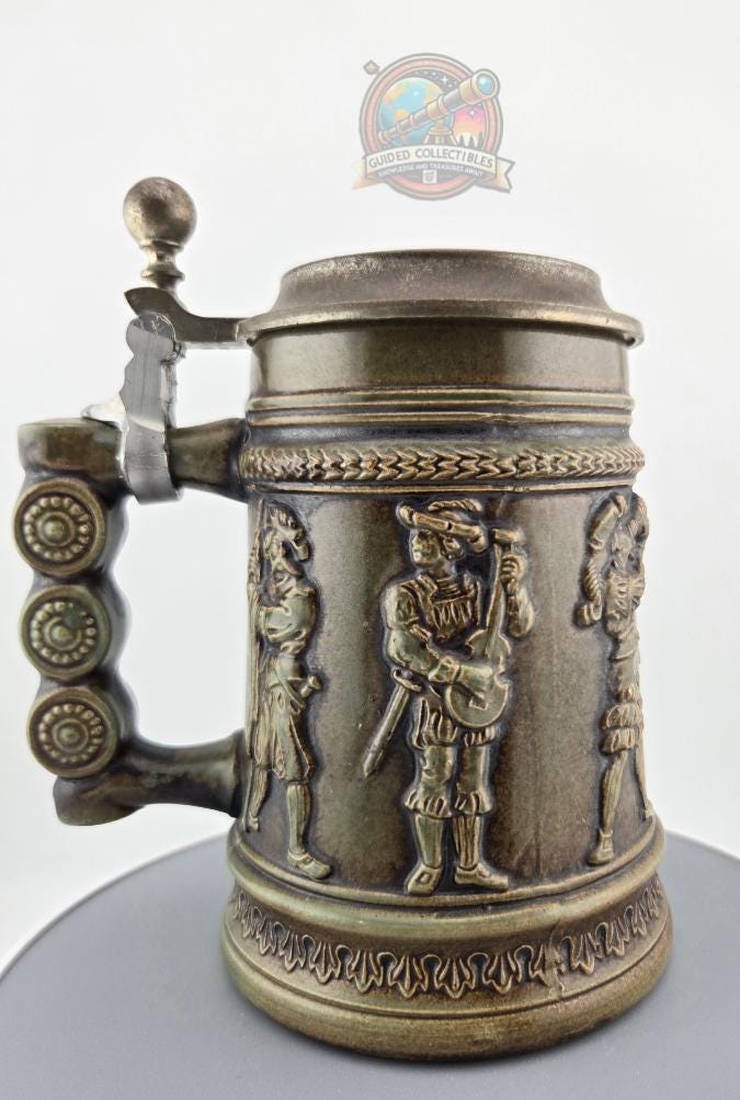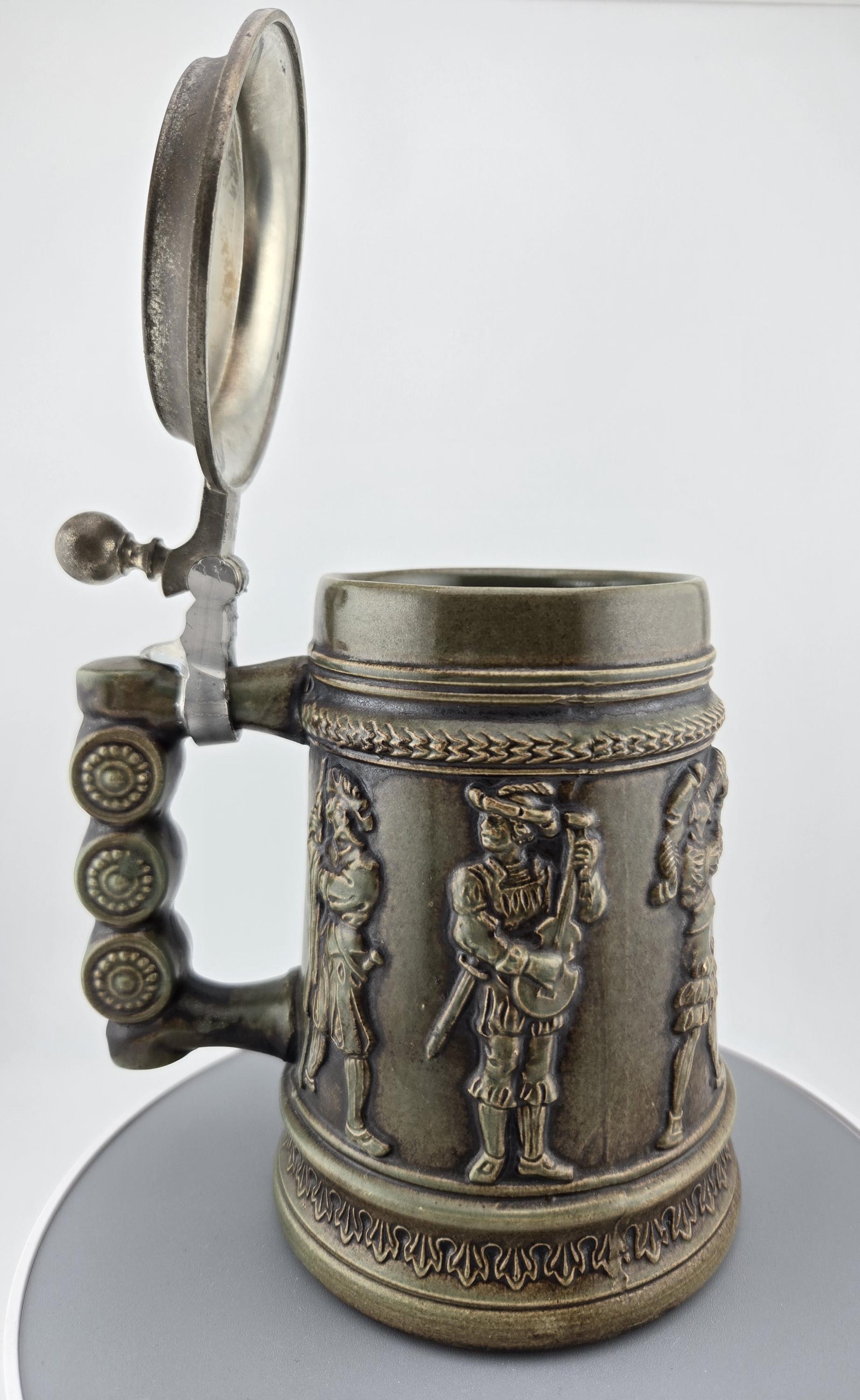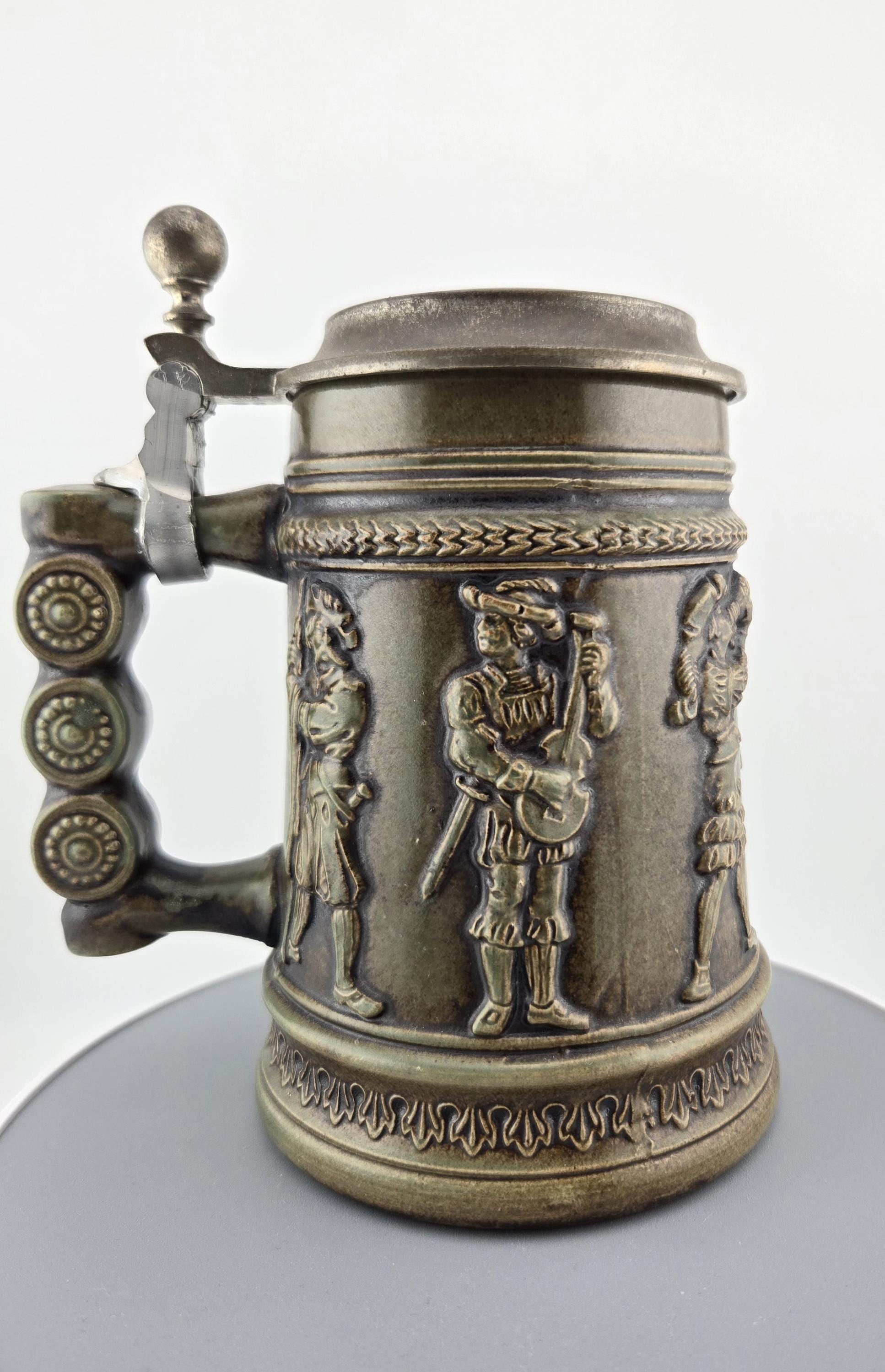 Details: • Style: German / European traditional • Material: Glazed stoneware with metal hinged lid • Design: Raised medieval musician reliefs • Finish: Pewter-tone / earthy gray-green patina • Lid: Hinged metal lid with thumb lift • Approx. Height: ~9 inches (see photos for measurement reference) • Condition: Vintage condition with light age-appropriate wear; no cracks noted