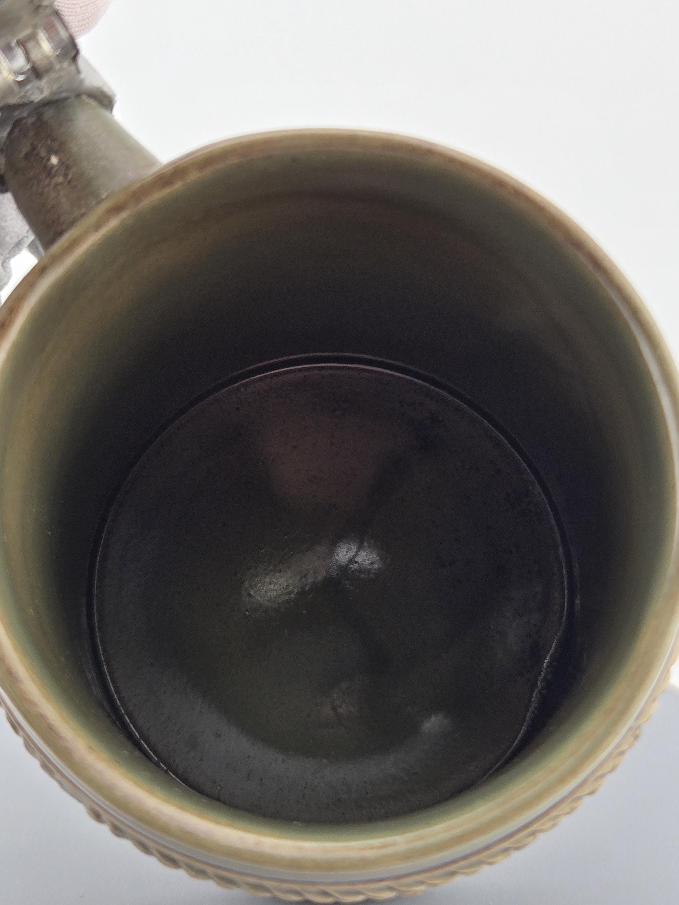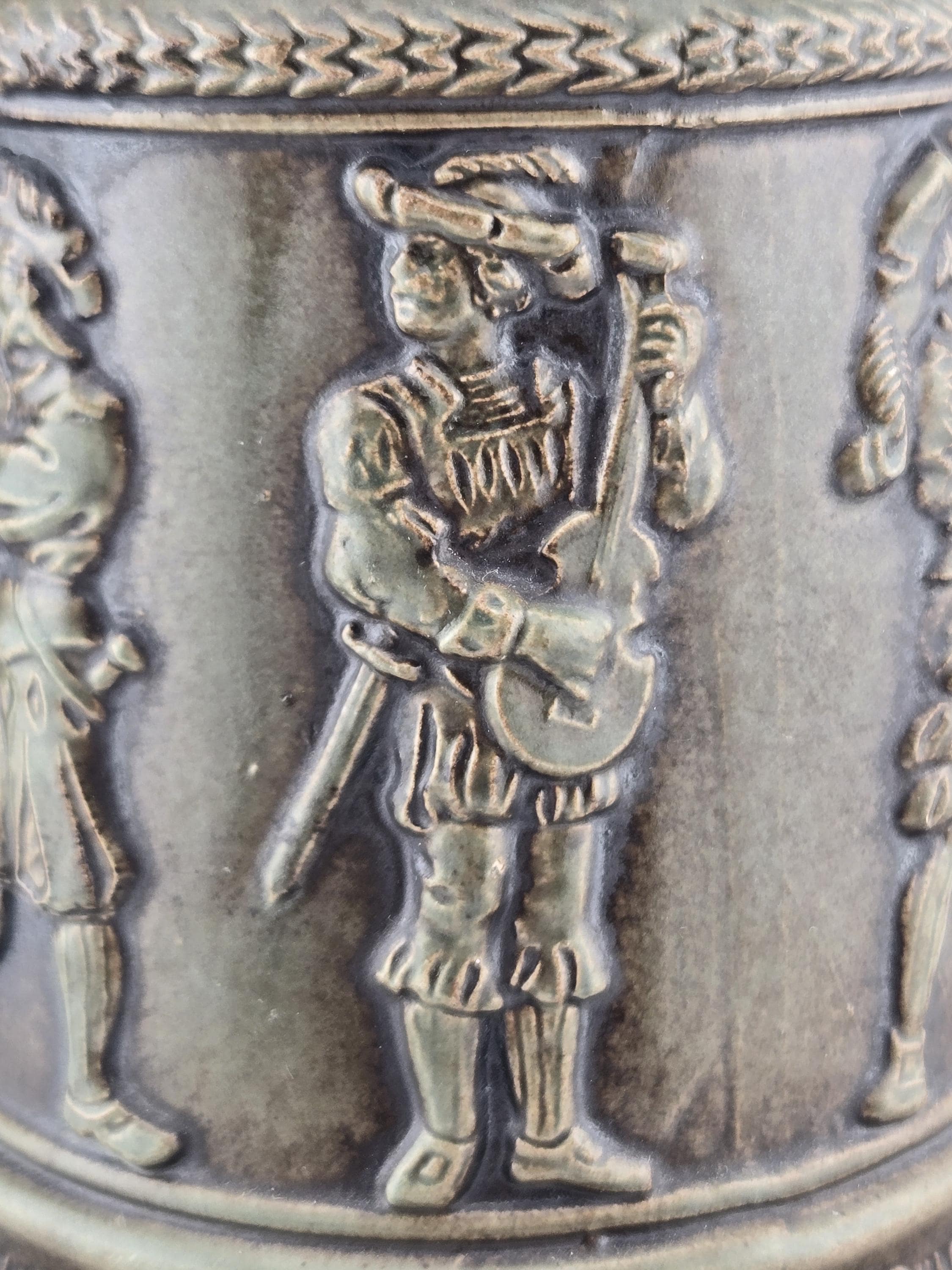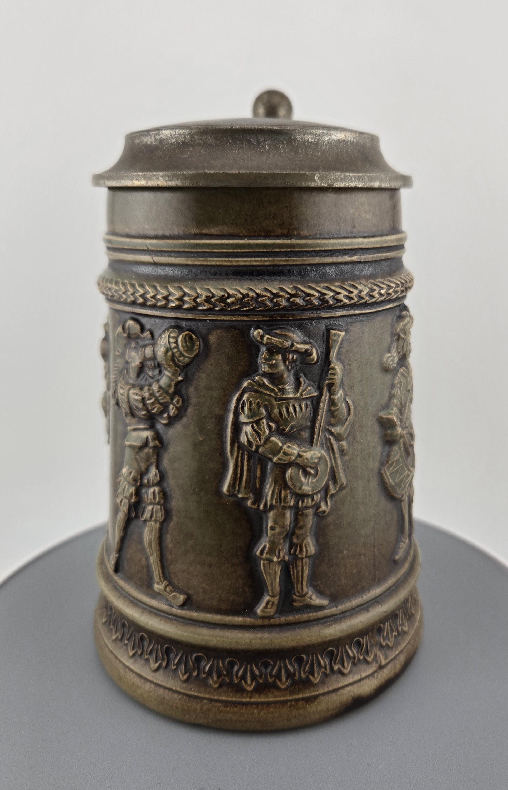 Details: • Style: German / European traditional • Material: Glazed stoneware with metal hinged lid • Design: Raised medieval musician reliefs • Finish: Pewter-tone / earthy gray-green patina • Lid: Hinged metal lid with thumb lift • Approx. Height: ~9 inches (see photos for measurement reference) • Condition: Vintage condition with light age-appropriate wear; no cracks noted
