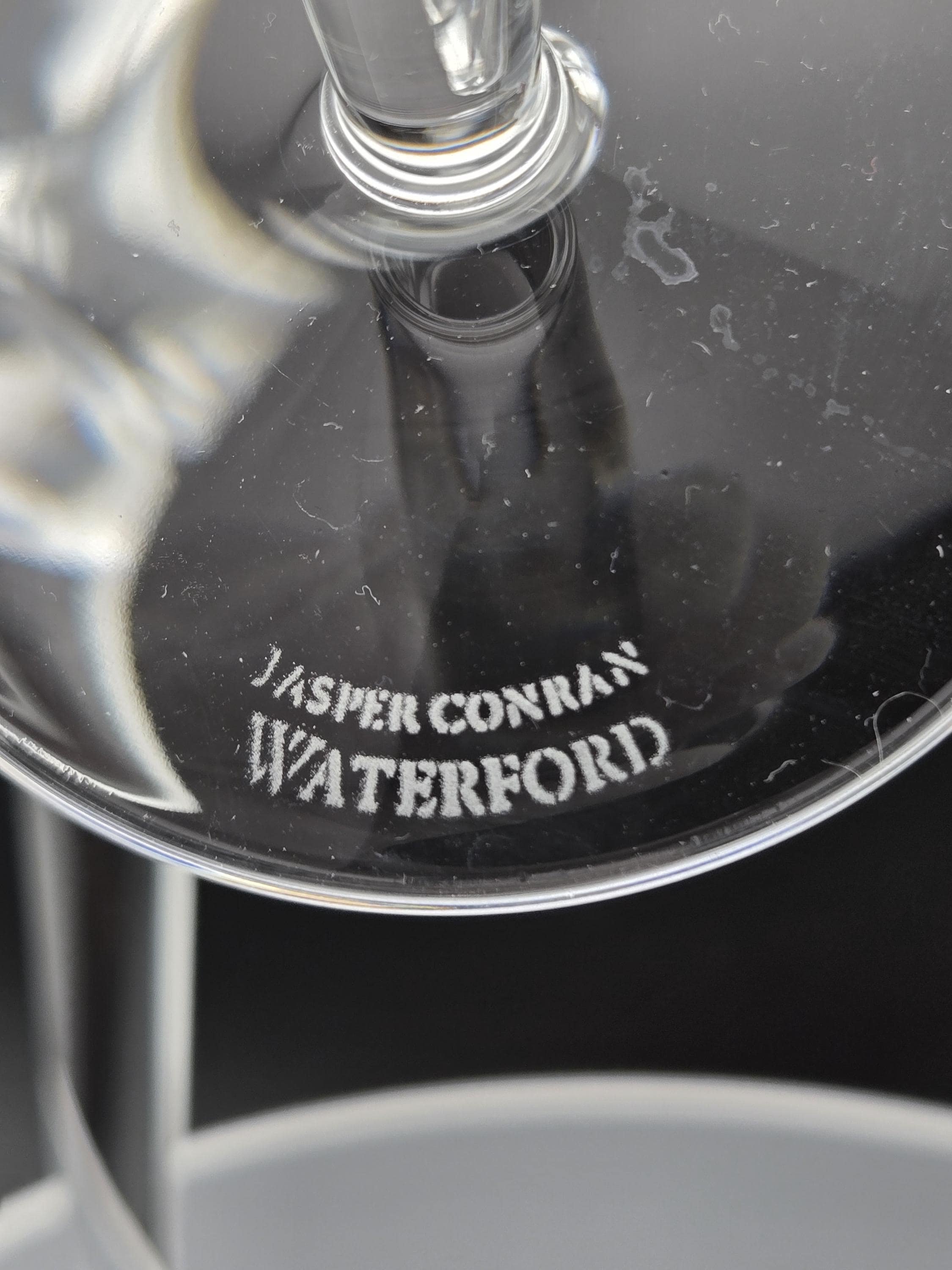 The glasses are crafted from fine Irish crystal and are acid-etched on the base “Jasper Conran Waterford,” confirming authenticity. The tall, slender stems and balanced circular bases provide an elegant silhouette while remaining comfortable and well-weighted in hand.
