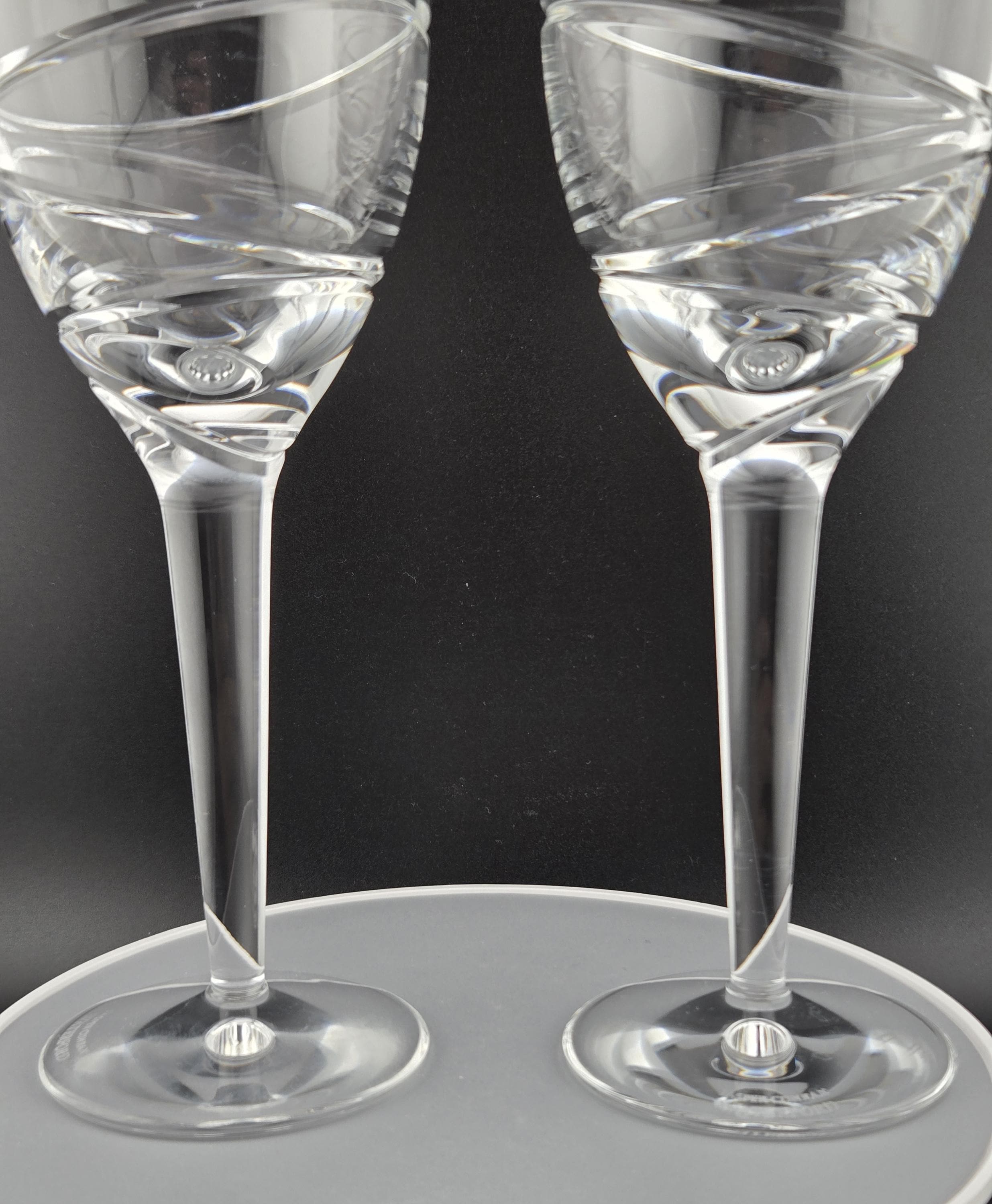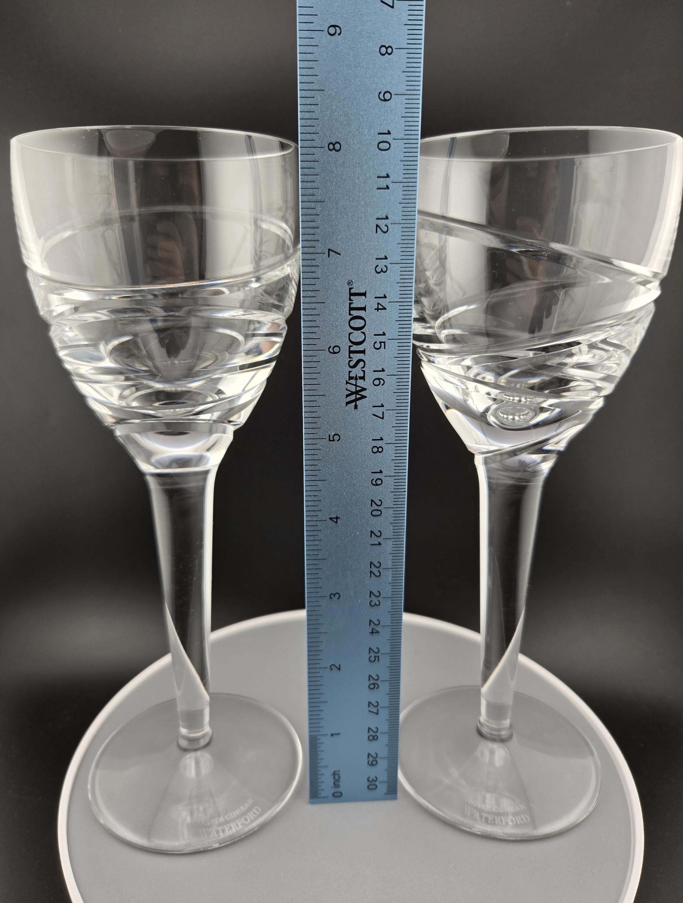 Details: • Brand: Waterford • Designer: Jasper Conran • Quantity: Set of 2 glasses • Material: Irish crystal • Design: Modern spiral / swirl cut bowl • Markings: “Jasper Conran Waterford” etched on base • Approx. Height: ~8.75–9 inches (see photos for measurement reference) • Condition: Very good condition; light surface wear only