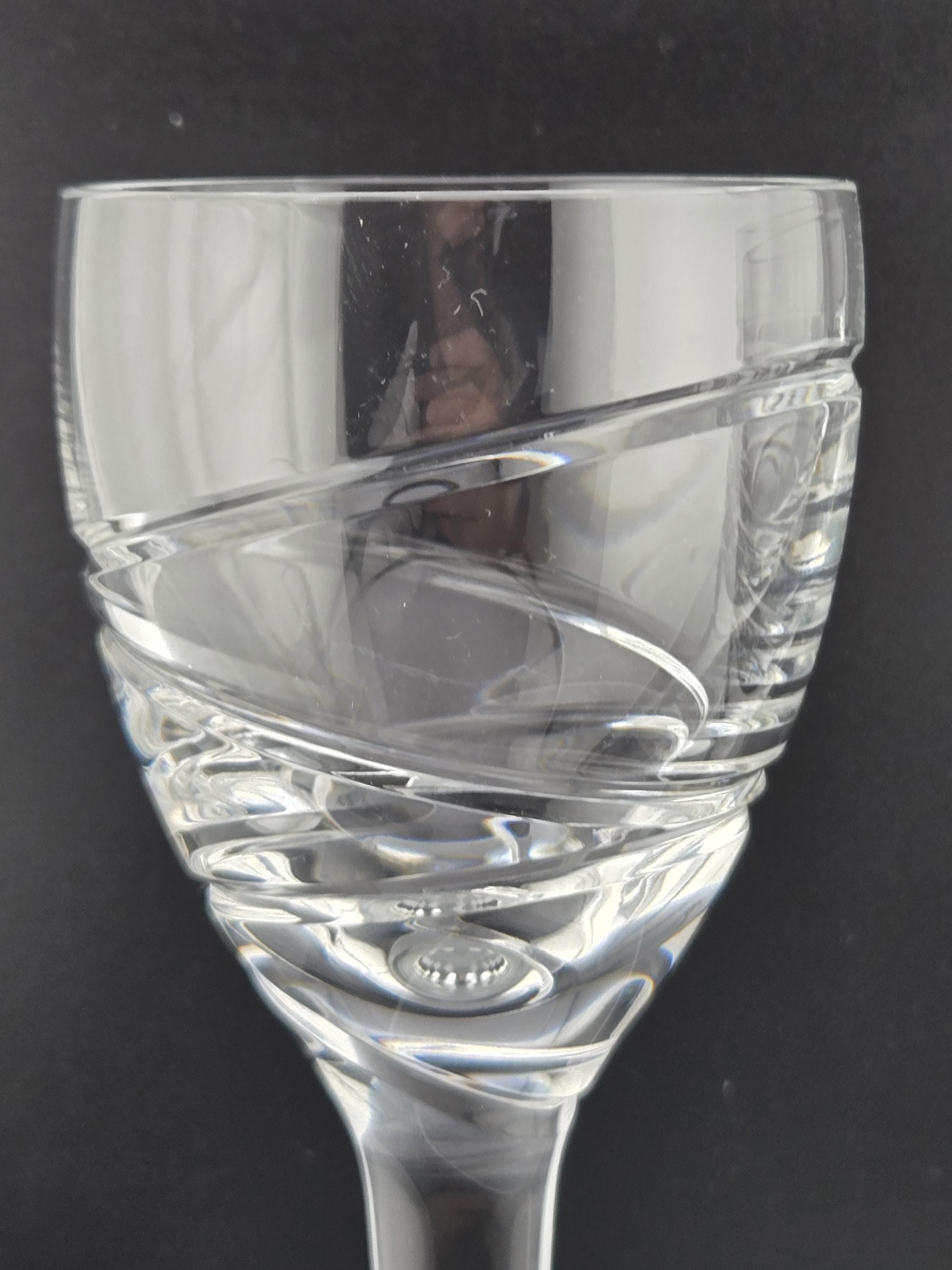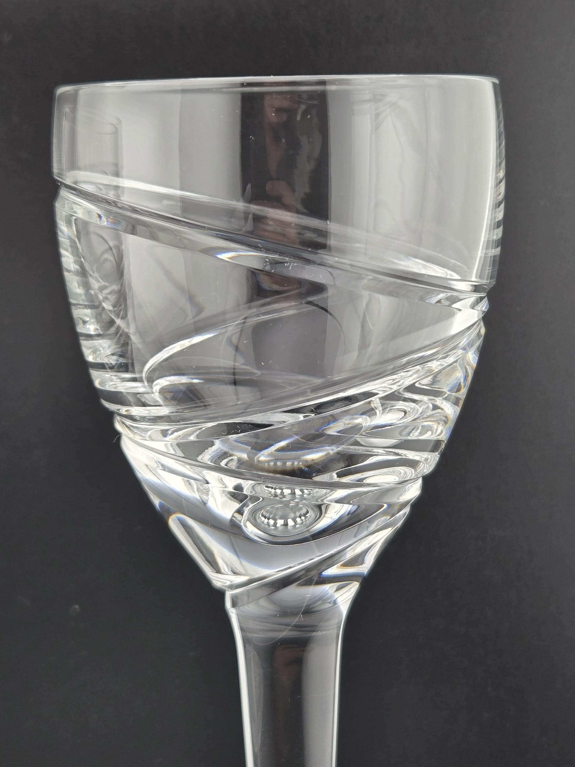 Elegant Waterford crystal wine glasses designed by Jasper Conran, featuring a modern spiral cut bowl and signed Waterford base — refined luxury stemware with contemporary style. This set of two Waterford crystal wine glasses, designed by Jasper Conran, blends modern design with Waterford’s legendary craftsmanship. Each glass features a smooth, contemporary bowl accented by a sweeping spiral cut, creating movement, brilliance, and excellent light refraction from every angle.