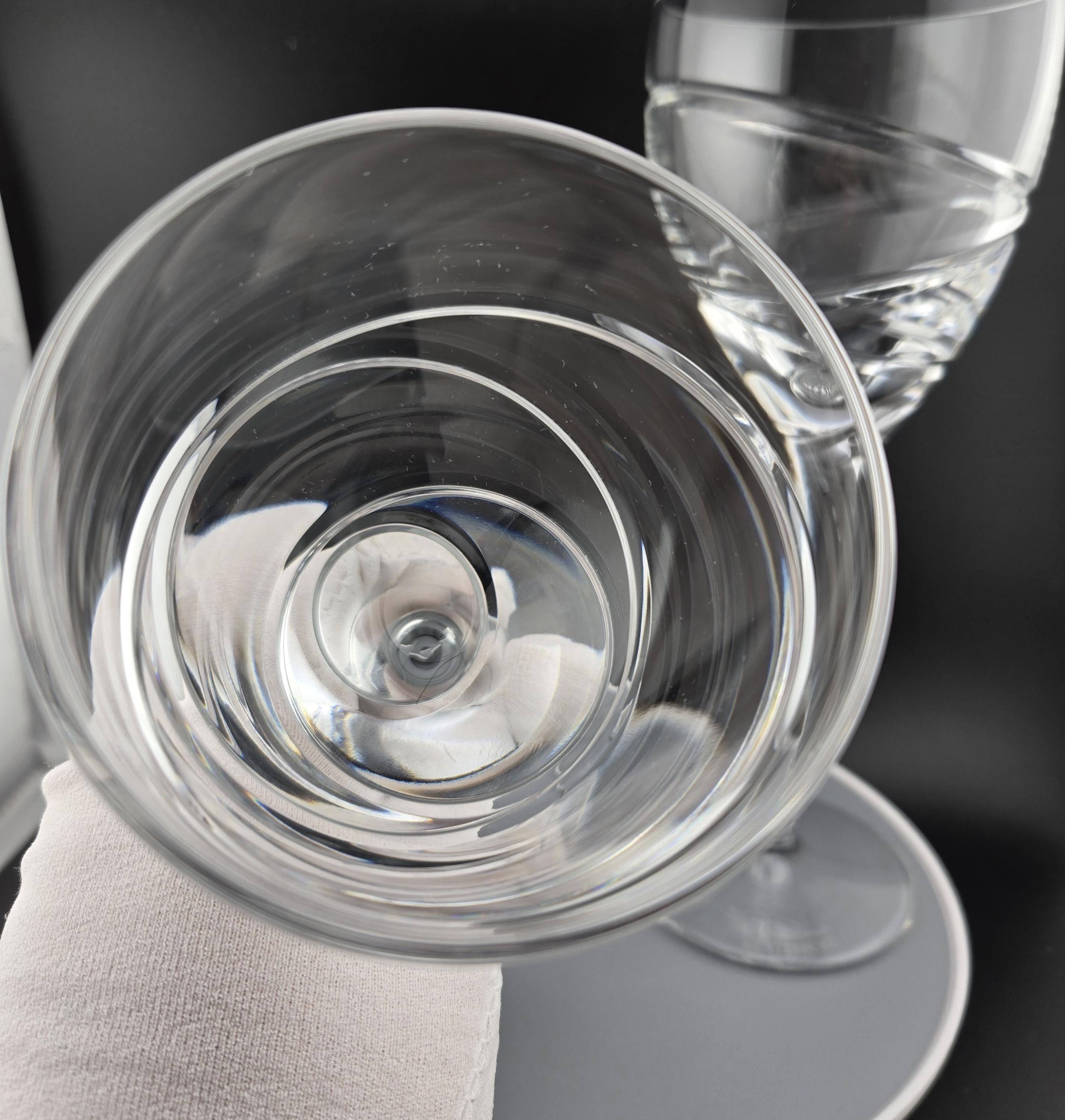 These glasses are ideal for wine, cocktails, or formal entertaining, and their minimalist yet sculptural design complements both modern and traditional table settings. Close inspection shows light surface wear consistent with careful use, with no chips or cracks noted.