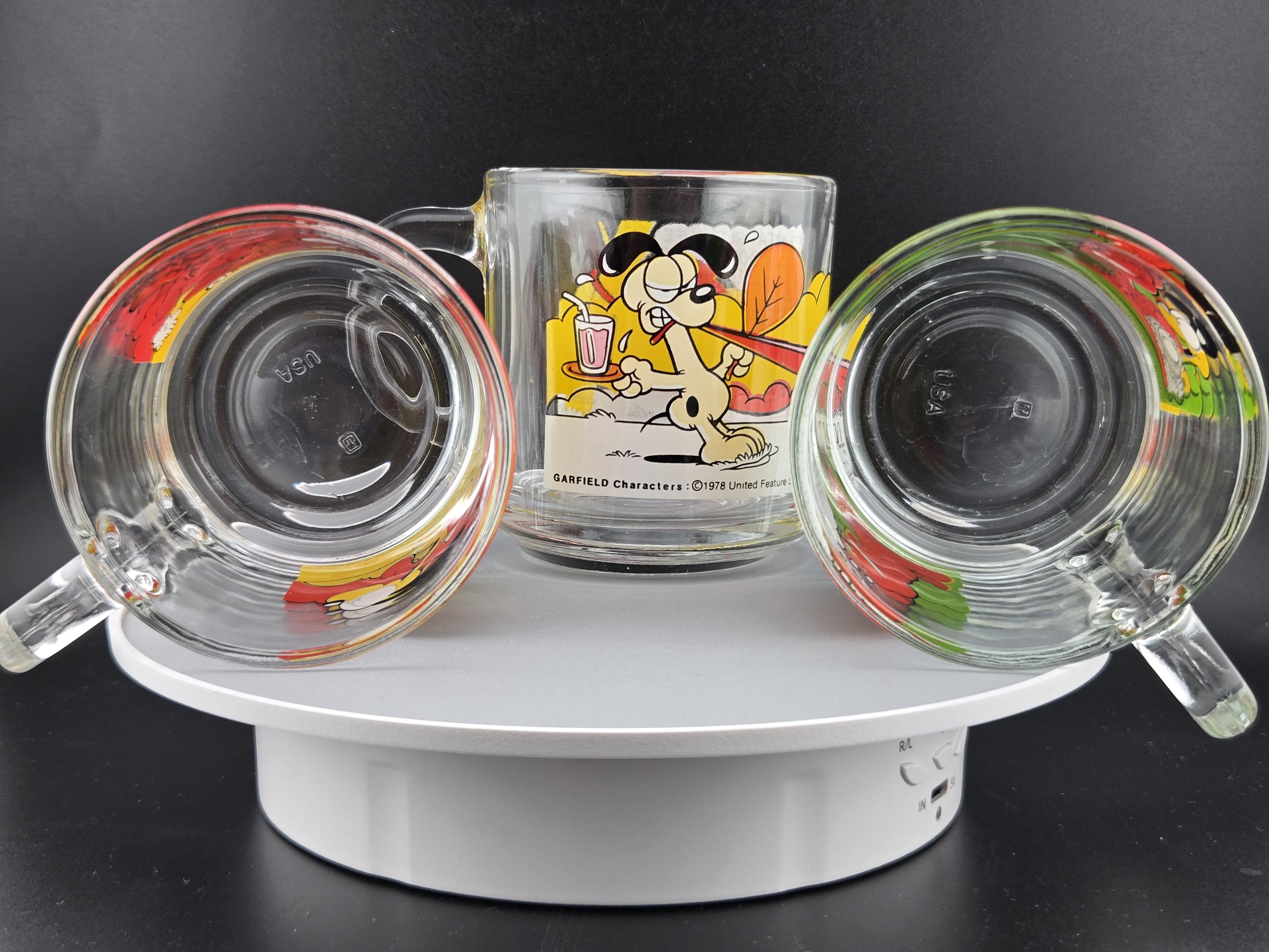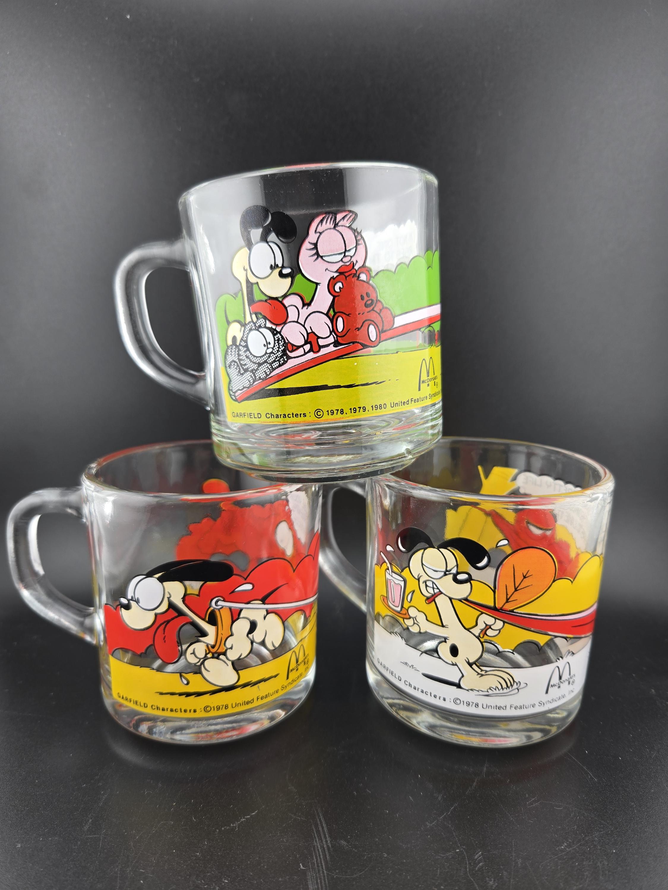 Copyright markings on the glasses reference United Feature Syndicate and date between 1978–1980, confirming their authenticity and vintage status. The artwork remains vibrant, and the glass shows light surface wear consistent with age, with no cracks or chips noted. These mugs display beautifully together and are increasingly sought after by Garfield and McDonald’s memorabilia collectors.