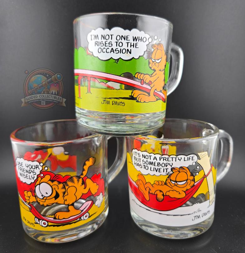 This set of three vintage Garfield glass mugs features beloved artwork from Garfield, created by Jim Davis, and originally released through McDonald’s promotions in the late 1970s to early 1980s.