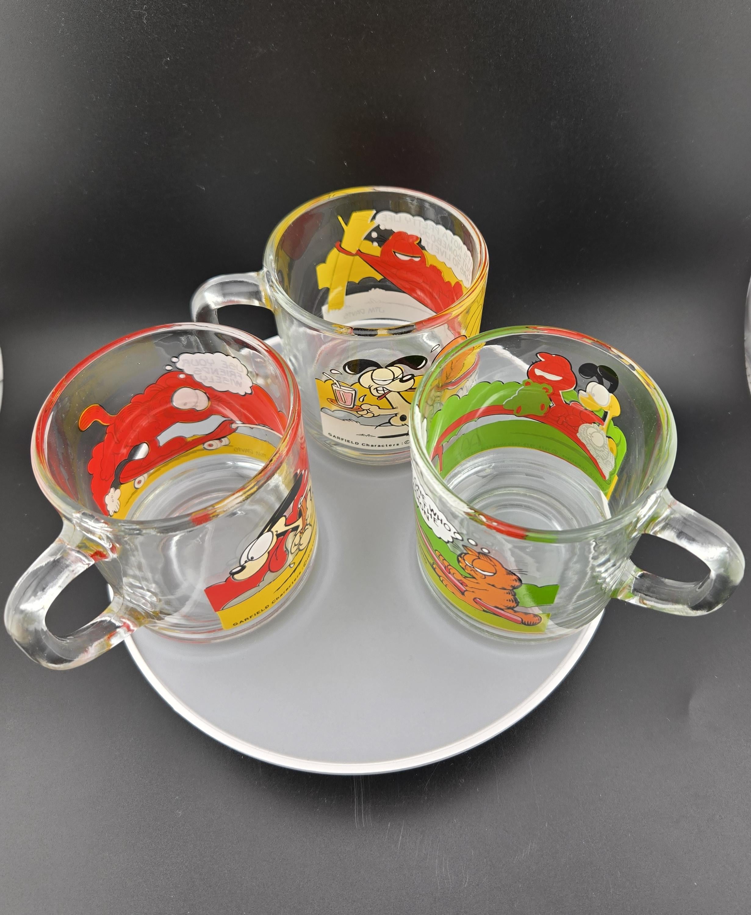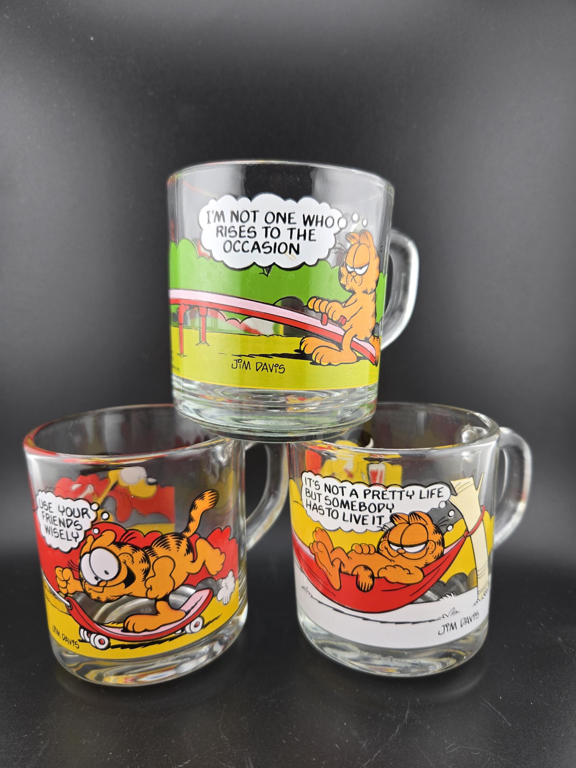 Fun vintage Garfield glass mugs featuring classic Jim Davis comic scenes from the late 1970s — colorful, nostalgic collectibles originally released through McDonald’s.