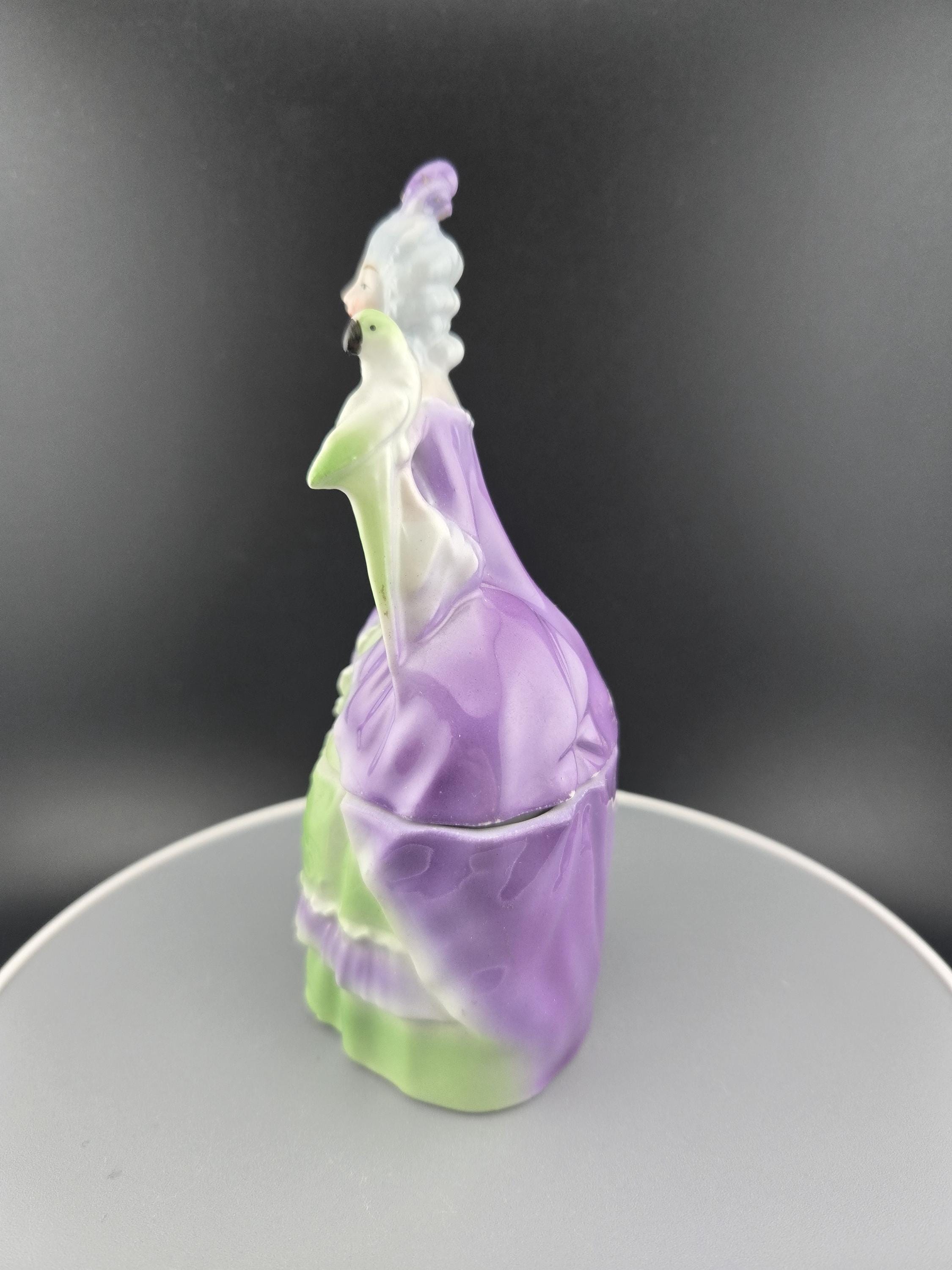 This charming vintage Bavarian porcelain trinket box features an elegant 18th-century–style lady in flowing pastel gowns, accompanied by a delicately modeled parrot perched at her side. Rendered in soft lavender, green, and white tones, this piece reflects the romantic European porcelain tradition Bavaria is well known for.