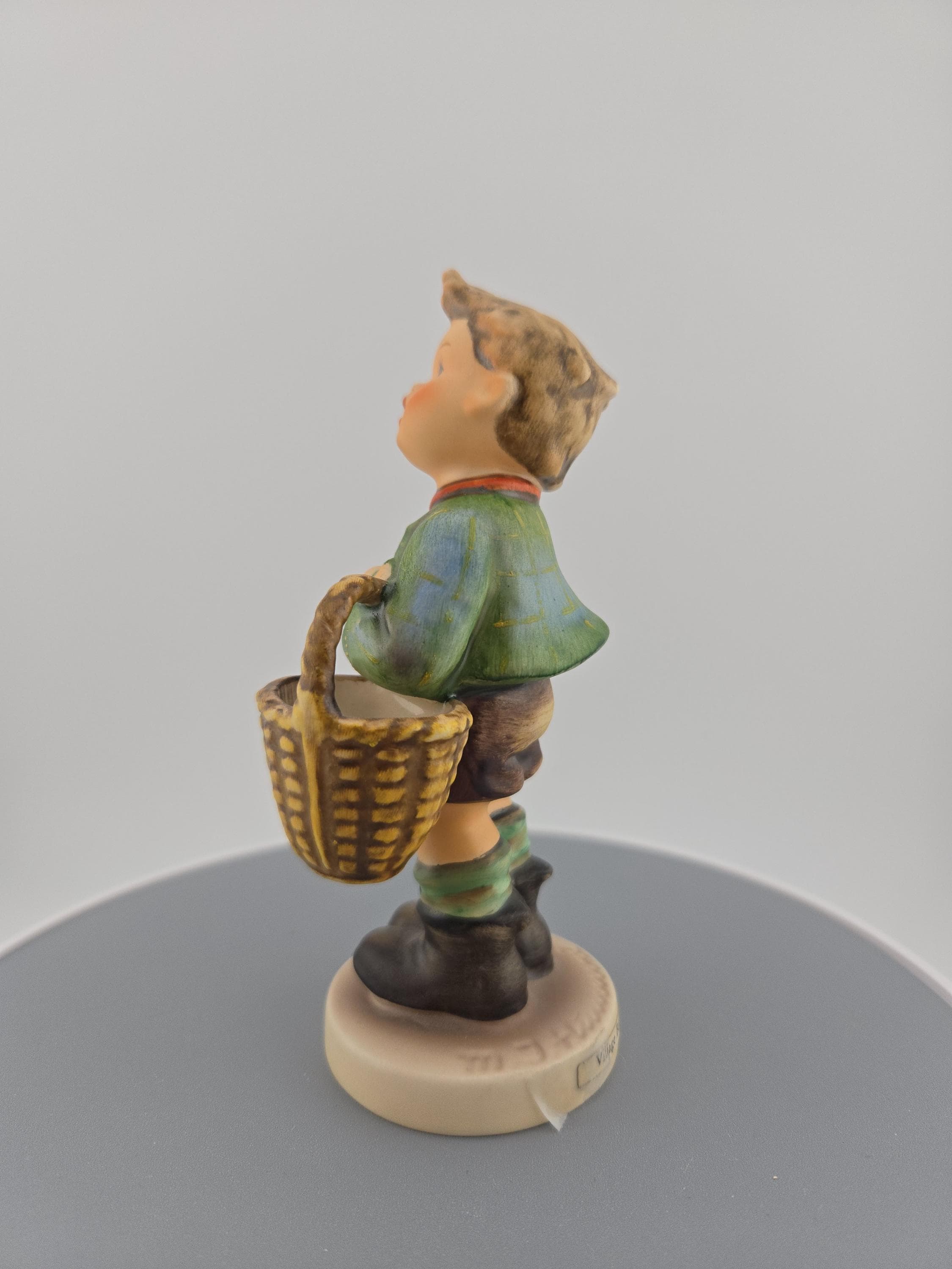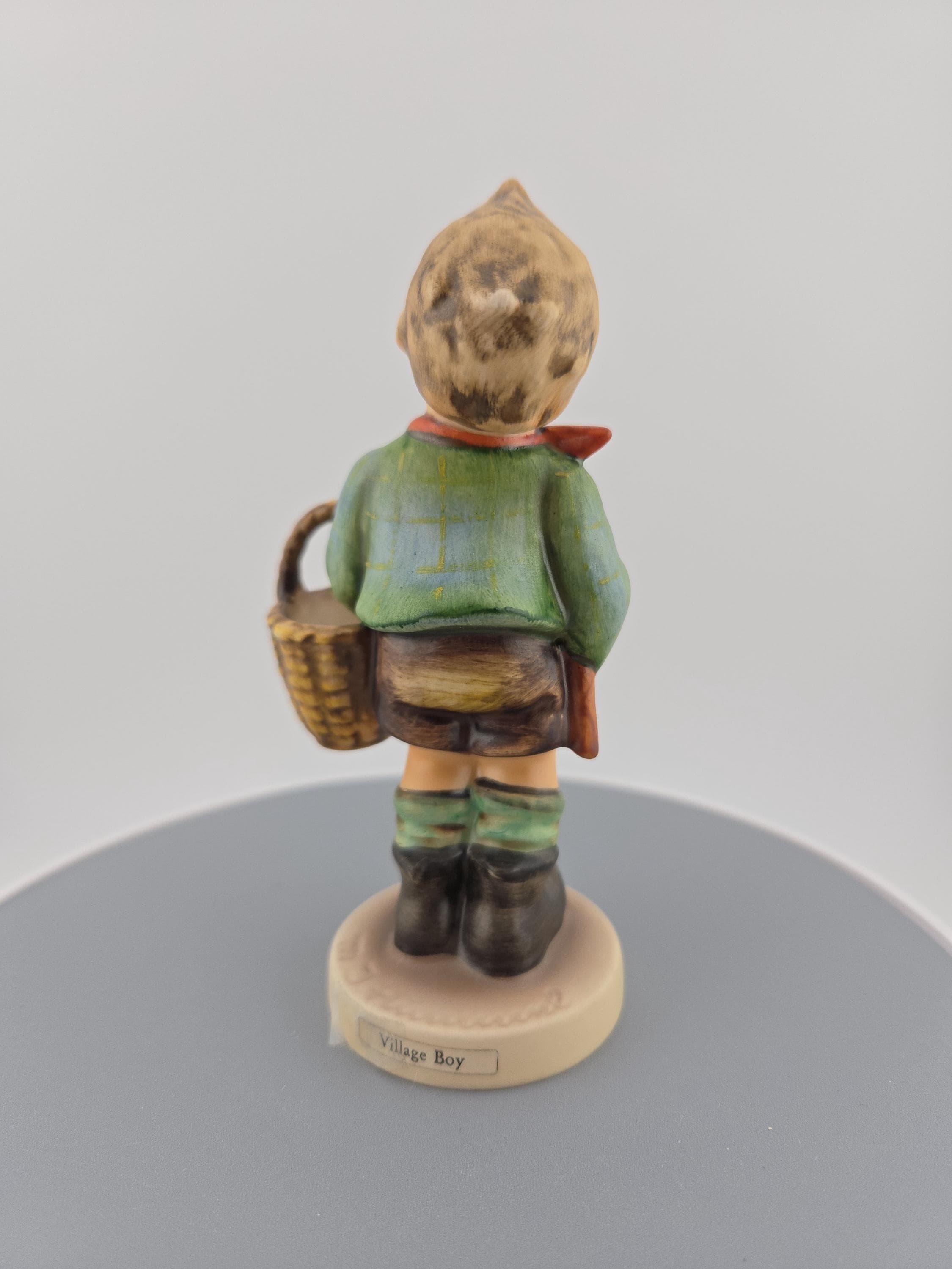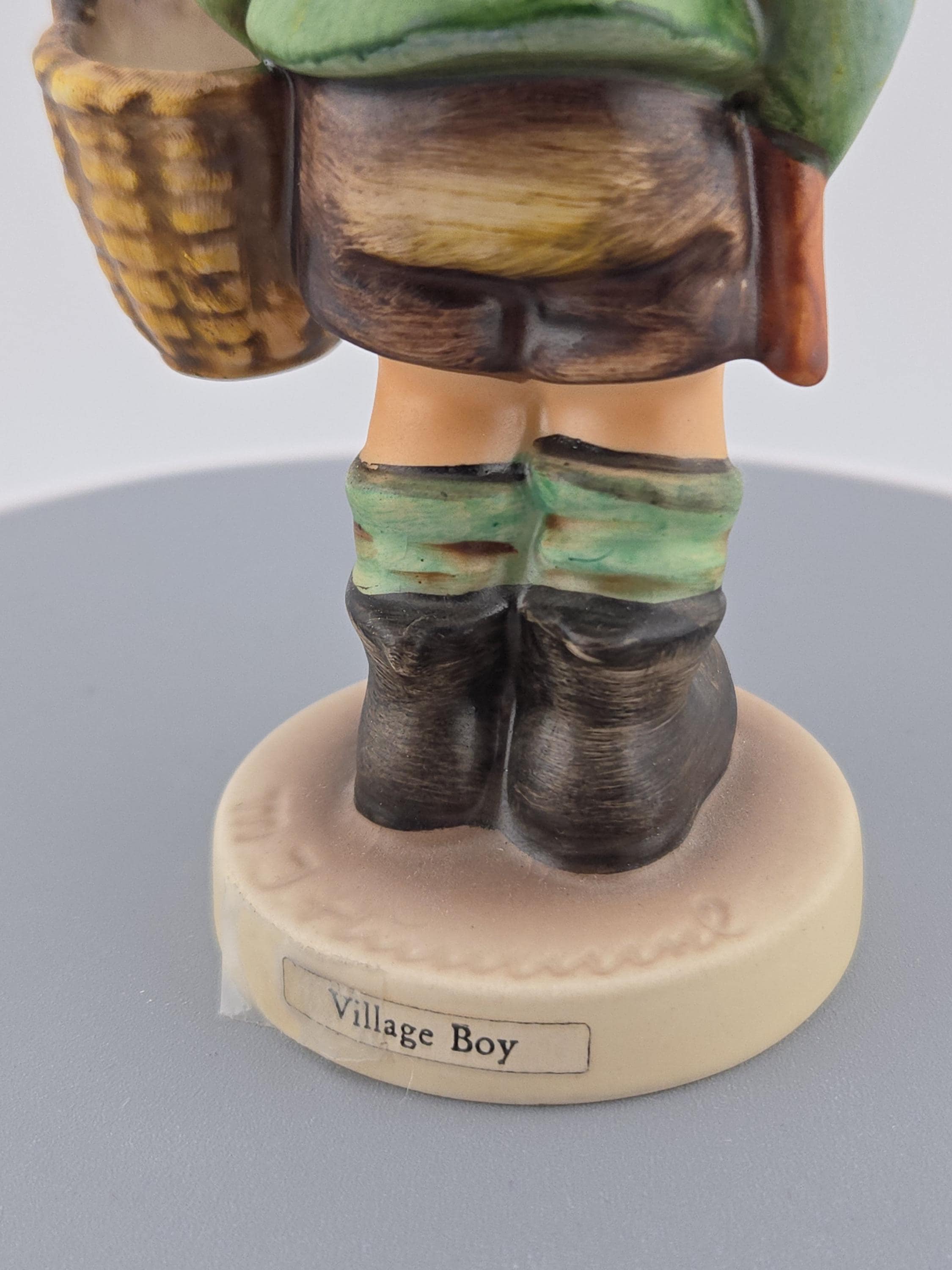 Charming vintage Hummel “Village Boy” figurine by Goebel West Germany, featuring a young boy with basket and scarf — a classic mid-century M.I. Hummel porcelain collectible. This vintage Hummel figurine titled “Village Boy” is a classic example of M.I. Hummel’s timeless storytelling and Goebel’s renowned porcelain craftsmanship. The figure depicts a young boy standing proudly with a woven basket, wearing traditional attire including a green jacket, scarf, short trousers, and sturdy boots — a scene rooted in old-world village life.