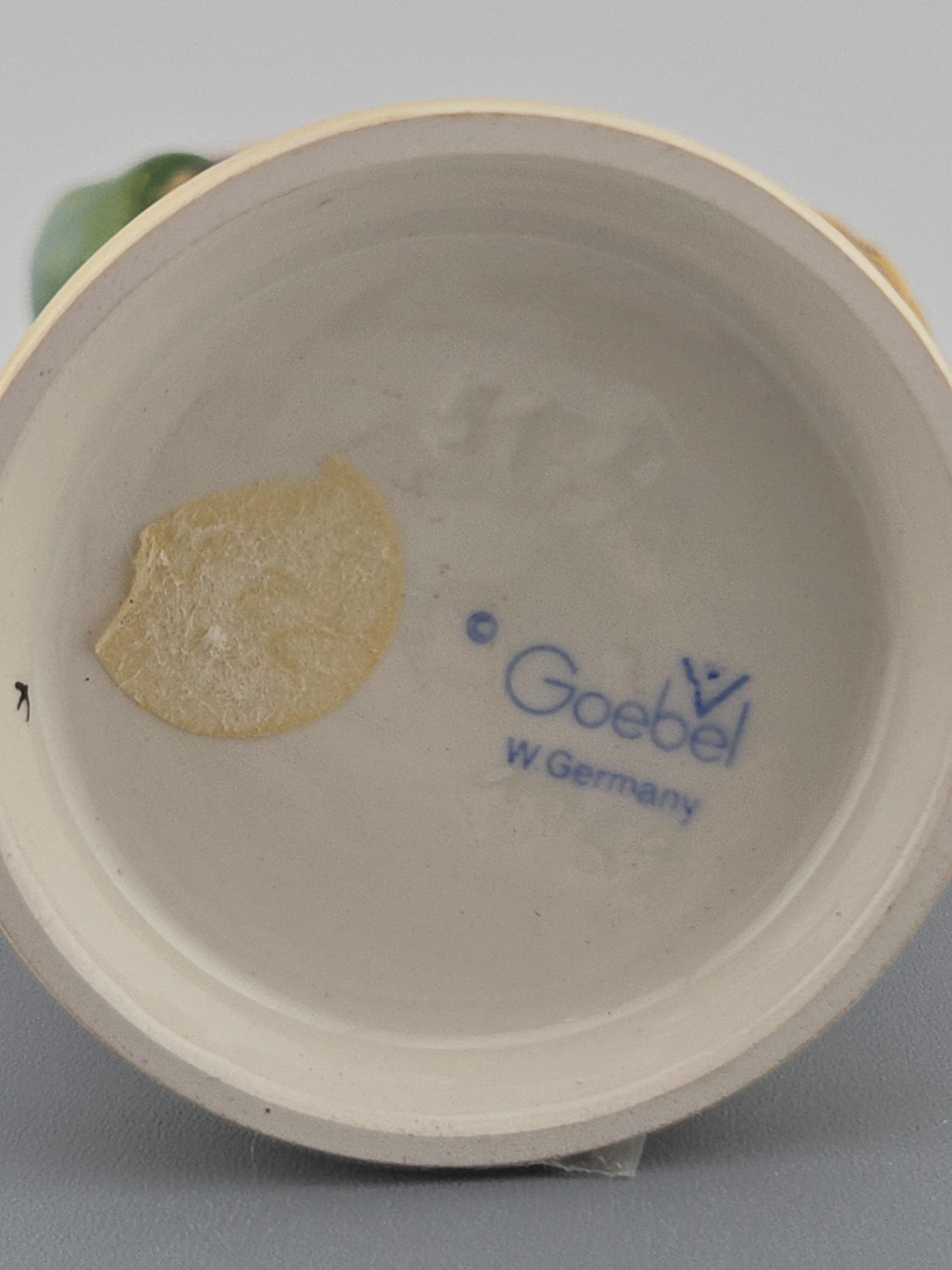 The piece is authentically marked Goebel W. Germany on the base, confirming its genuine mid-century production. A period paper title label reading “Village Boy” remains affixed, further supporting originality and collector appeal. Hand-painted details include soft facial expression, subtle shading in the clothing, and realistic basket texture, all hallmarks of true Goebel Hummel quality.